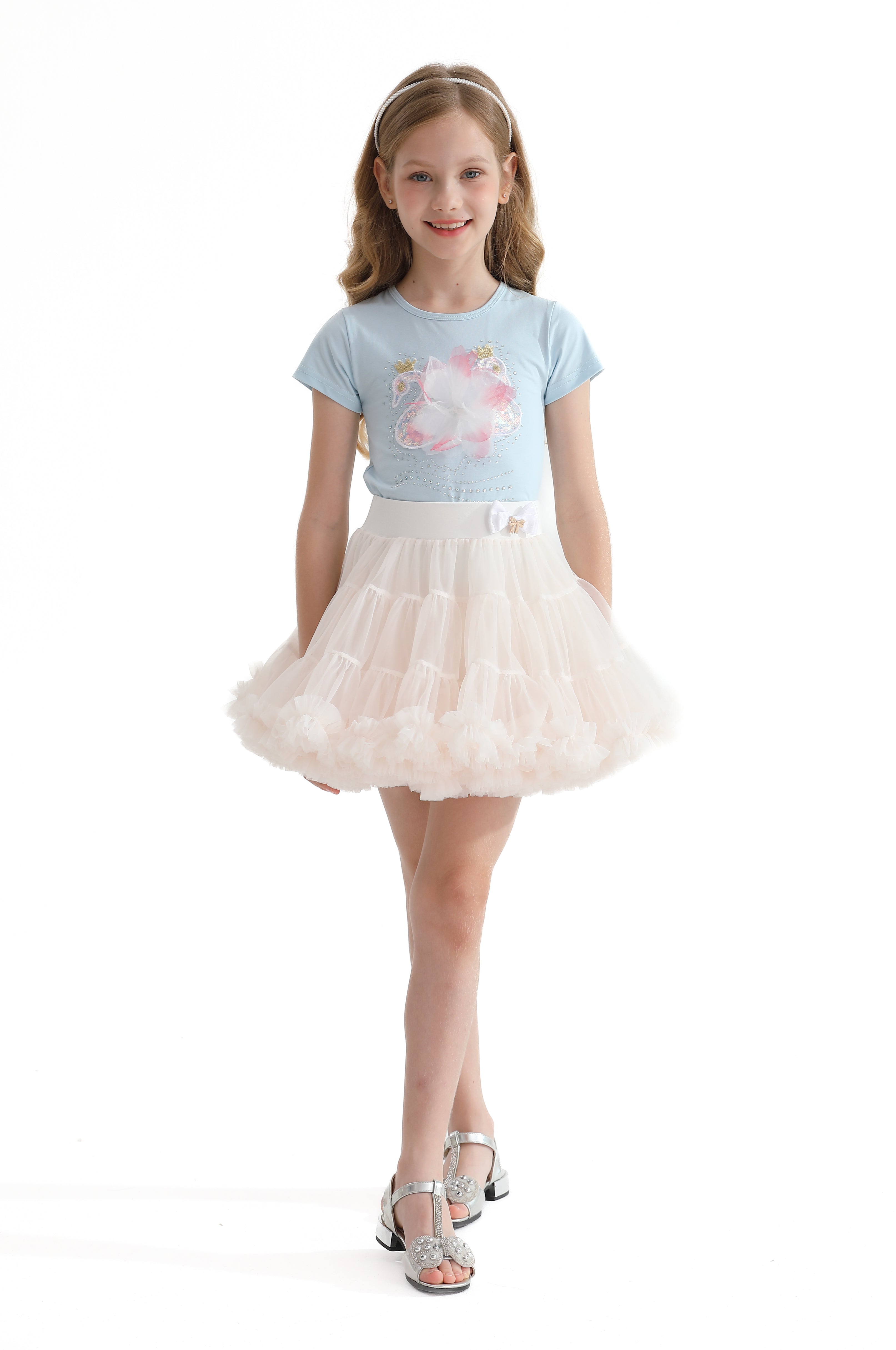 The tutu skirt features a lightweight and voluminous tulle design, perfect for twirling and dancing. The decorative bow applique adds a whimsical element, making the skirt both playful and elegant. The elasticated waistband ensures a comfortable and secure fit, allowing for ease of movement.
