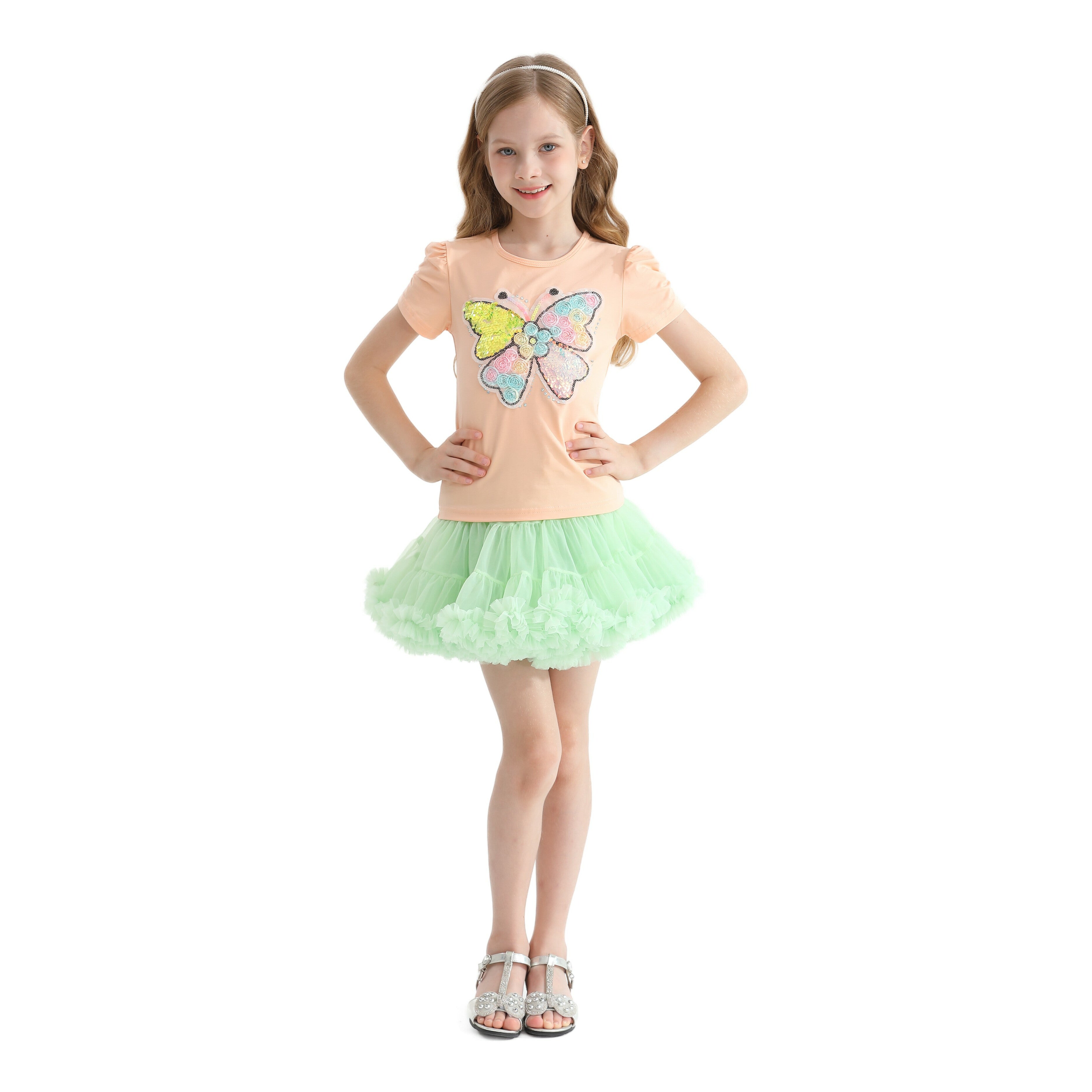Multicolor Selena butterfly skirt outfit for kid and baby girls from Mimi Tutu. This pink orange soft cotton tee features a captivating butterfly rainbow gem applique, bringing a splash of color and sparkle to the outfit. The round neck ensures a comfortable and classic fit, while the short puff shoulders add a playful and charming detail.