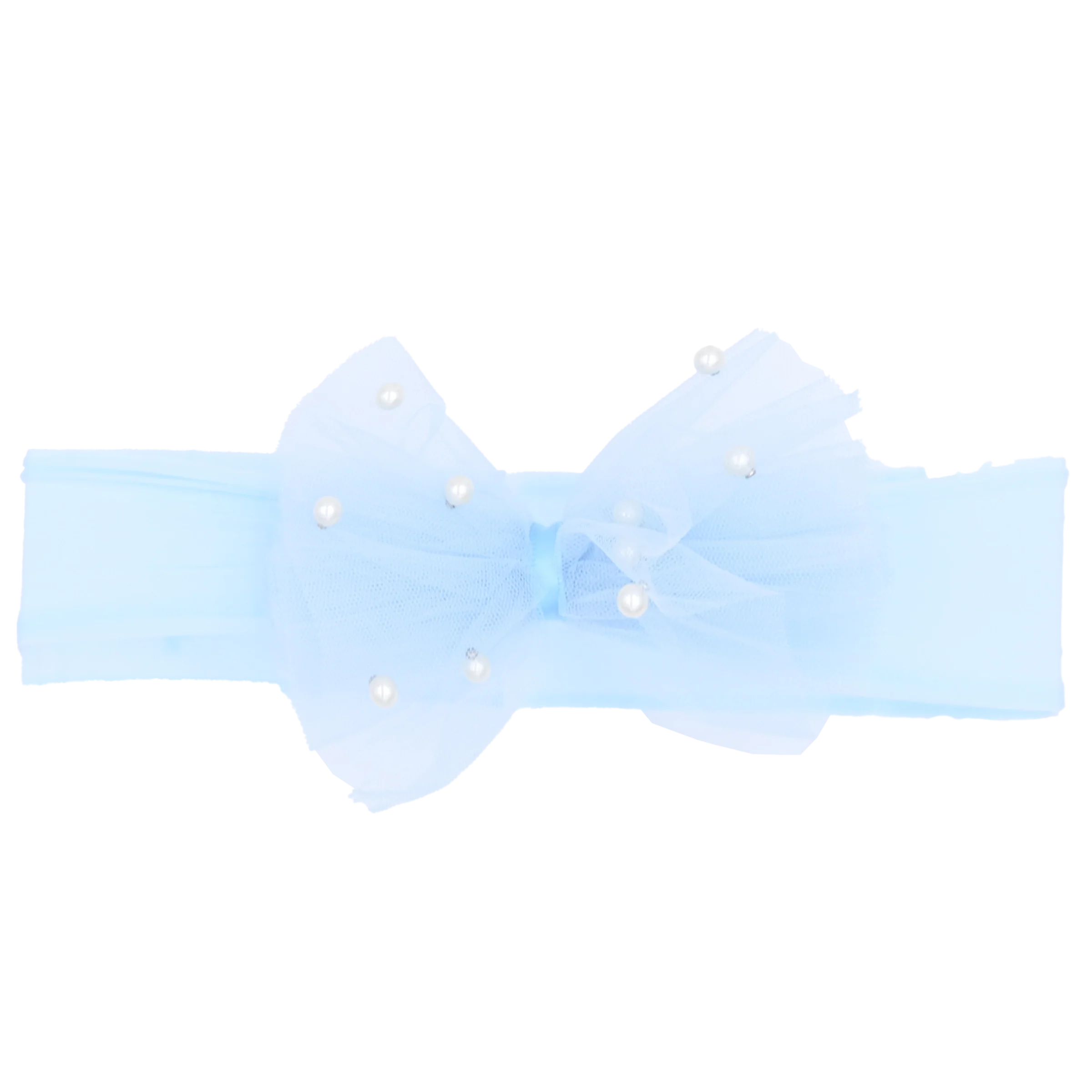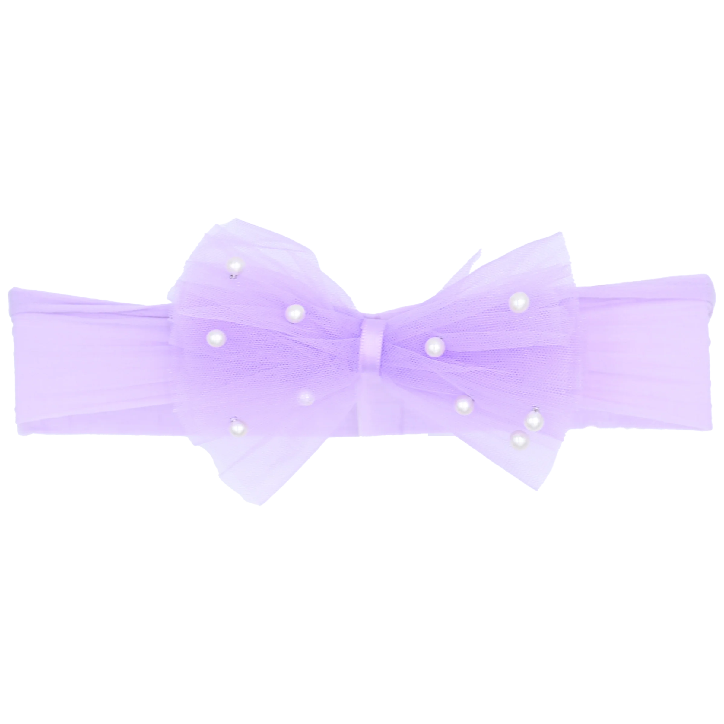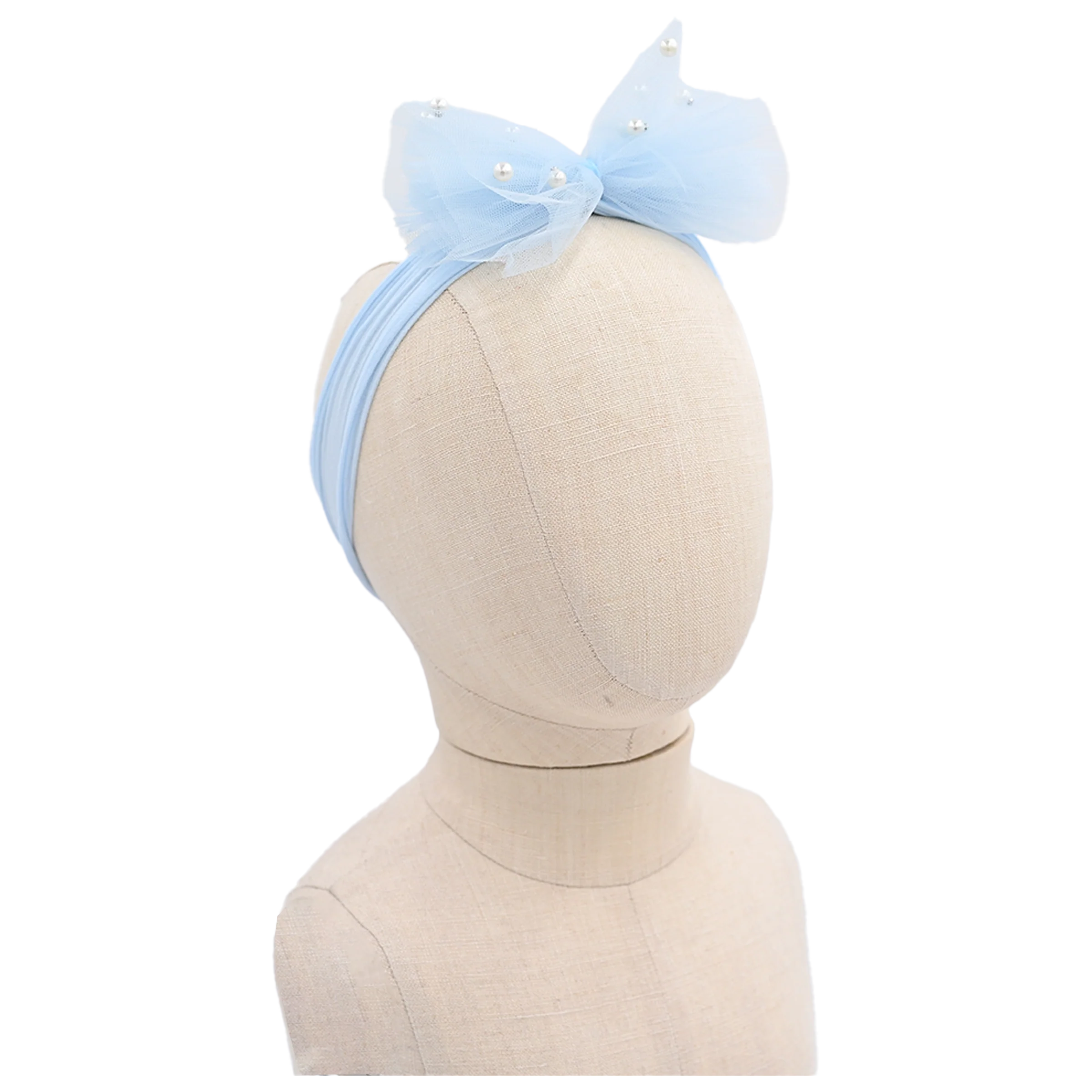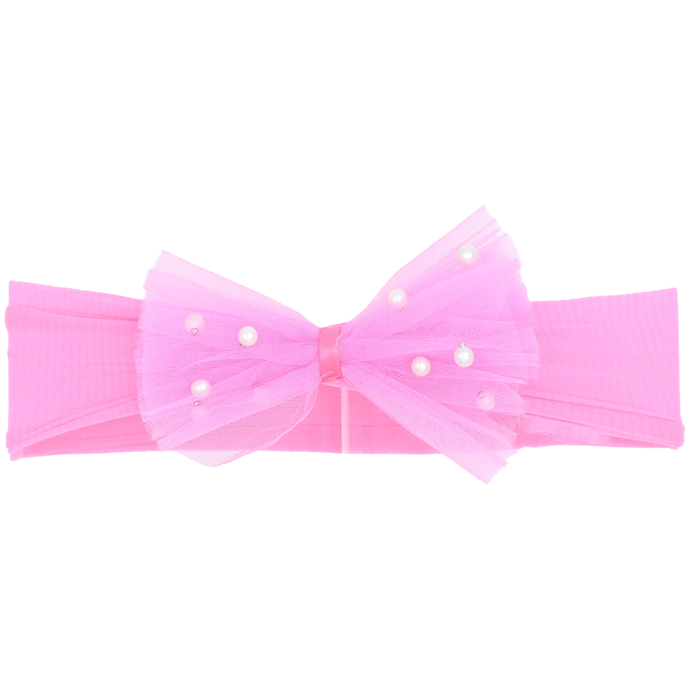 Crafted with a delicate tulle ribbon and adorned with pearl accents, this headband offers a soft, whimsical aesthetic that enhances both casual and special occasion outfits. Available in six vibrant and pastel hues—including pink, peach, hot pink, blue, yellow, and lavender—it adds a delightful pop of color to any ensemble.