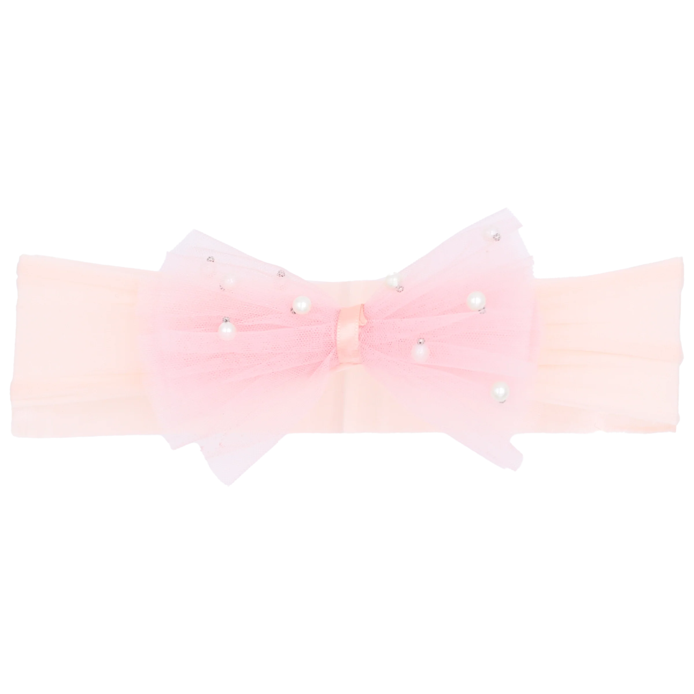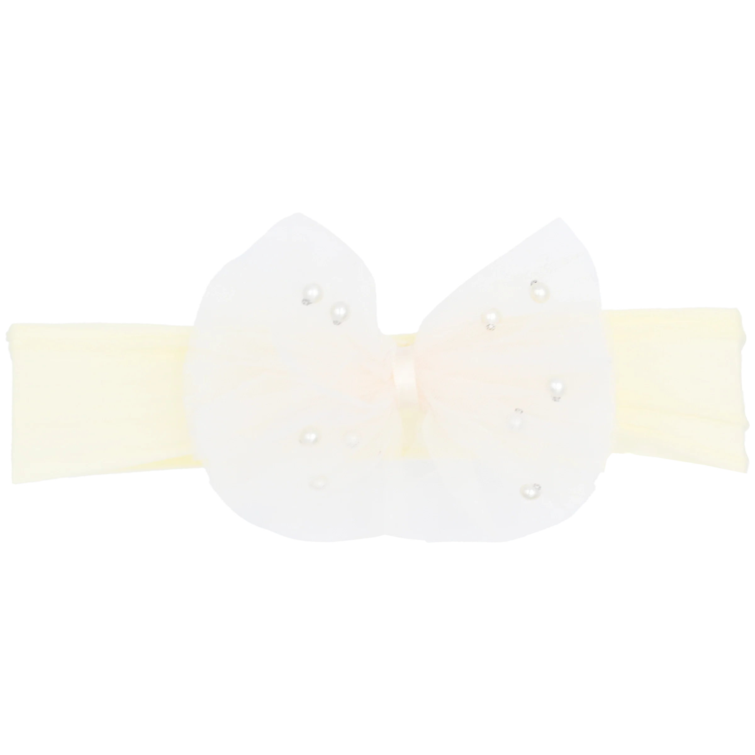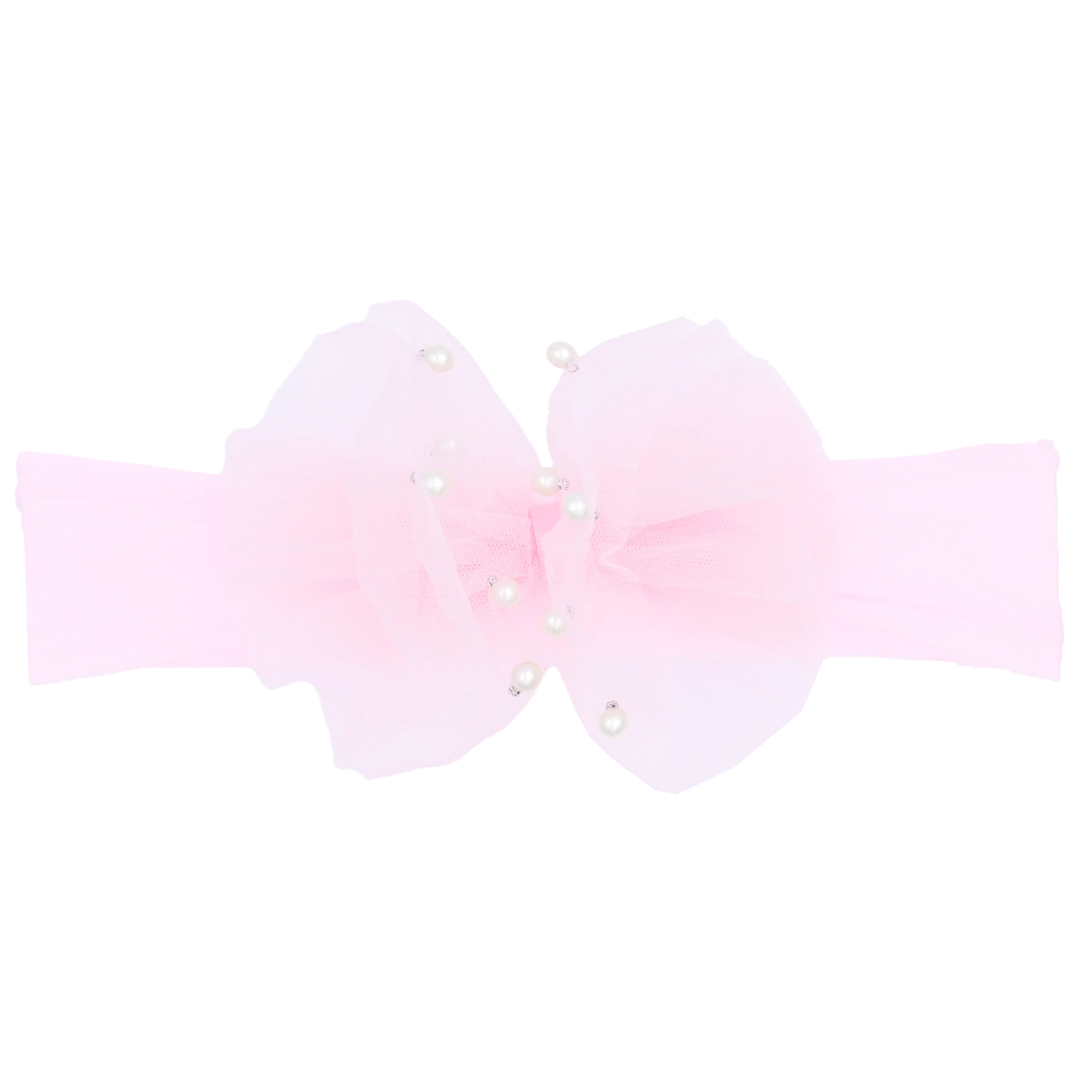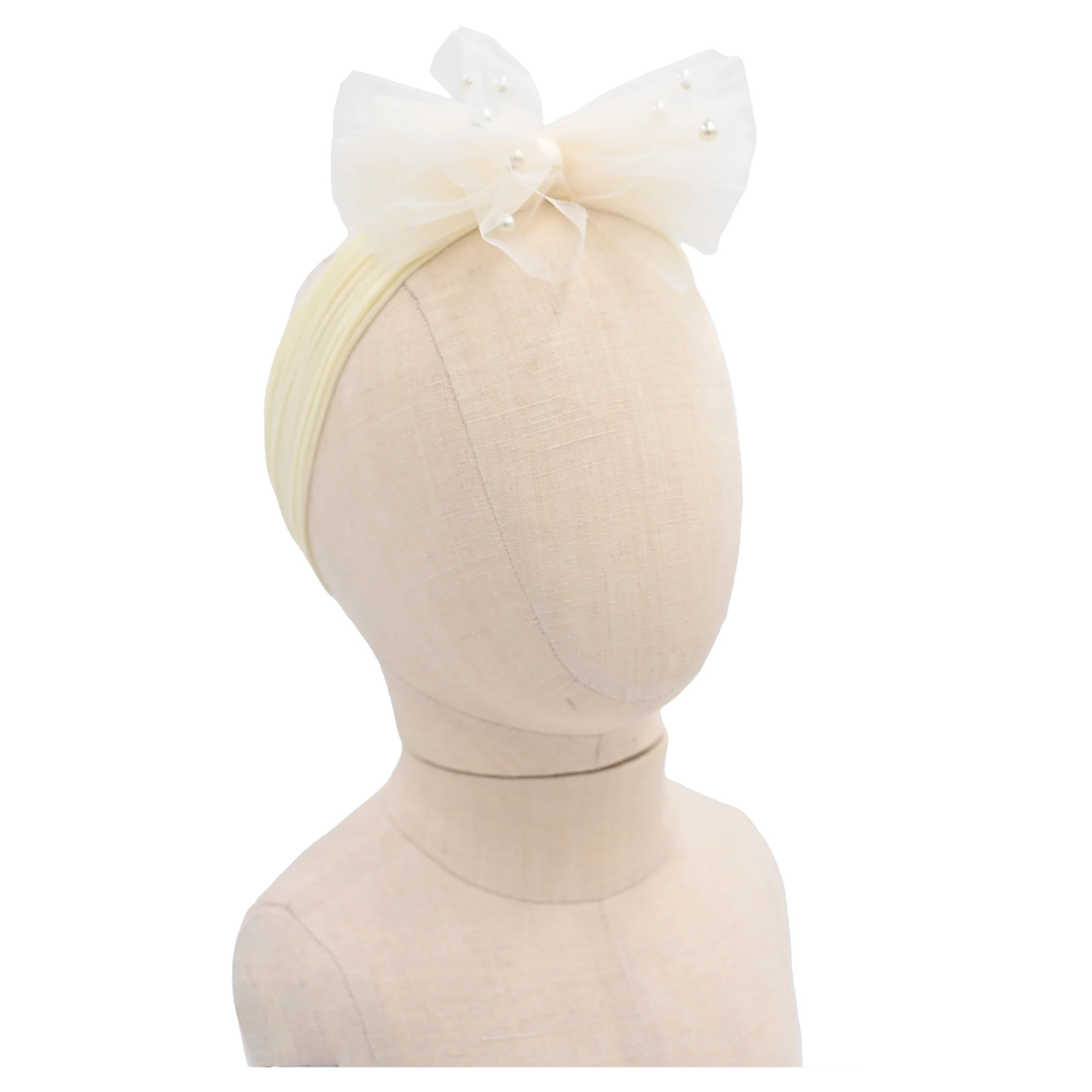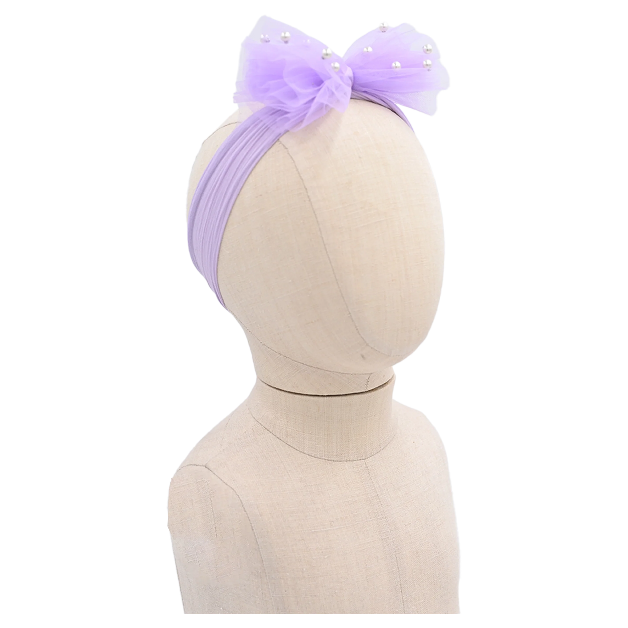 Crafted with a delicate tulle ribbon and adorned with pearl accents, this headband offers a soft, whimsical aesthetic that enhances both casual and special occasion outfits. Available in six vibrant and pastel hues—including pink, peach, hot pink, blue, yellow, and lavender—it adds a delightful pop of color to any ensemble.