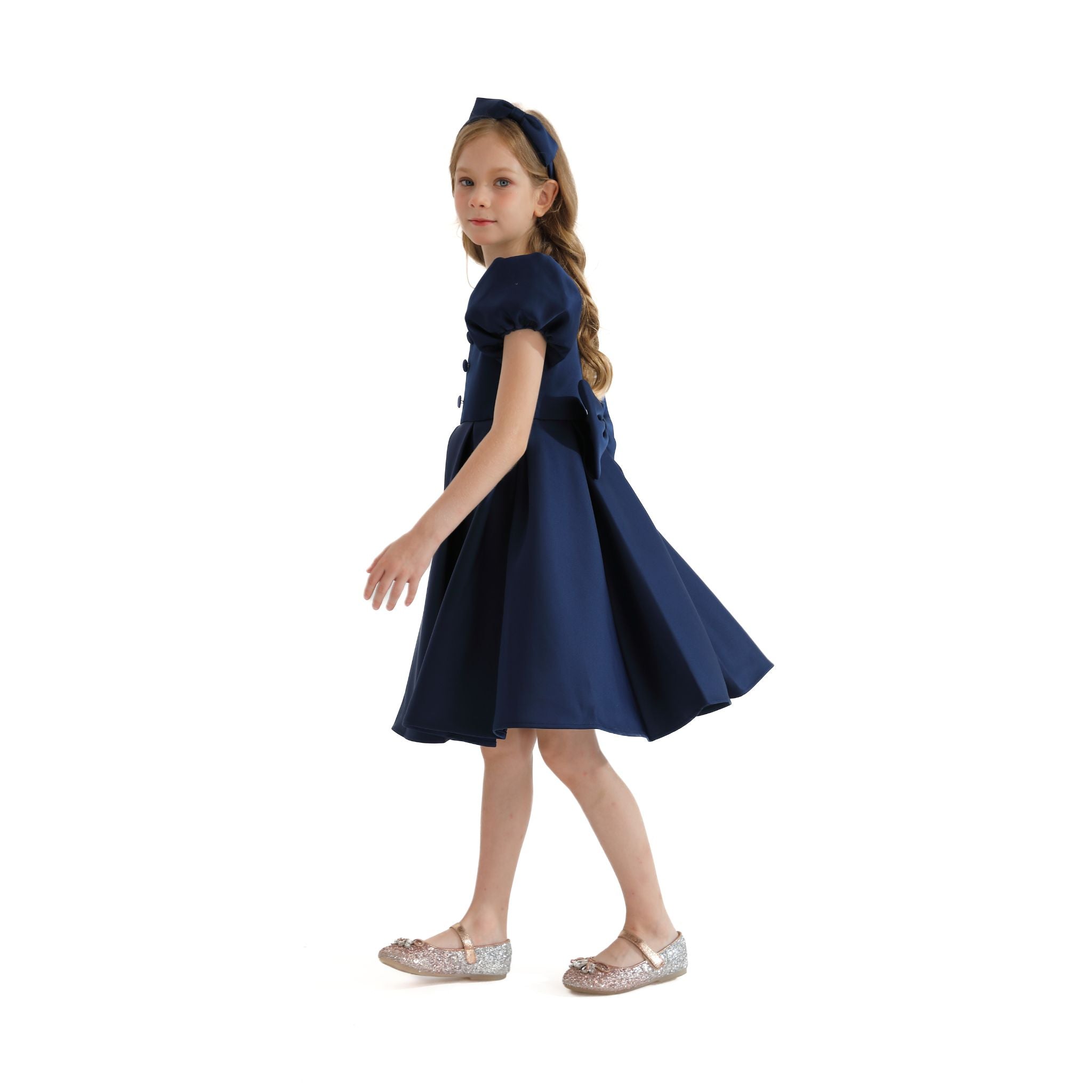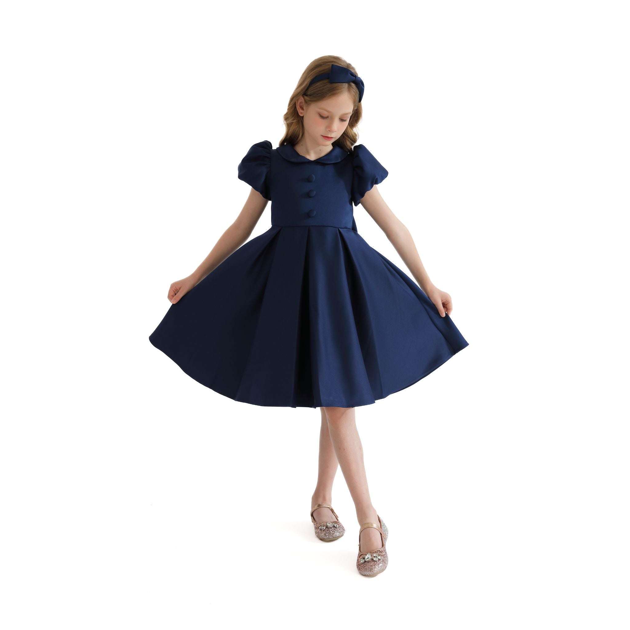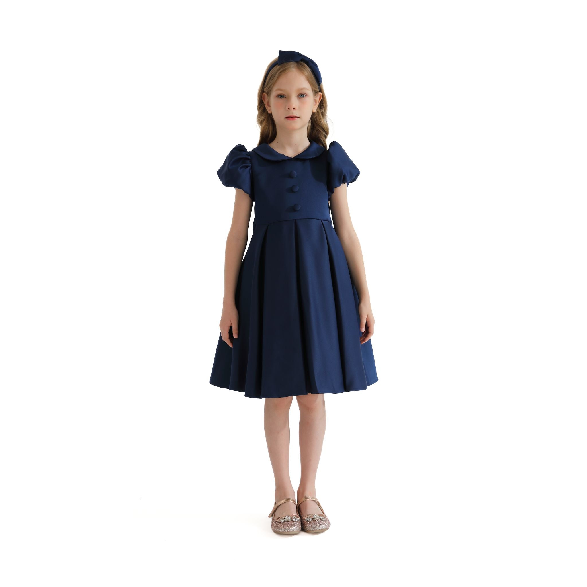 The Navy Barrymore Teacup Button Dress for kid girls from Tulleen is an elegant and timeless choice for any special occasion. This dress features a sophisticated puff shoulder bodice that adds a touch of vintage-inspired charm. Firstly, the dress includes a classic collar and three pseudo buttons, enhancing its refined appearance.