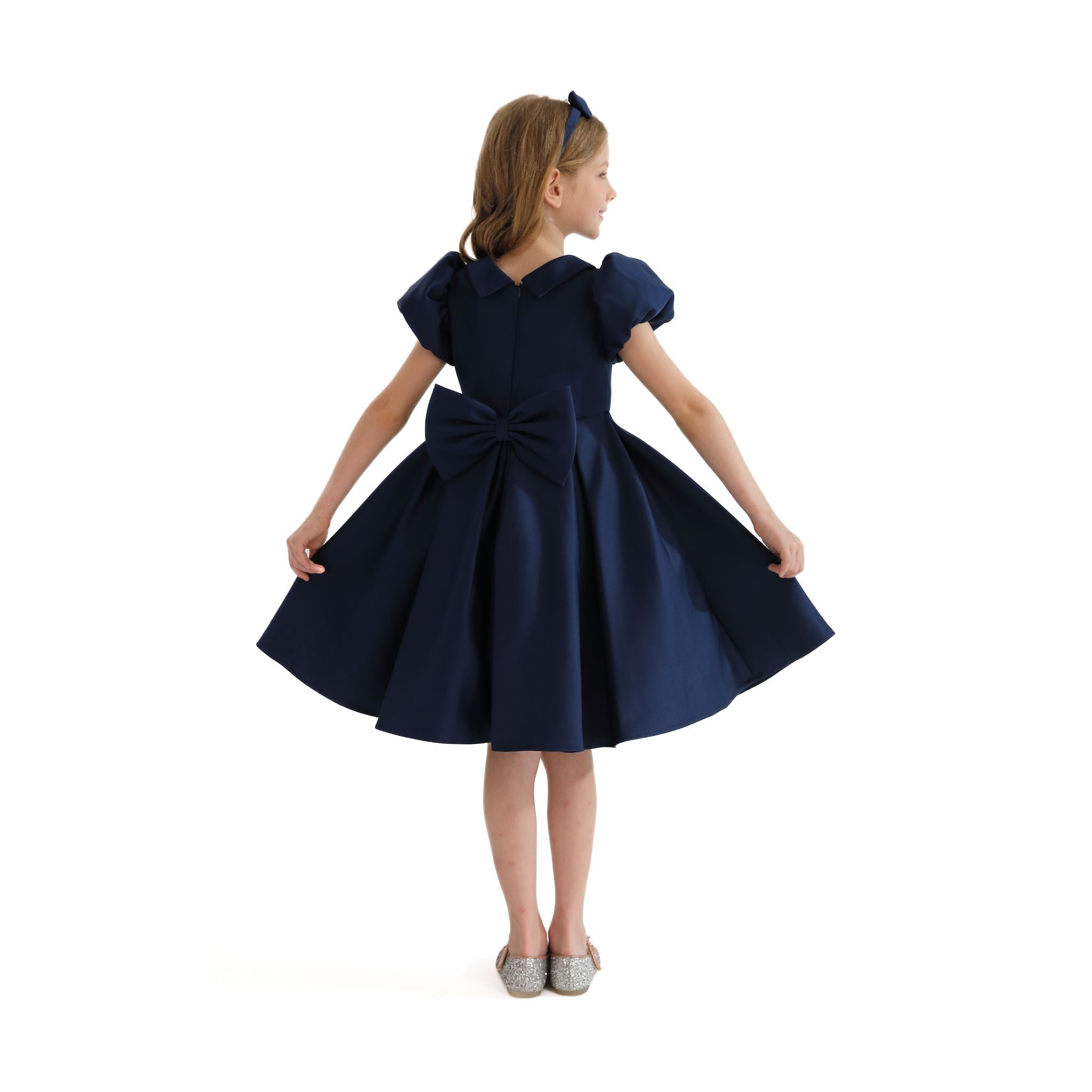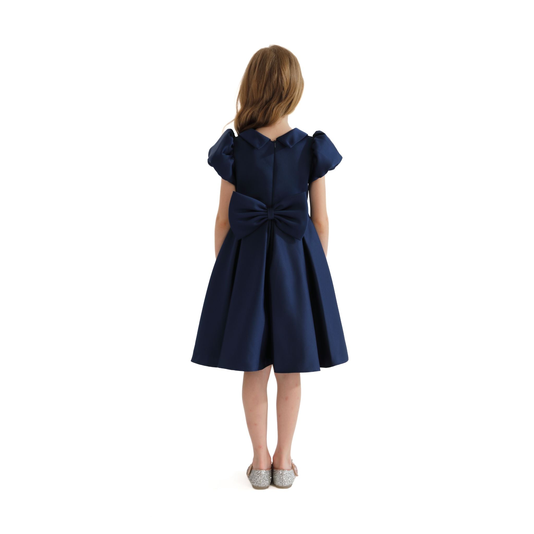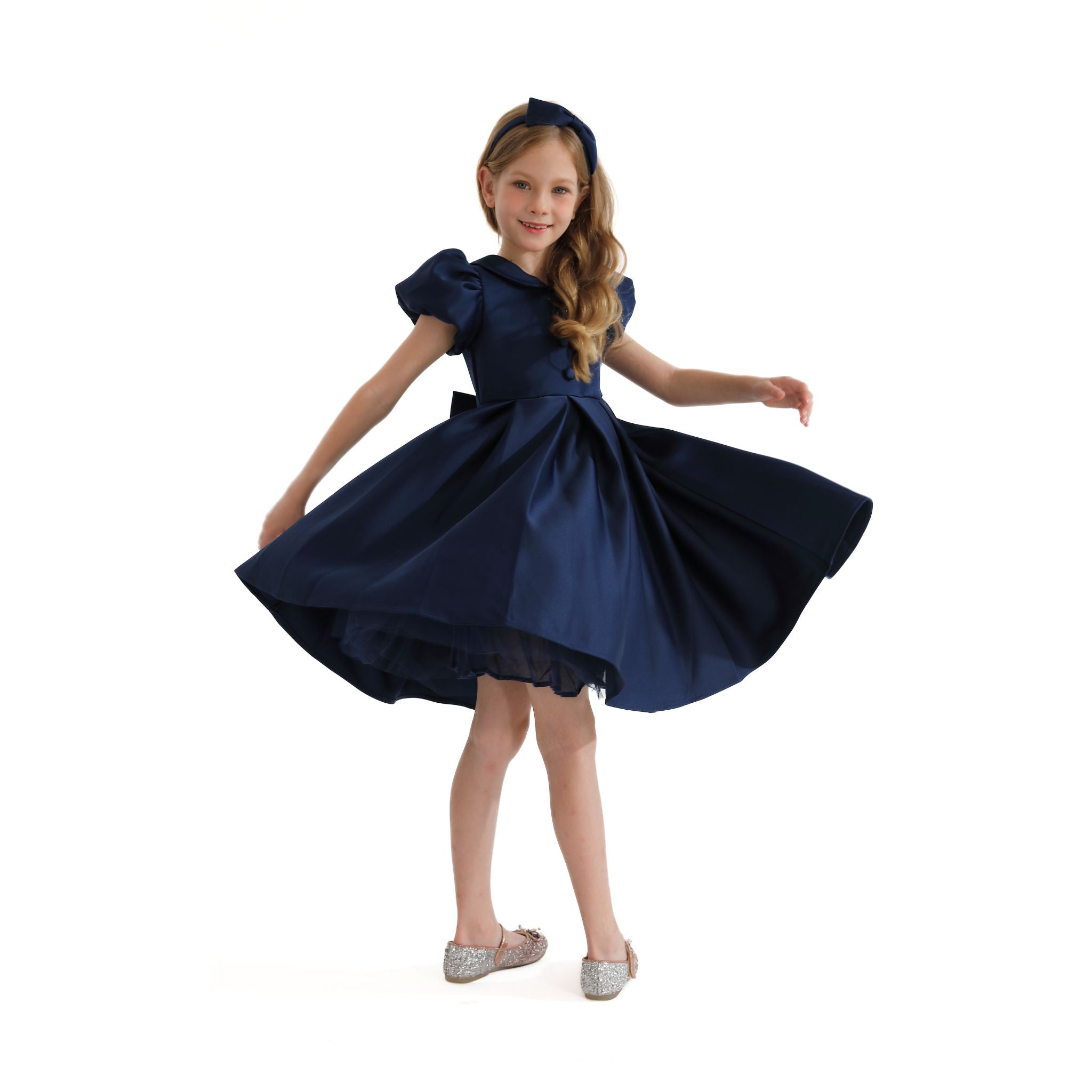 The Navy Barrymore Teacup Button Dress for kid girls from Tulleen is an elegant and timeless choice for any special occasion. This dress features a sophisticated puff shoulder bodice that adds a touch of vintage-inspired charm. Firstly, the dress includes a classic collar and three pseudo buttons, enhancing its refined appearance.