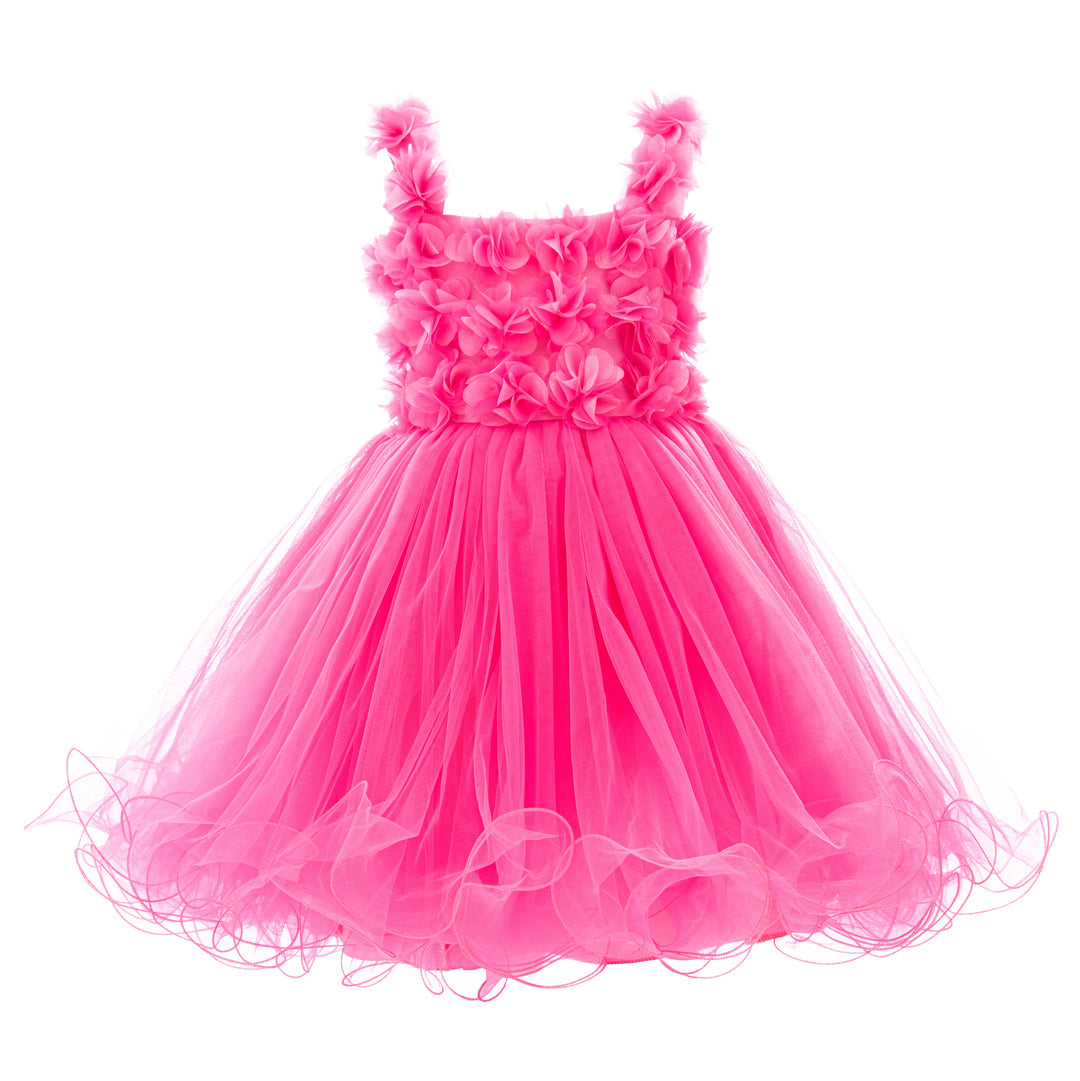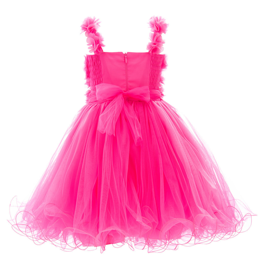 The Neon Pink Rose Campanula Dress for kid and baby girls from Tulleen is a vibrant and eye-catching choice for any special occasion.