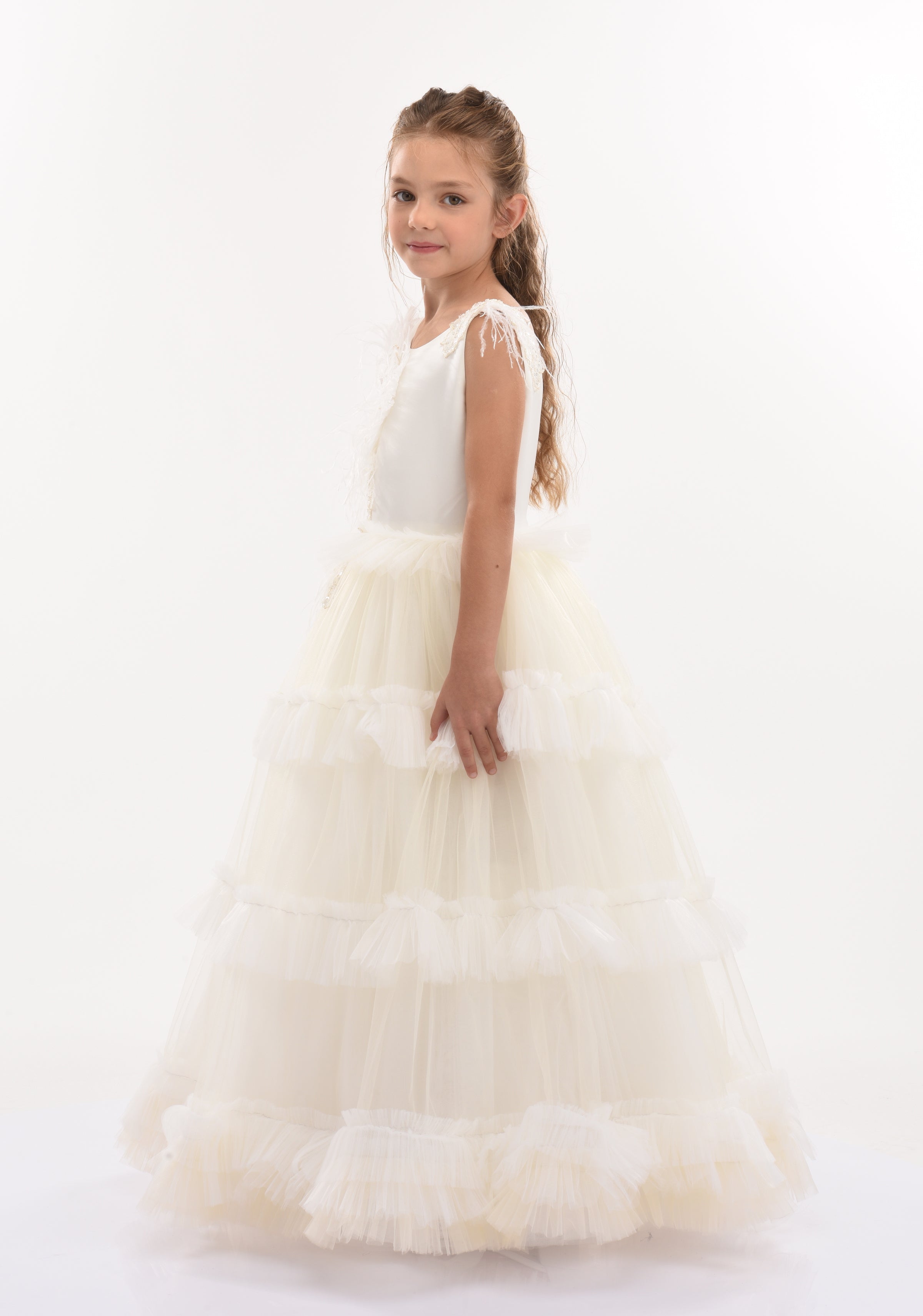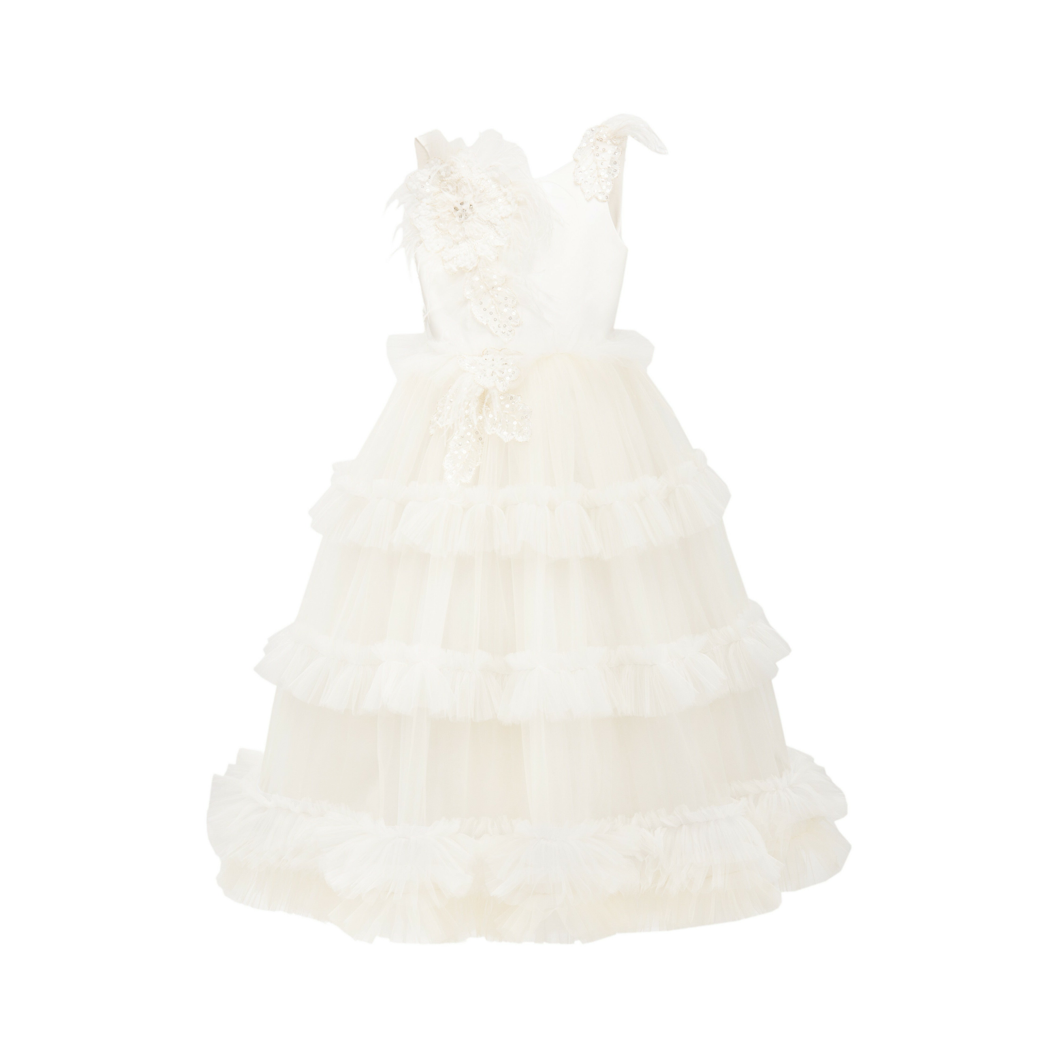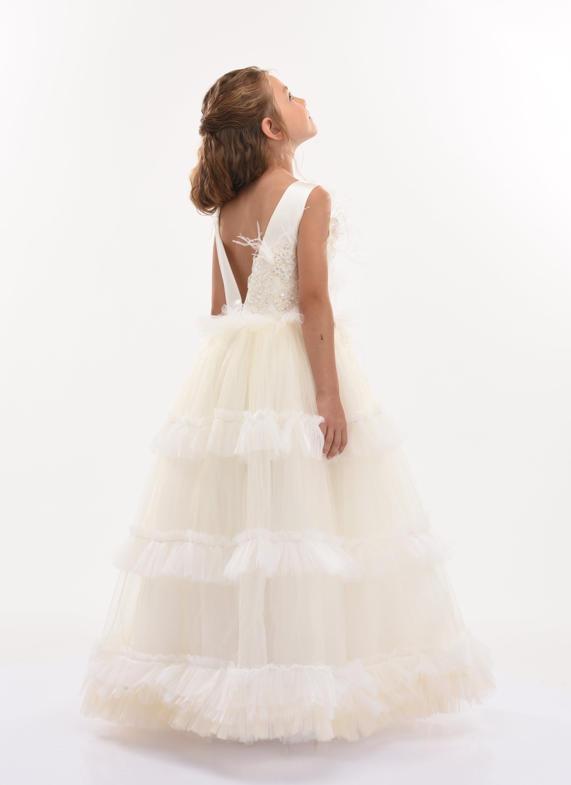 Delicate and elegant much like the flower, you'll be entranced by the Jasmine dress for young girls by Tulleen. The bodice of the Jasmine dress is adorned with these exquisite floral embellishments, adding a touch of whimsy and sophistication. The combination of tulle, sequins, and lace creates a multi-dimensional effect, catching the light and creating a beautiful shimmer. This dress is versatile and suitable for various occasions. It would be perfect as a flower girl dress, adding a touch of grace and beauty to any wedding. It is also suitable for a communion or as a birthday girl dress, making your little one feel extra special on her special day. Additionally, it can be a fantastic option for extravagant dress-up play, allowing your child's imagination to run wild. The skirt of the Jasmine dress features tulle ruffles that wrap around in rings, adding movement and volume. Combined with a crinoline petticoat, the dress creates an elegant form that flatters every little princess. The combination of the ruffles and petticoat adds a touch of drama and creates a truly princess-like silhouette.