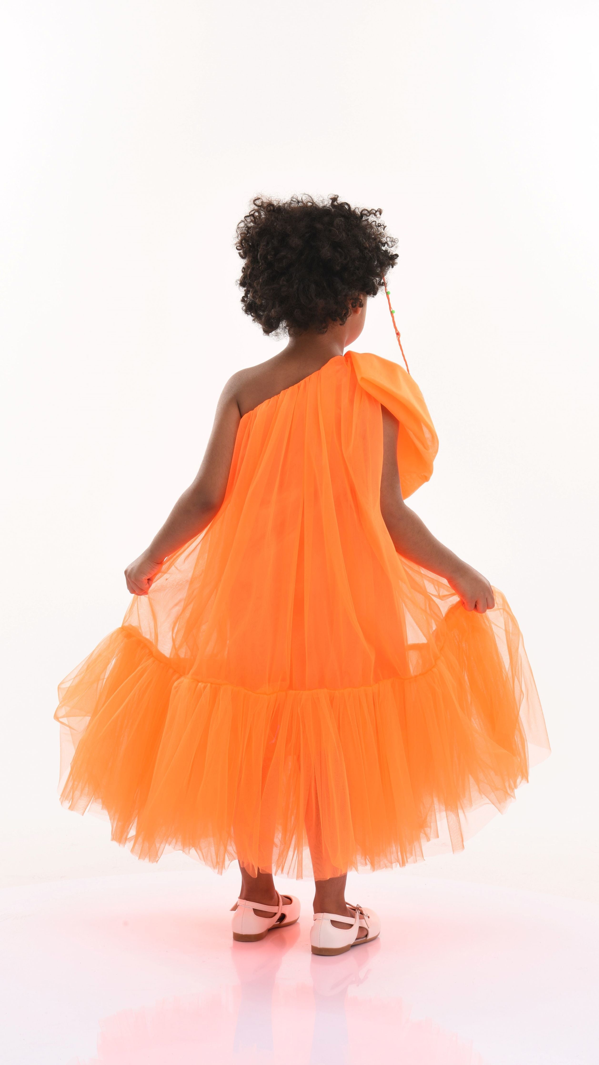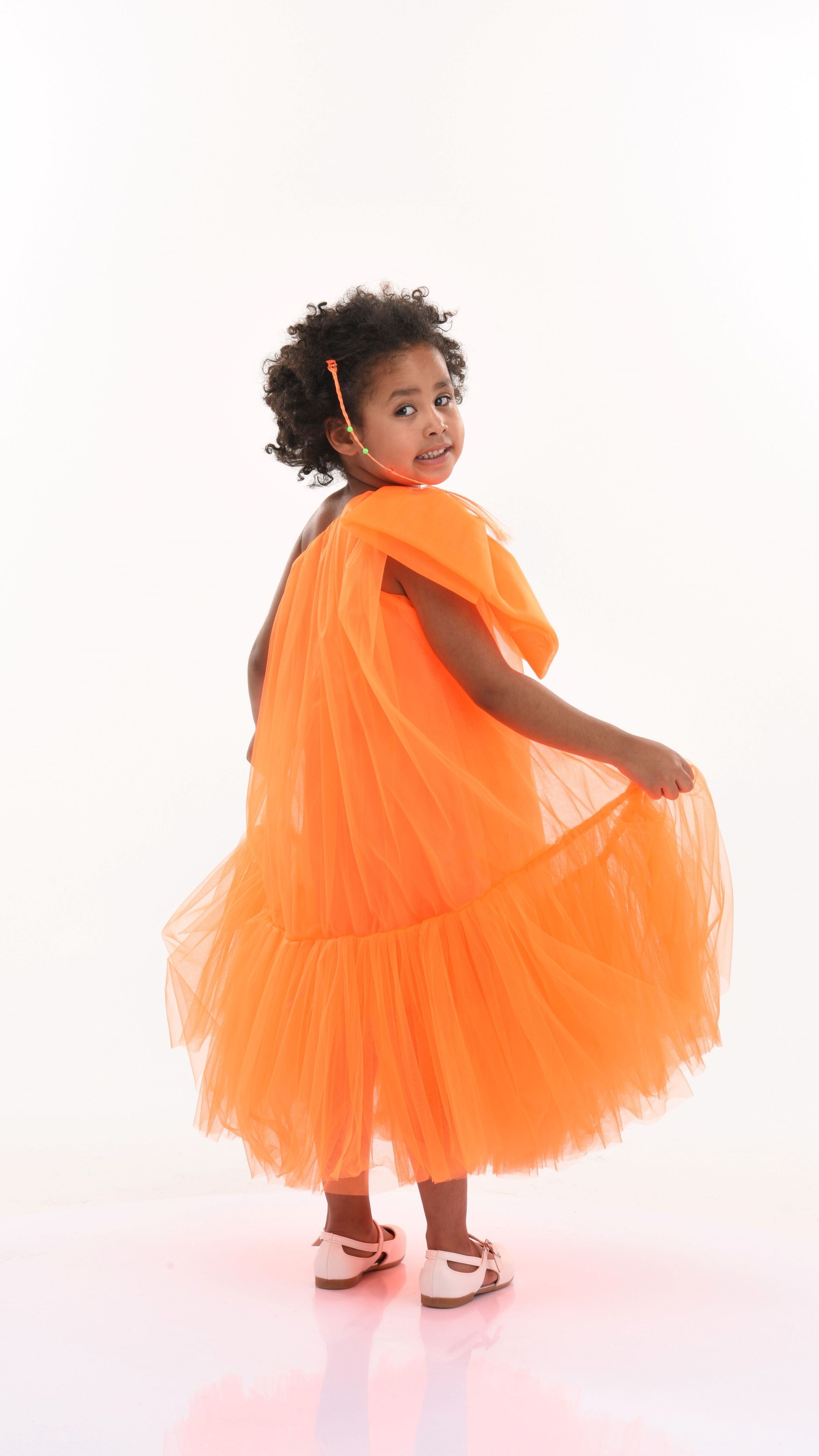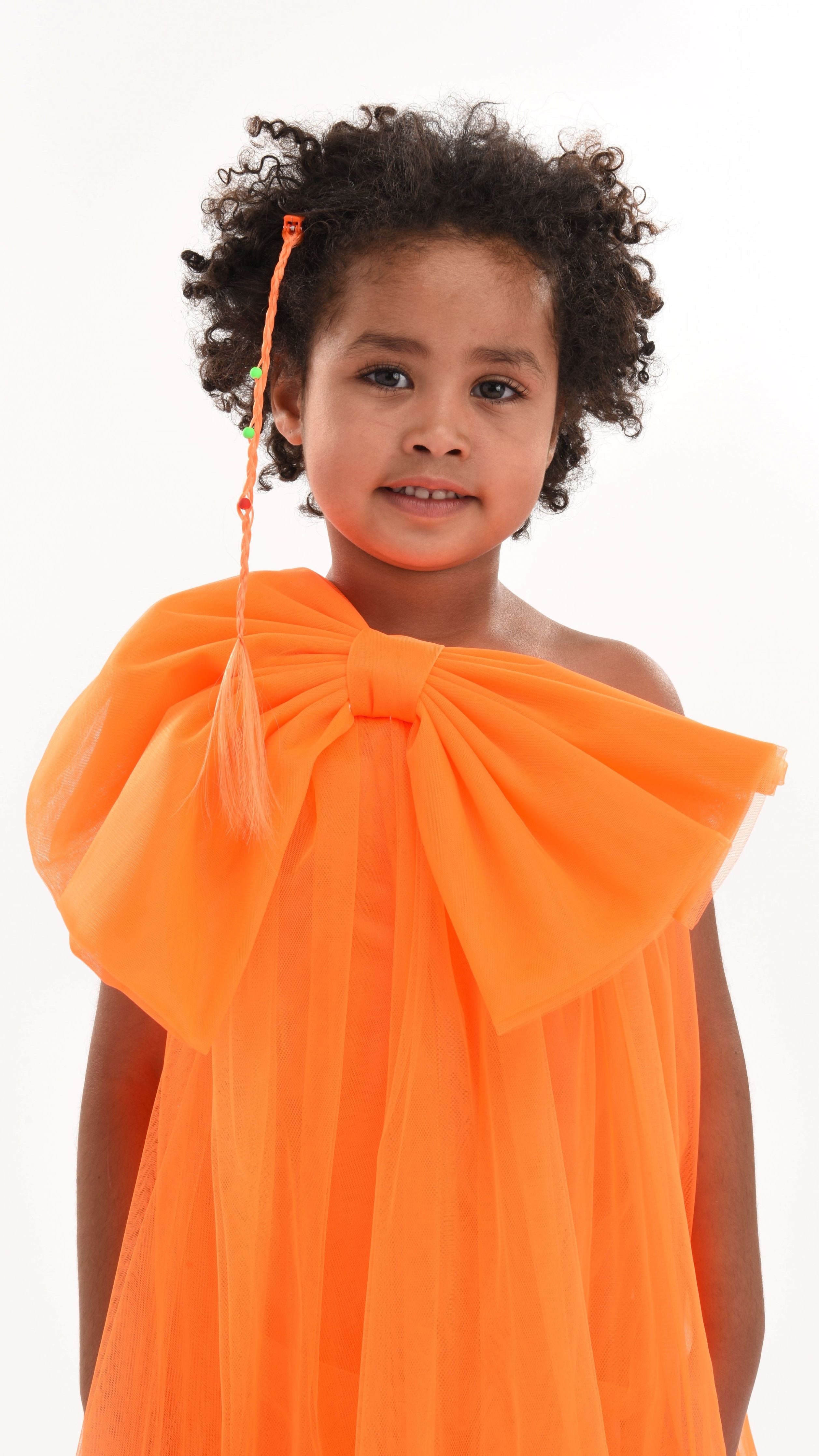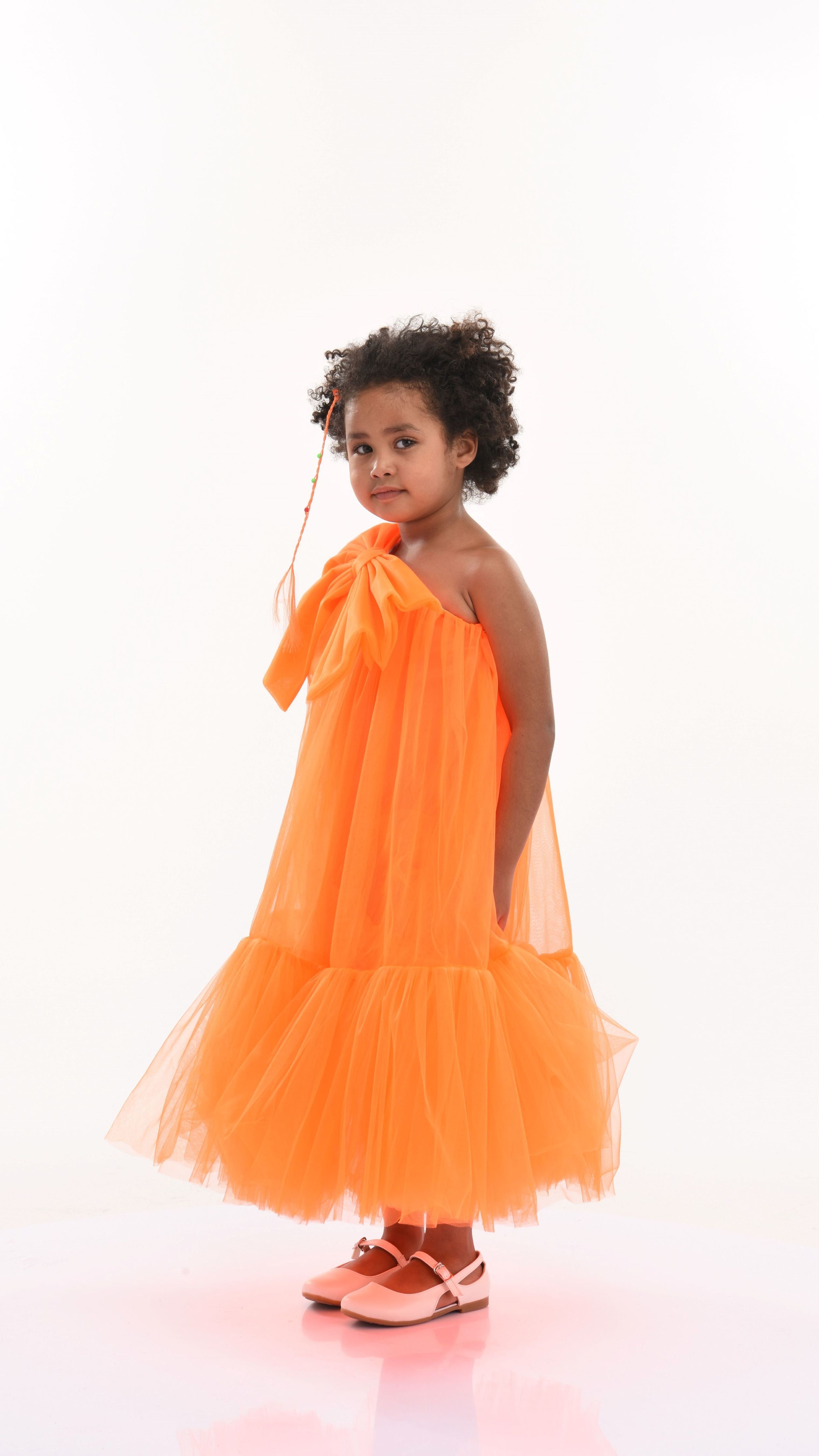Overall, the Orange Maggi Neon Bow Tulle Dress combines elegance, excitement, and playful design elements, ensuring your child looks and feels special at any event.