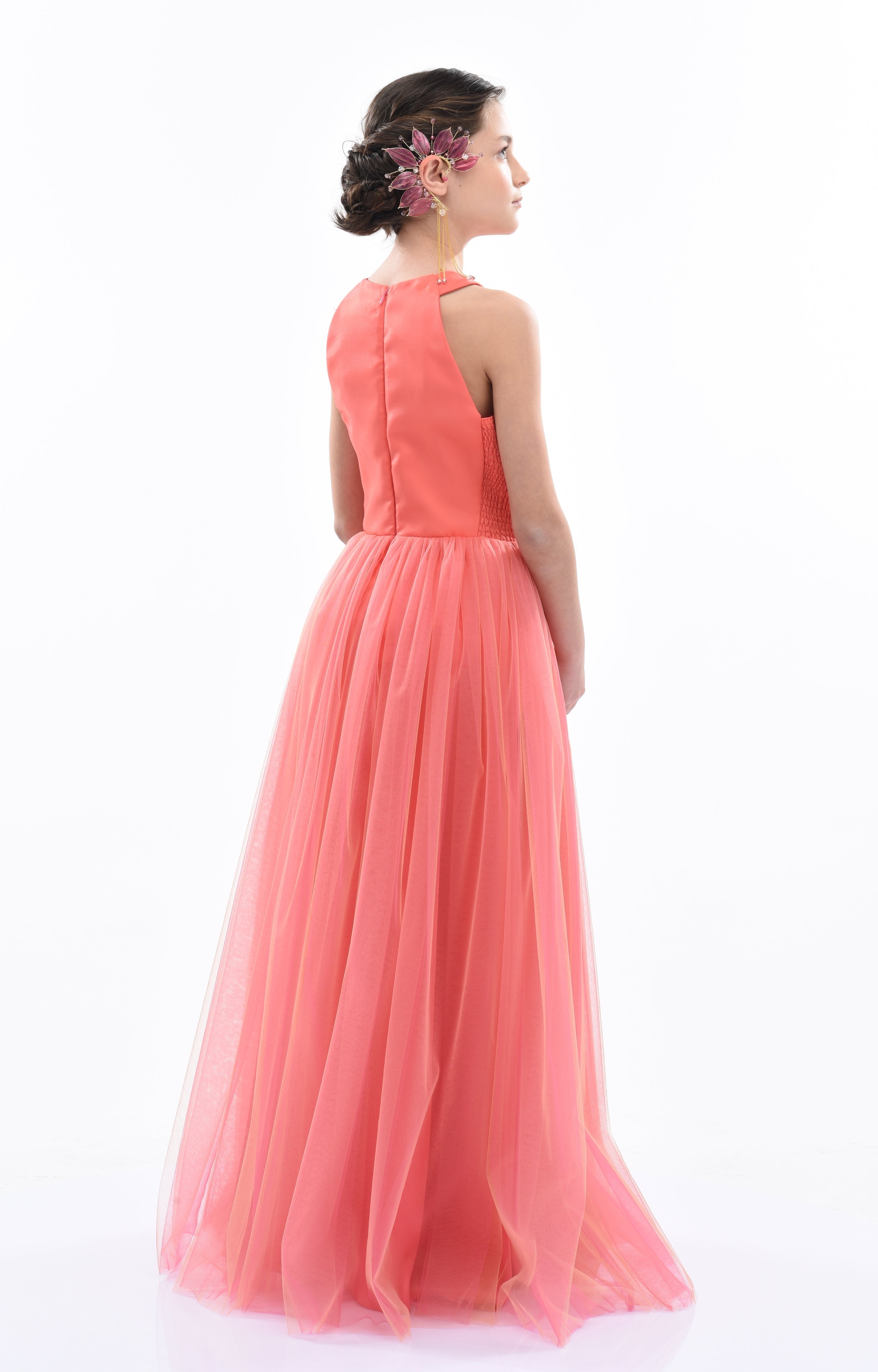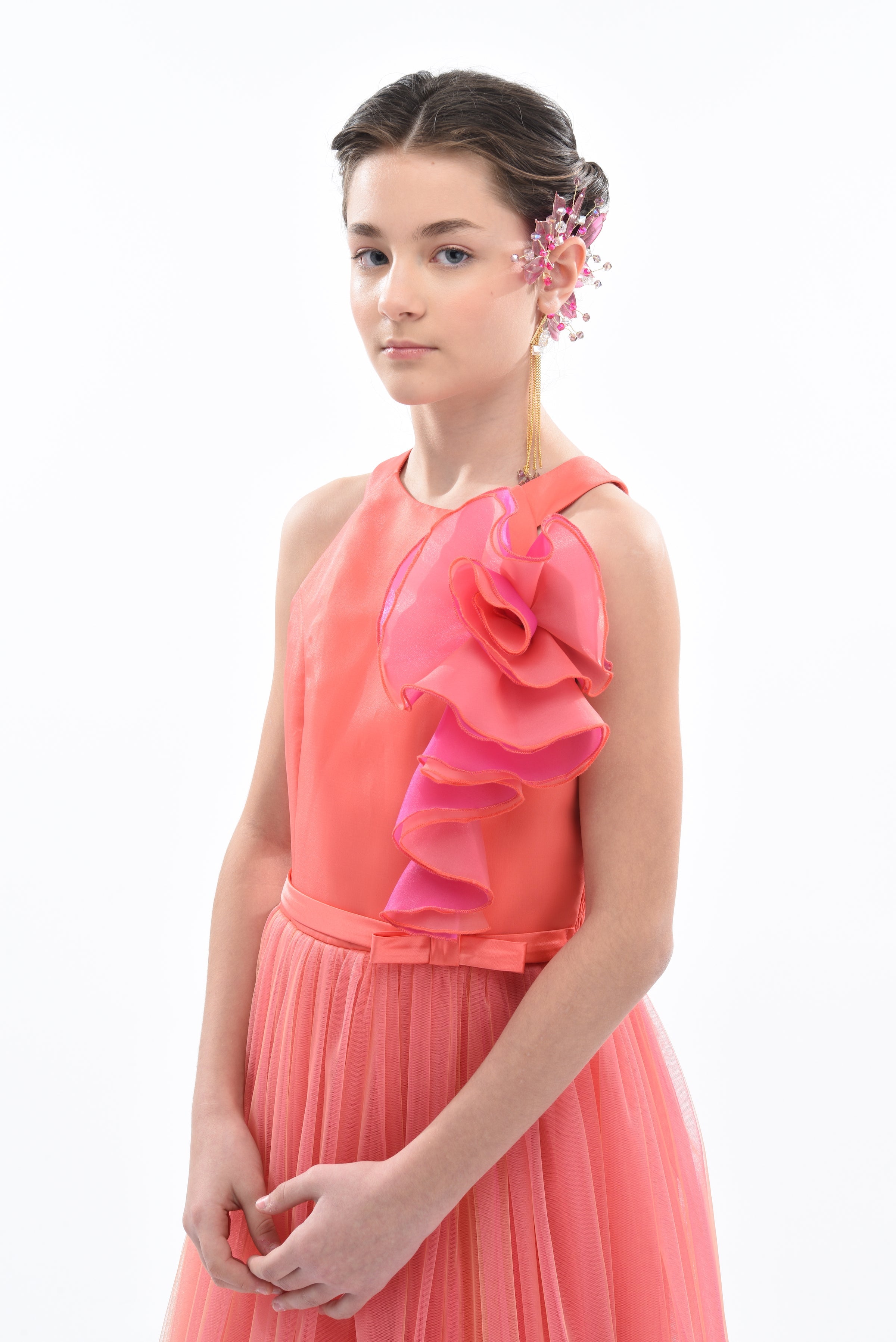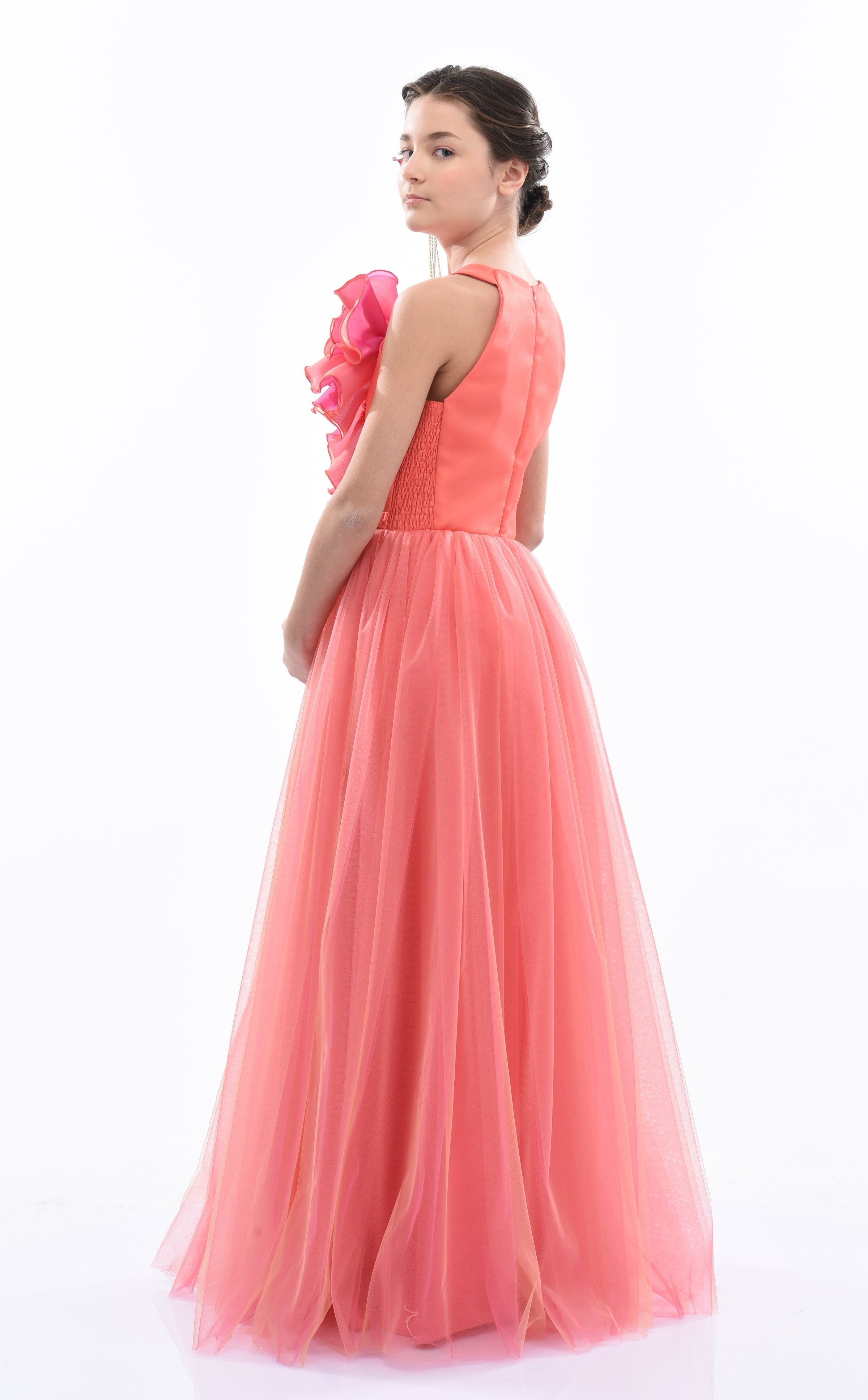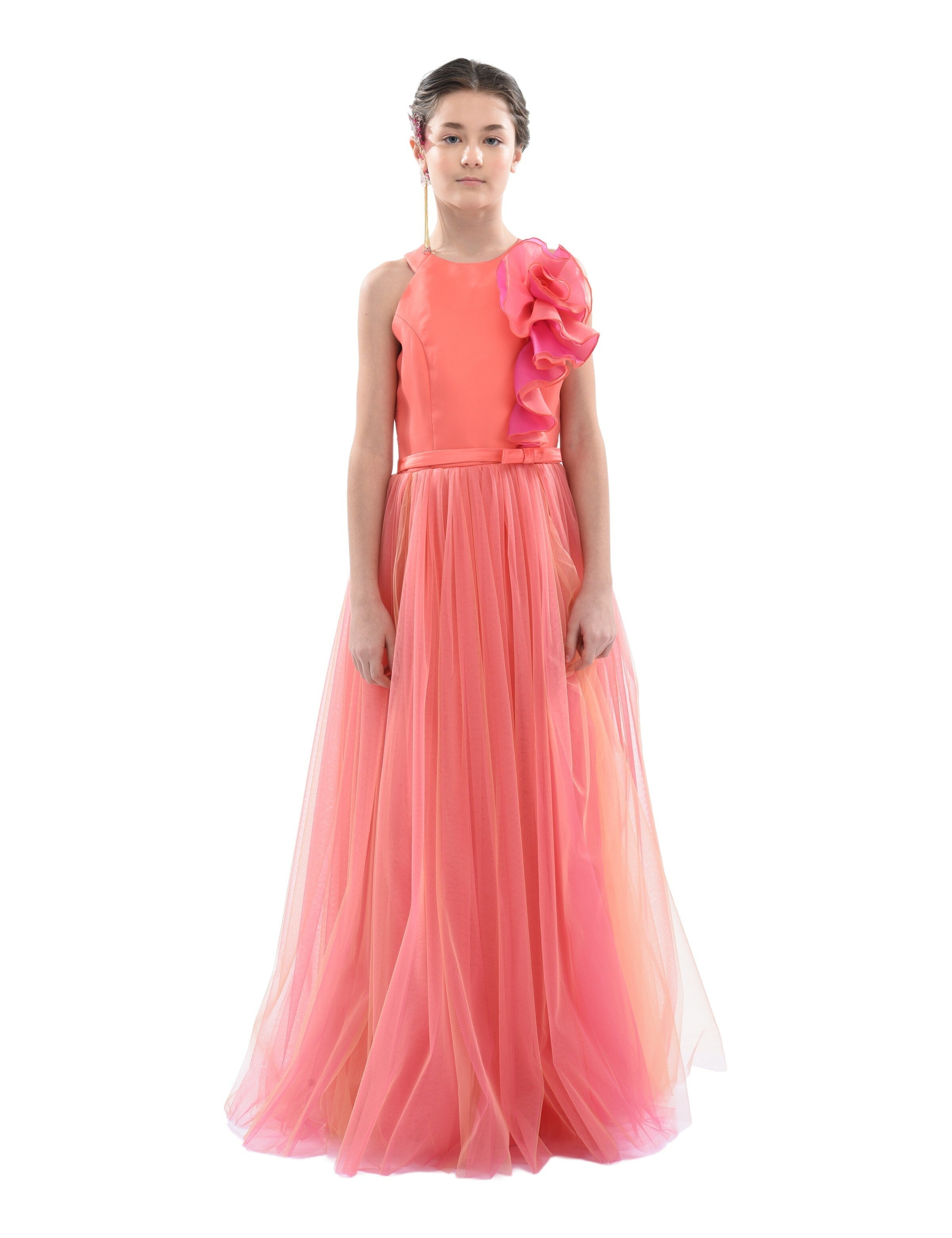 Additionally, the dress features a magnificent large tulle rose in pink and orange on the shoulder, adding a touch of whimsical charm. The long lightweight tulle skirt in fuchsia with an orange hue flows gracefully, making it perfect for twirling and dancing. Made from 100% polyester, this gown ensures both durability and comfort.
