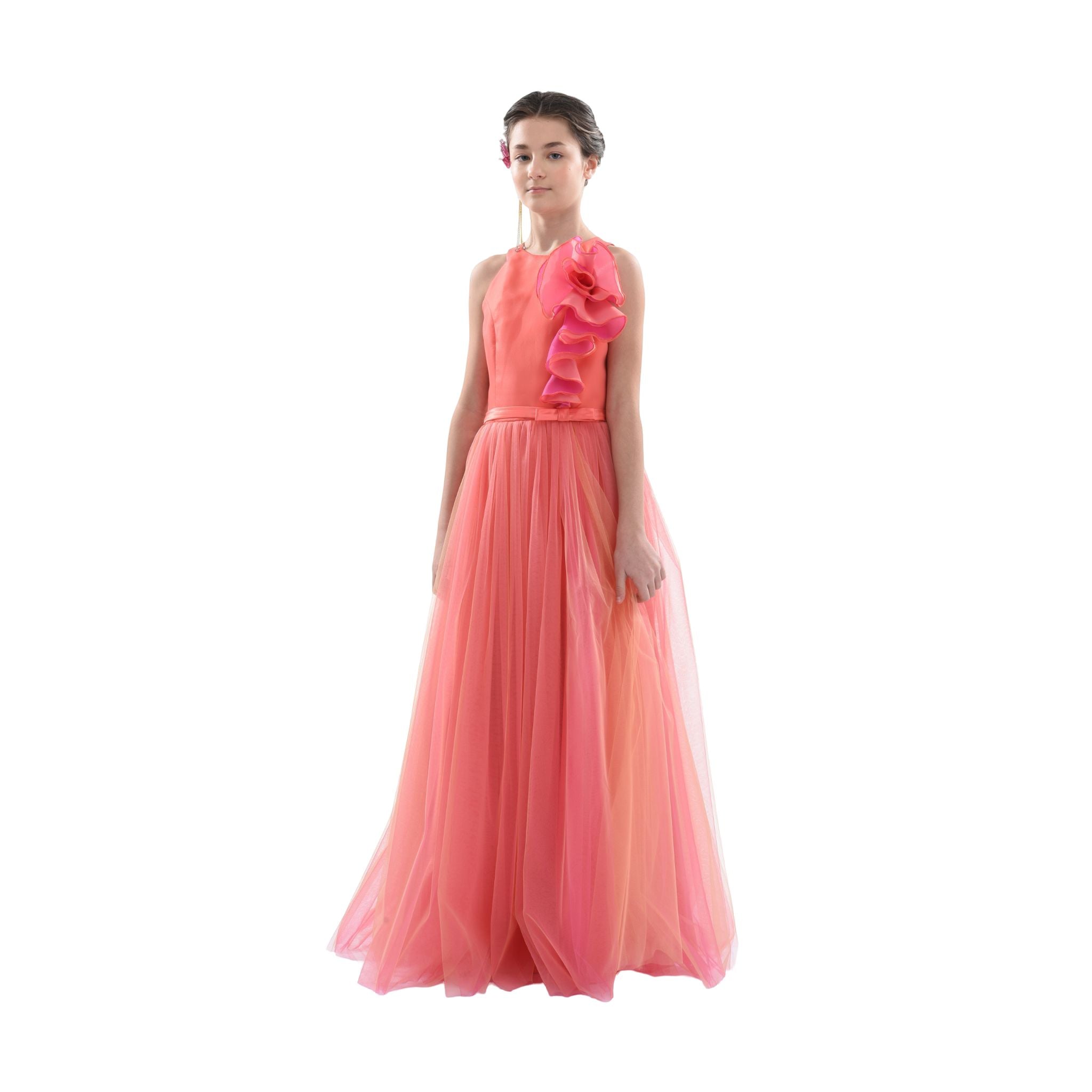 The Orange Malaga Halter Ruffle Gown for junior girls from Tulleen is a stunning and vibrant choice for any special occasion. This gorgeous piece shines in orange with fuchsia pink trims, creating a bold and eye-catching look. Firstly, the halter sleeveless cut provides an elegant and comfortable fit.
