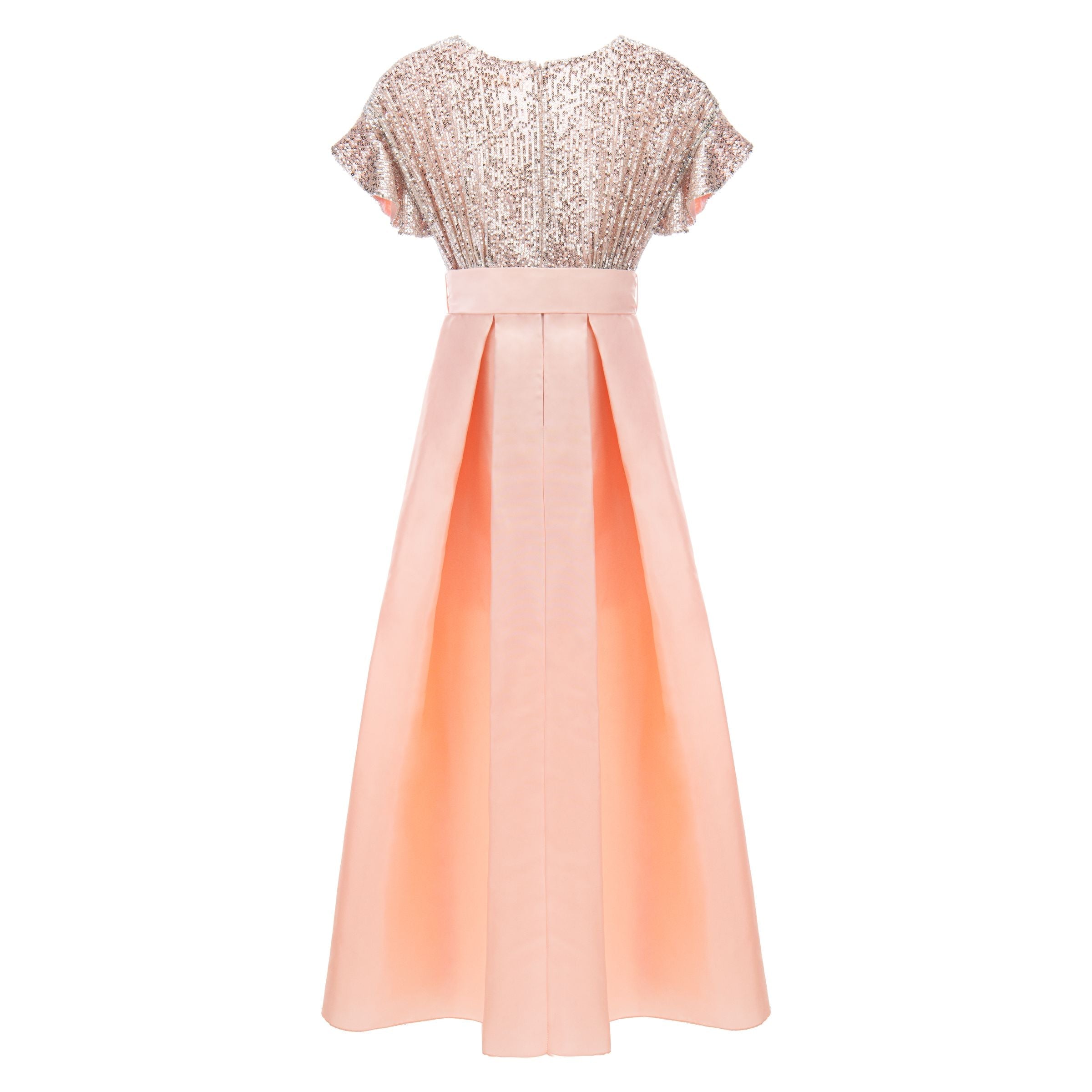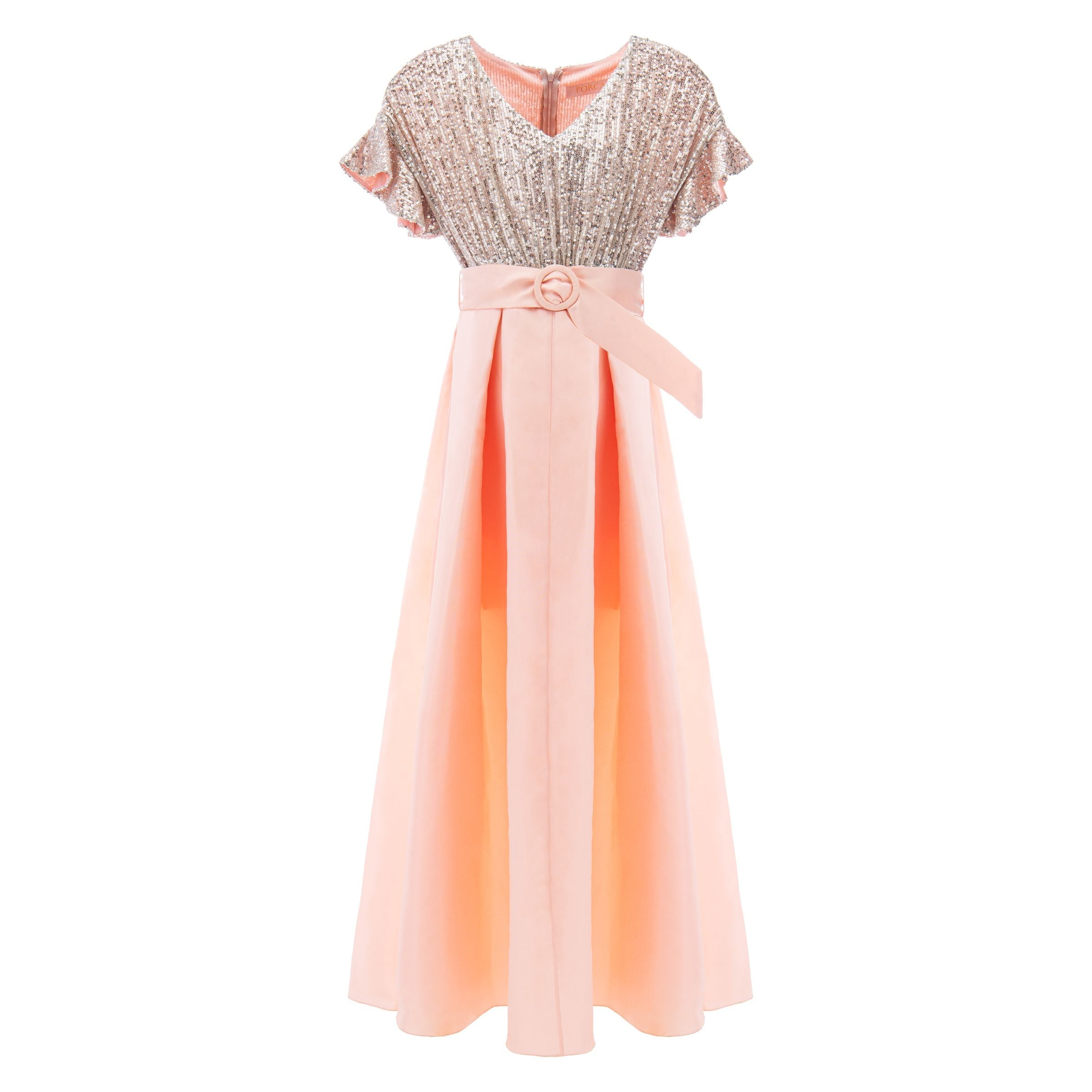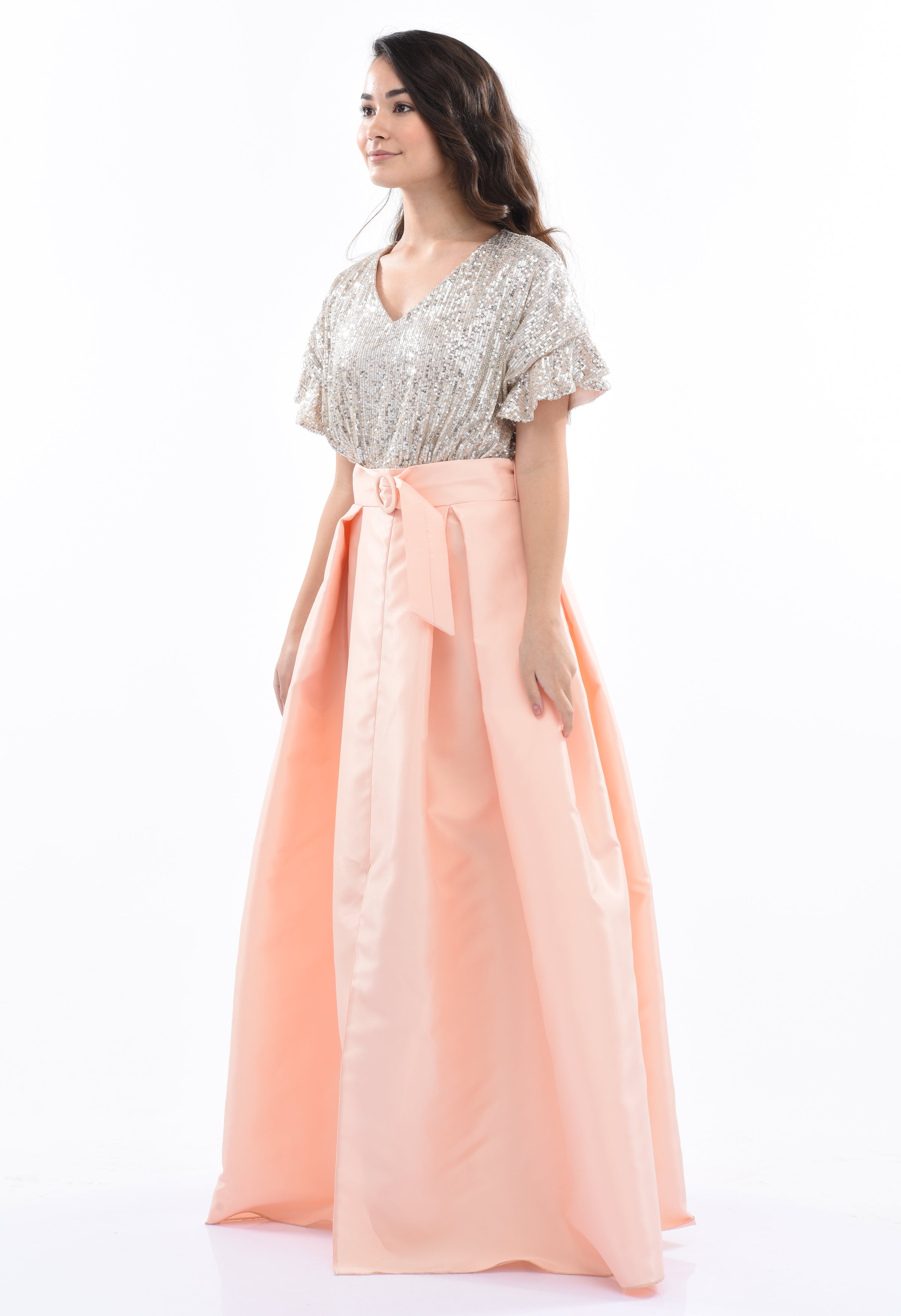 Peach pink Arcola glimmer tulle dress for junior girls from Tulleen. A formal and fashionable glimmered bodice design, ruffle sleeves, peach powder belt and lightweight double layered tulle skirt to complete this magnificent piece.