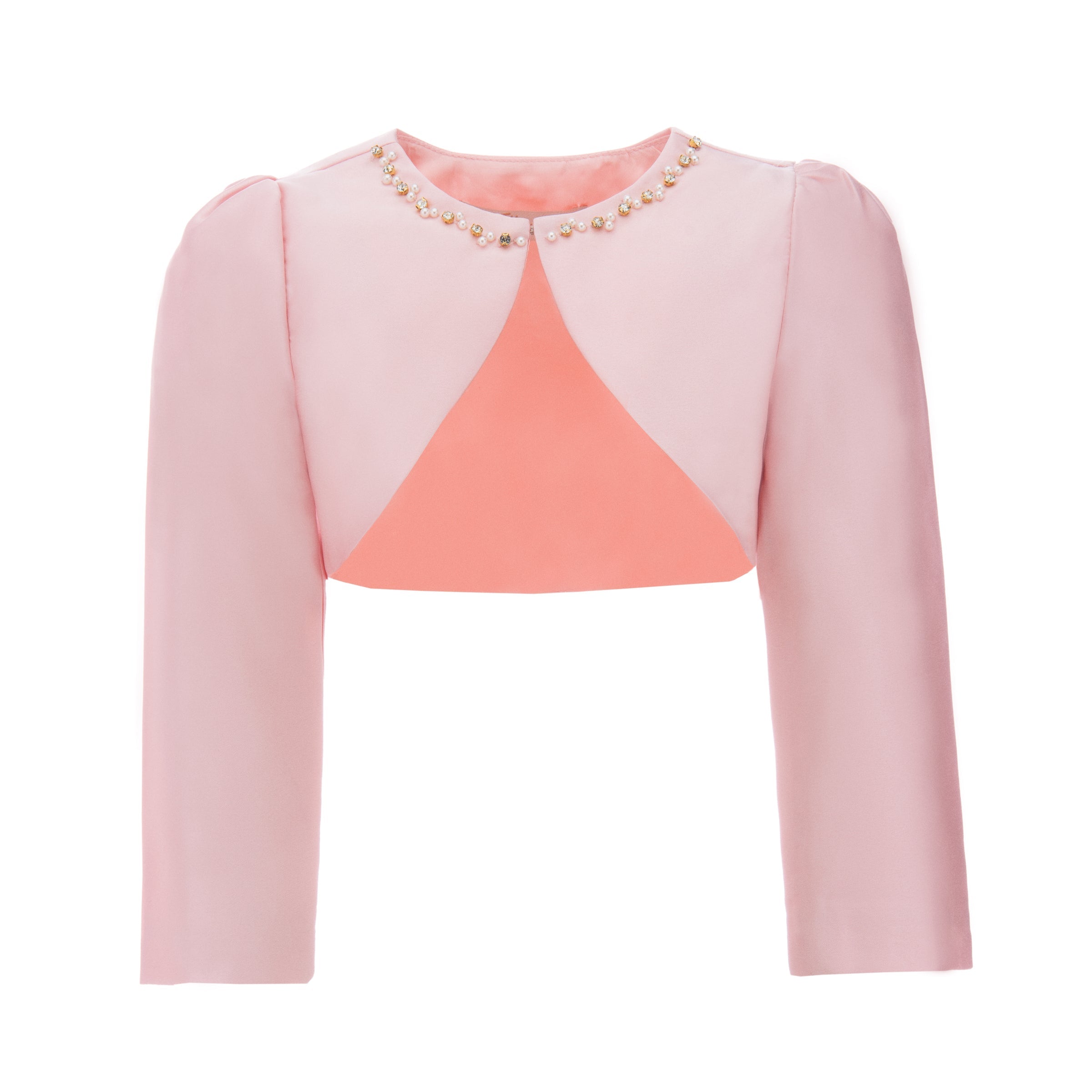 The Peach Pink Cropped Satin Cardigan for kid girls from Tulleen is a stylish and elegant addition to any young girl's wardrobe. This soft satin cardigan features long sleeves, ensuring comfort and ease of movement. Firstly, the gem design on the round neck adds a touch of sparkle and sophistication, making it perfect for special occasions.