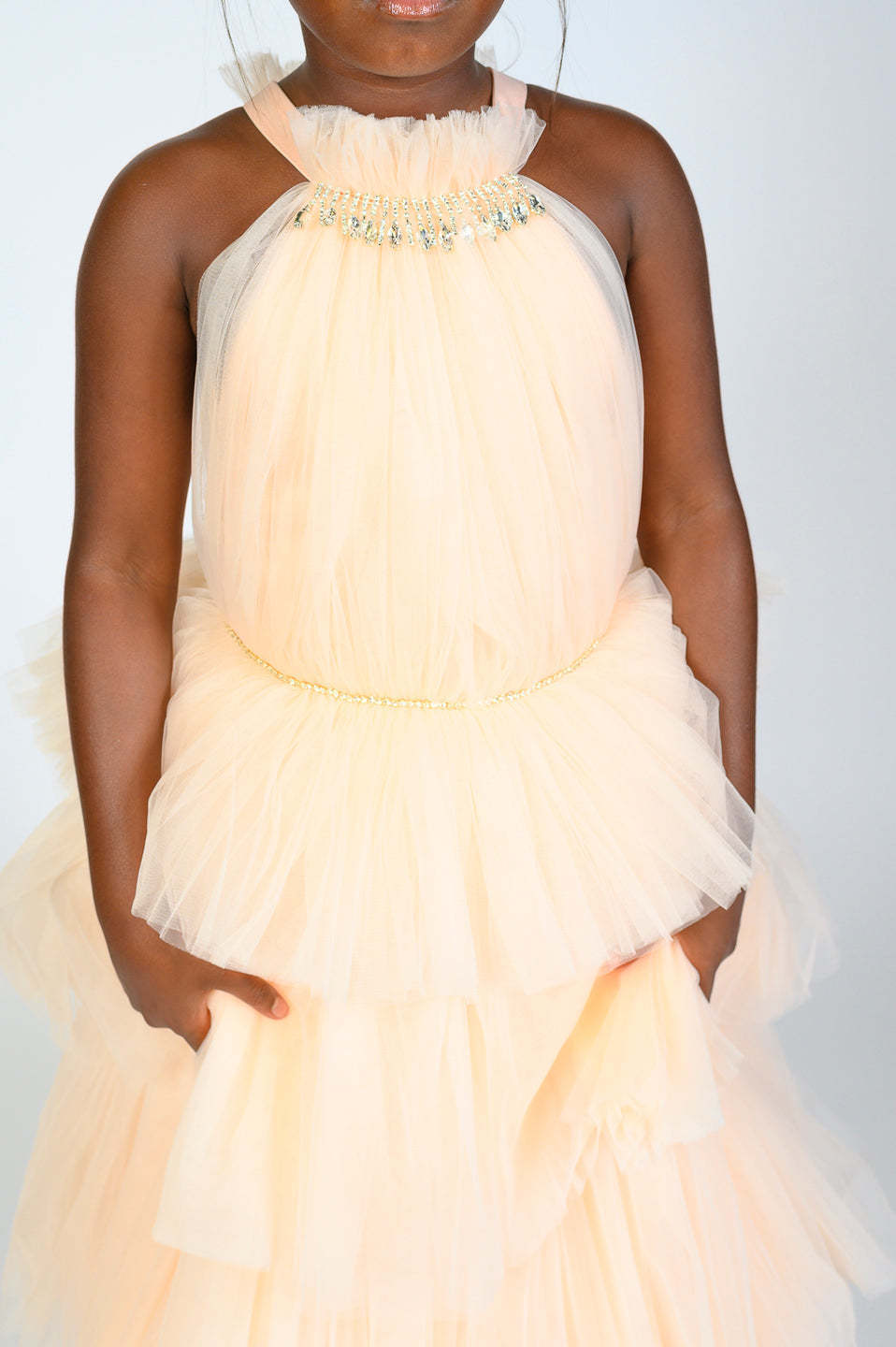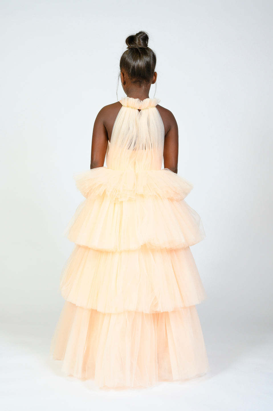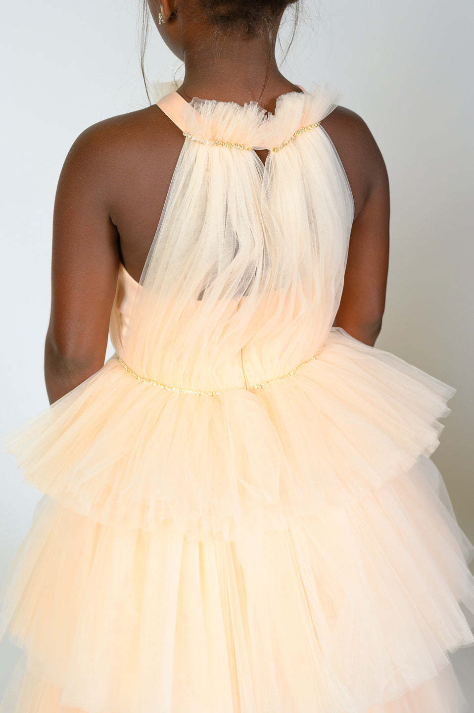 Immerse in the enchanting layers of tulle that define the Peach Francesca Dress for young girls by Tulleen. This stunning peach dress with a high-neck design is sure to capture attention and make your little one feel like a princess on various special occasions such as weddings, flower girl duties, ball gown-themed birthdays, graduations, recitals, or even during fun dress-up moments.