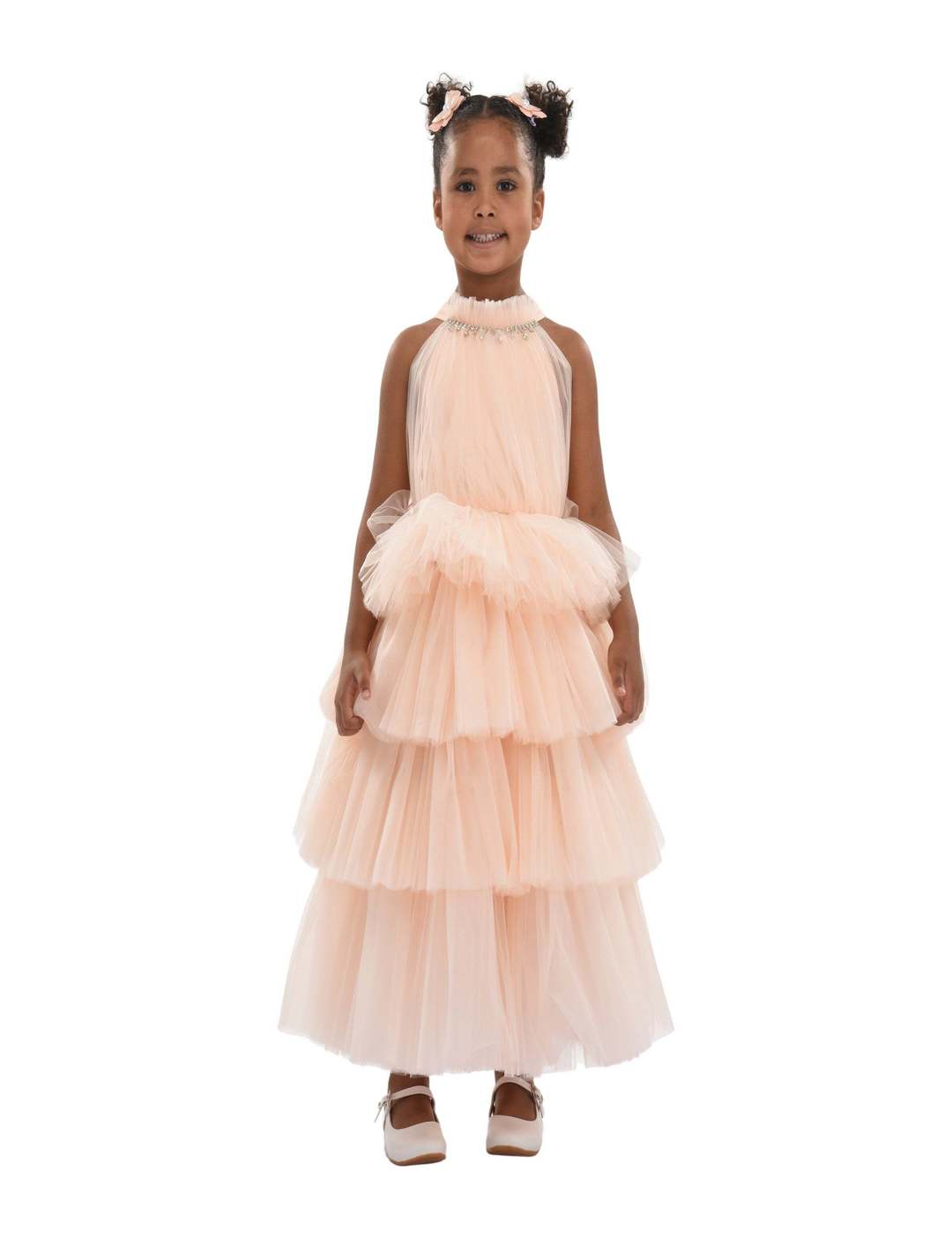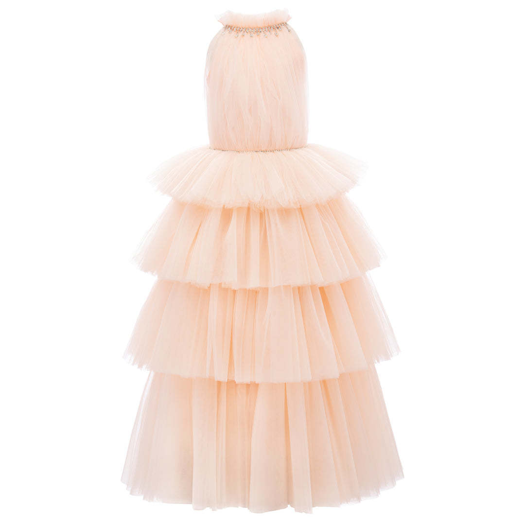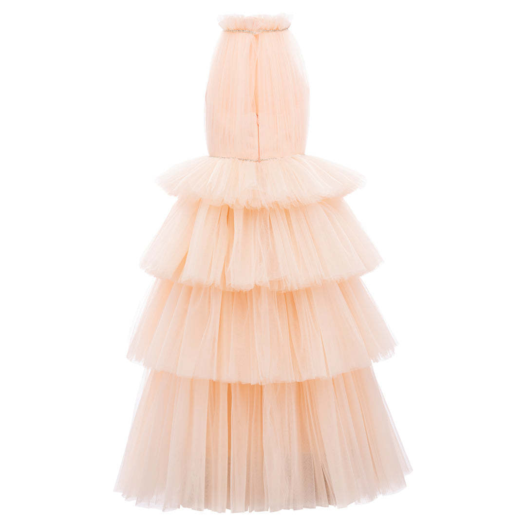 Immerse in the enchanting layers of tulle that define the Peach Francesca Dress for young girls by Tulleen. This stunning peach dress with a high-neck design is sure to capture attention and make your little one feel like a princess on various special occasions such as weddings, flower girl duties, ball gown-themed birthdays, graduations, recitals, or even during fun dress-up moments.