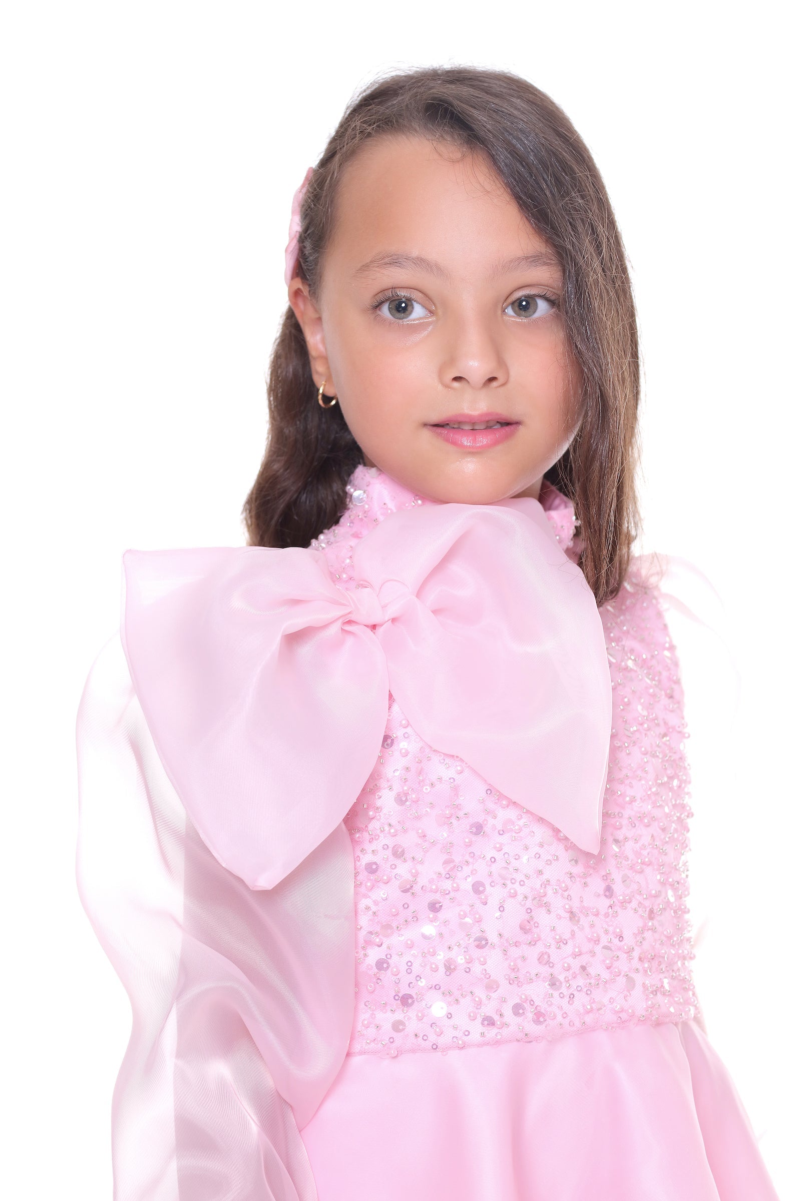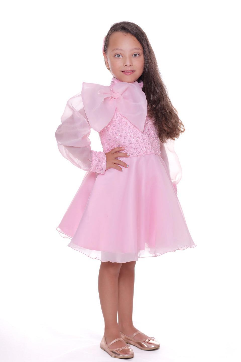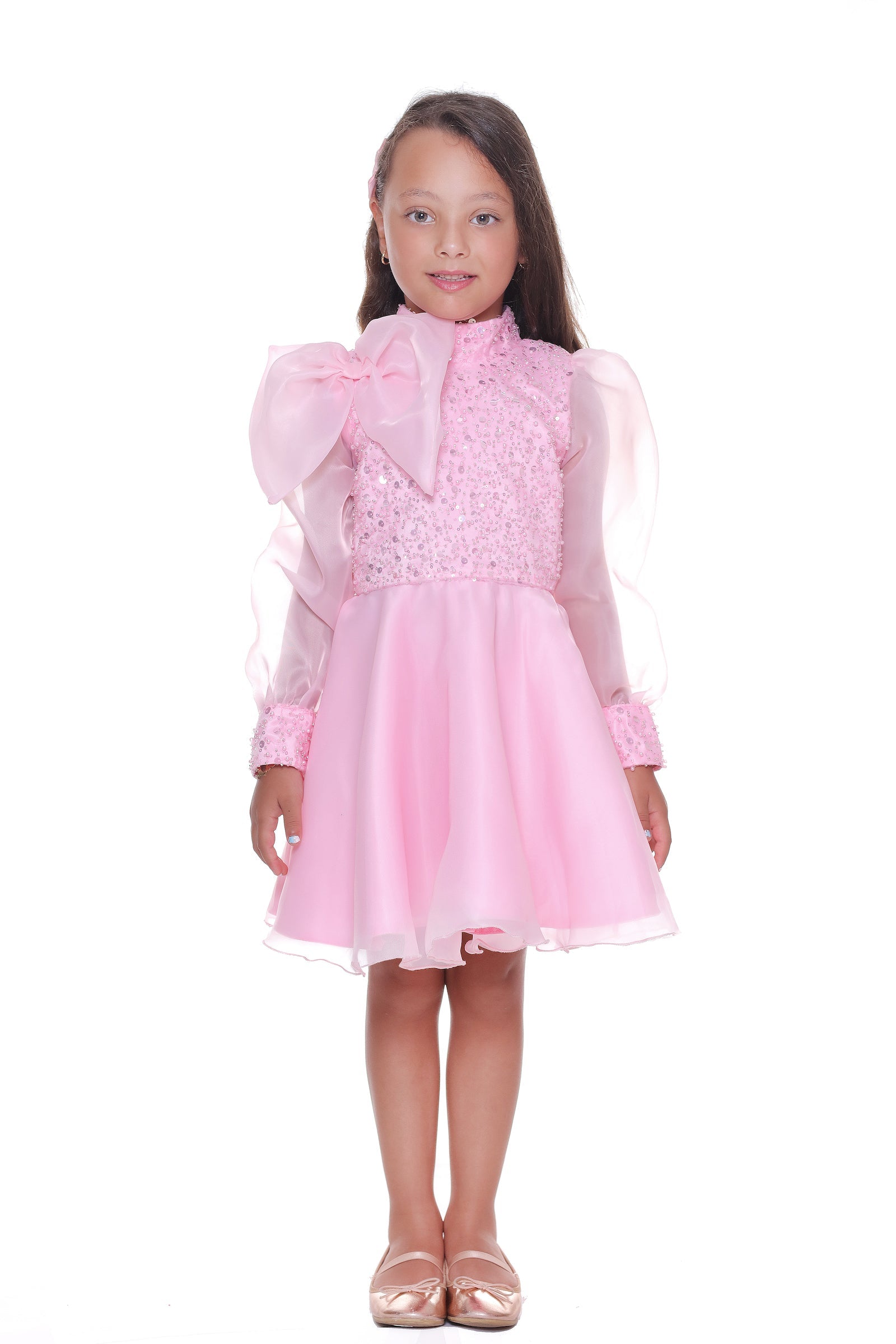 Additionally, the airy long organza sleeves provide a light and graceful appearance, perfectly complementing the overall design. The knee-length tulle skirt in softer shades of pink adds volume and grace, ensuring your child looks and feels like royalty. Made from 100% polyester, this dress guarantees both durability and comfort.
