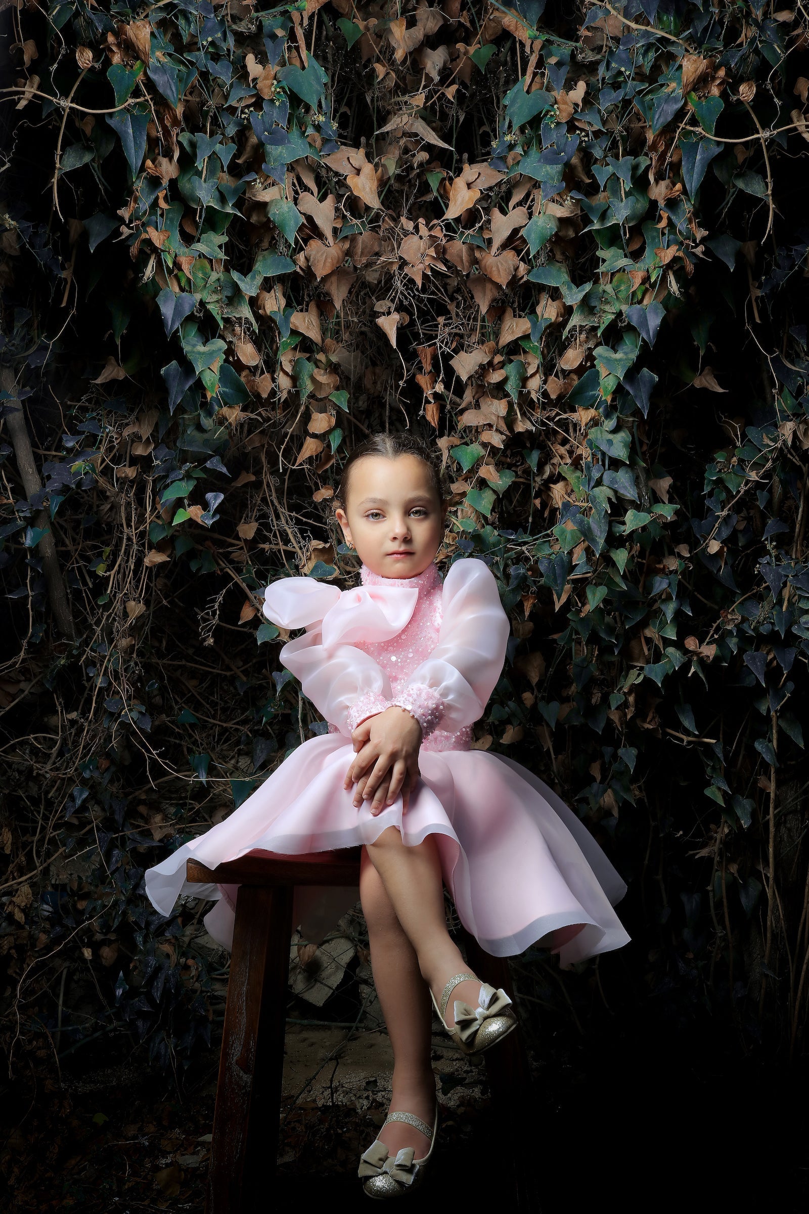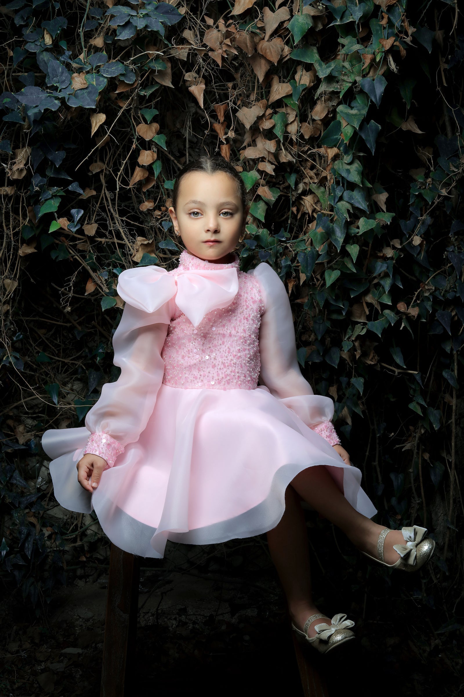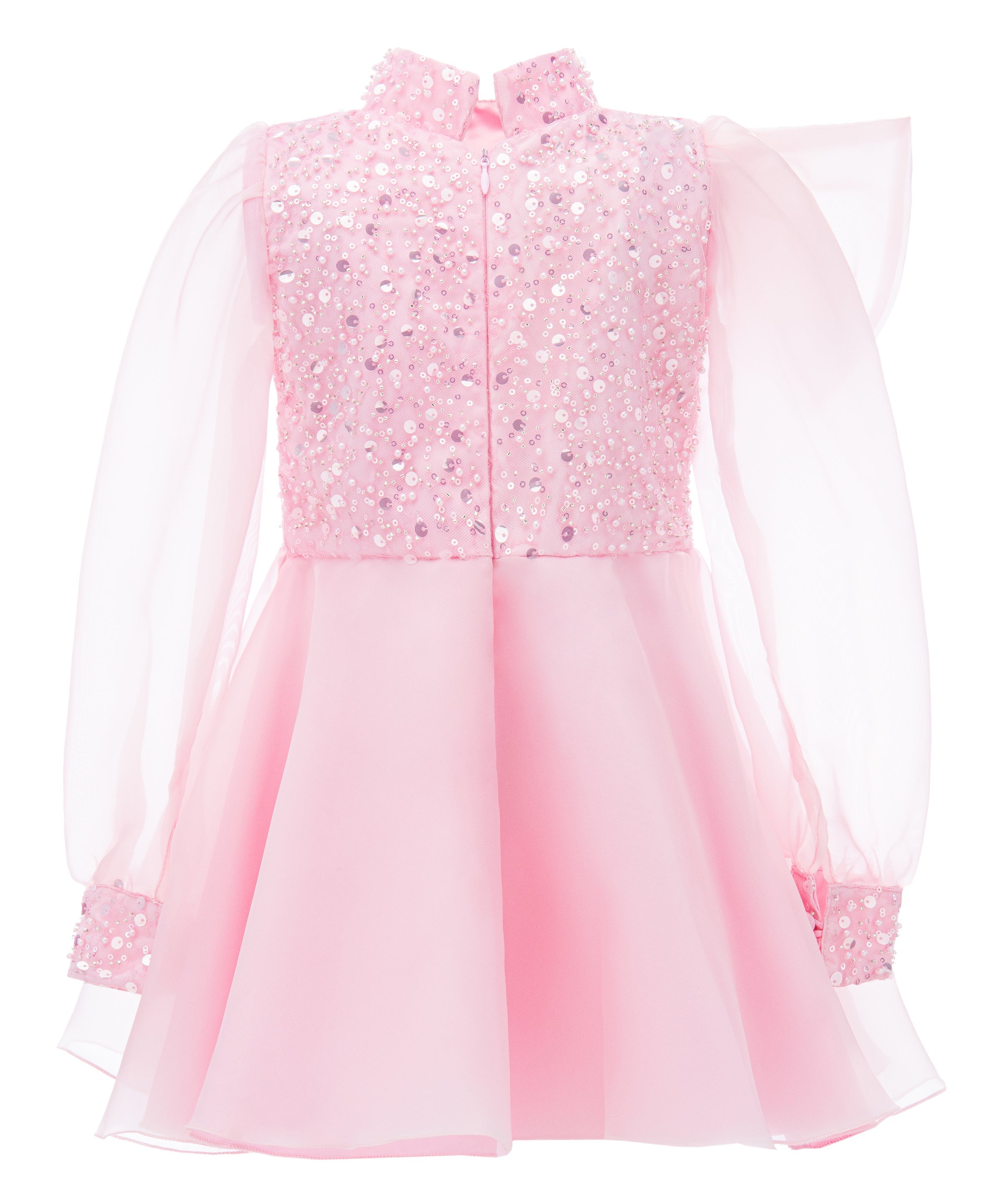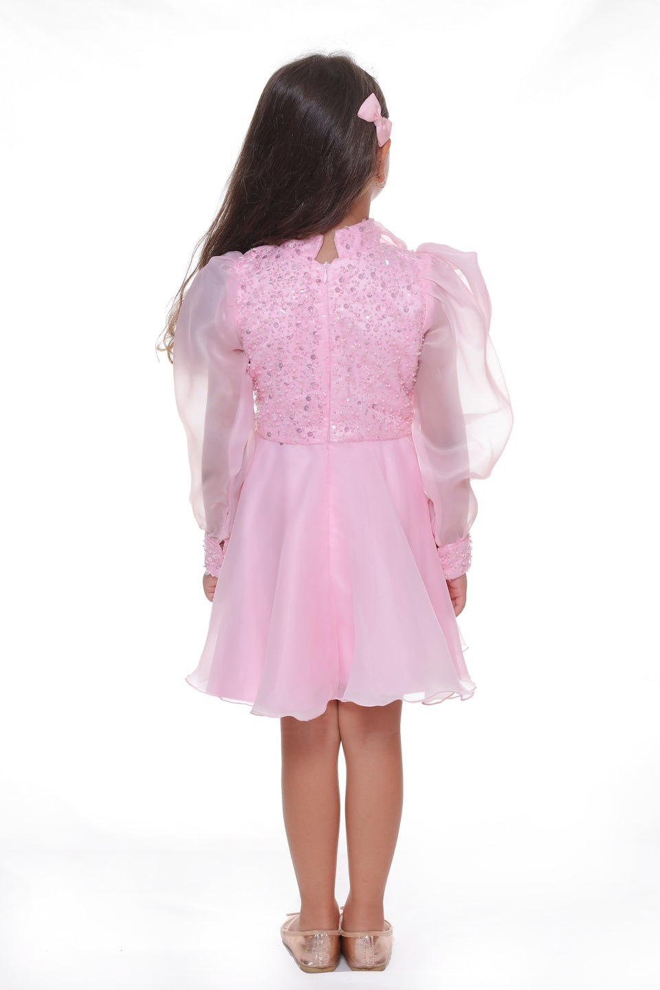Additionally, the airy long organza sleeves provide a light and graceful appearance, perfectly complementing the overall design. The knee-length tulle skirt in softer shades of pink adds volume and grace, ensuring your child looks and feels like royalty. Made from 100% polyester, this dress guarantees both durability and comfort.
