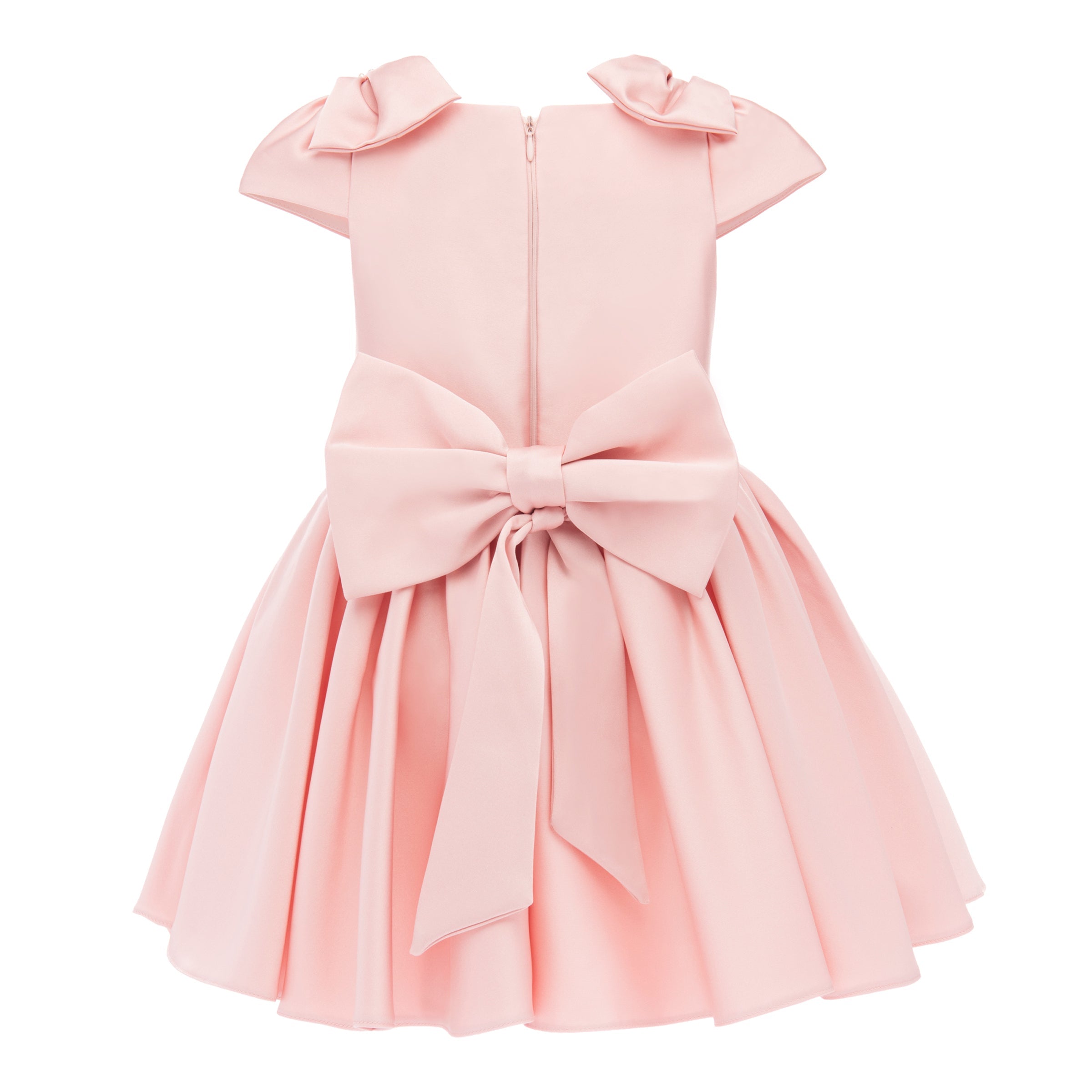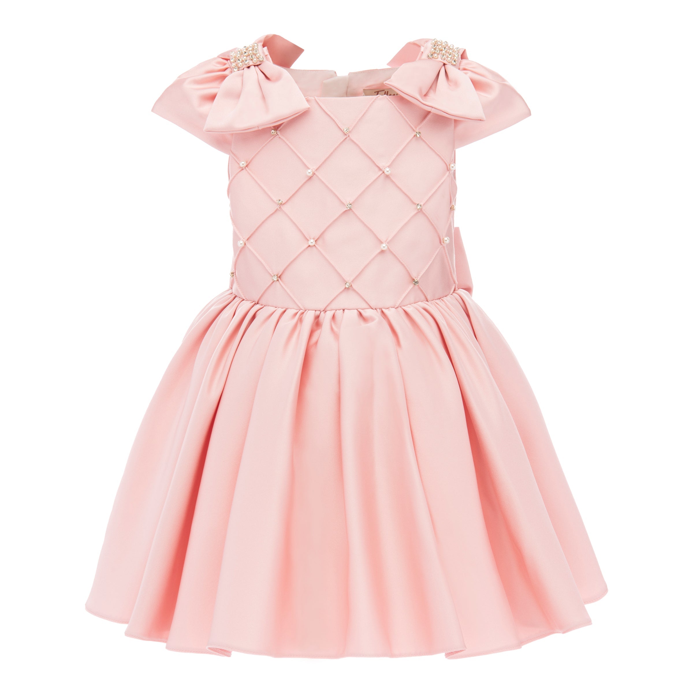 The Pink Alondra Quilted Teacup Dress for kid girls from Tulleen blends charm and elegance effortlessly. This dress features a quilted gem bodice, adding a touch of sparkle and sophistication. The short sleeves each have a pink bow, enhancing the playful design. A big pink bow in the back creates a stunning focal point, leading to a full pink tulle skirt. This combination adds volume and whimsy to the dress, making it perfect for special occasions.