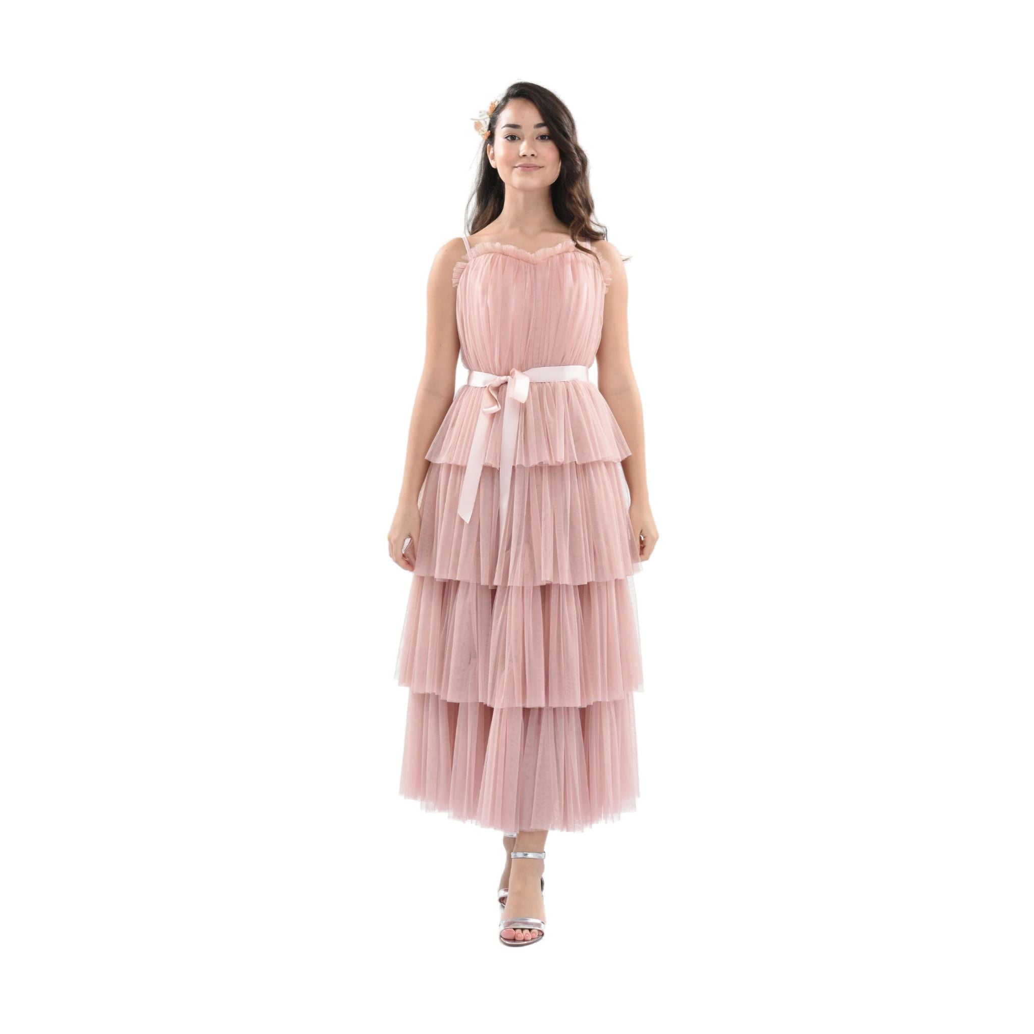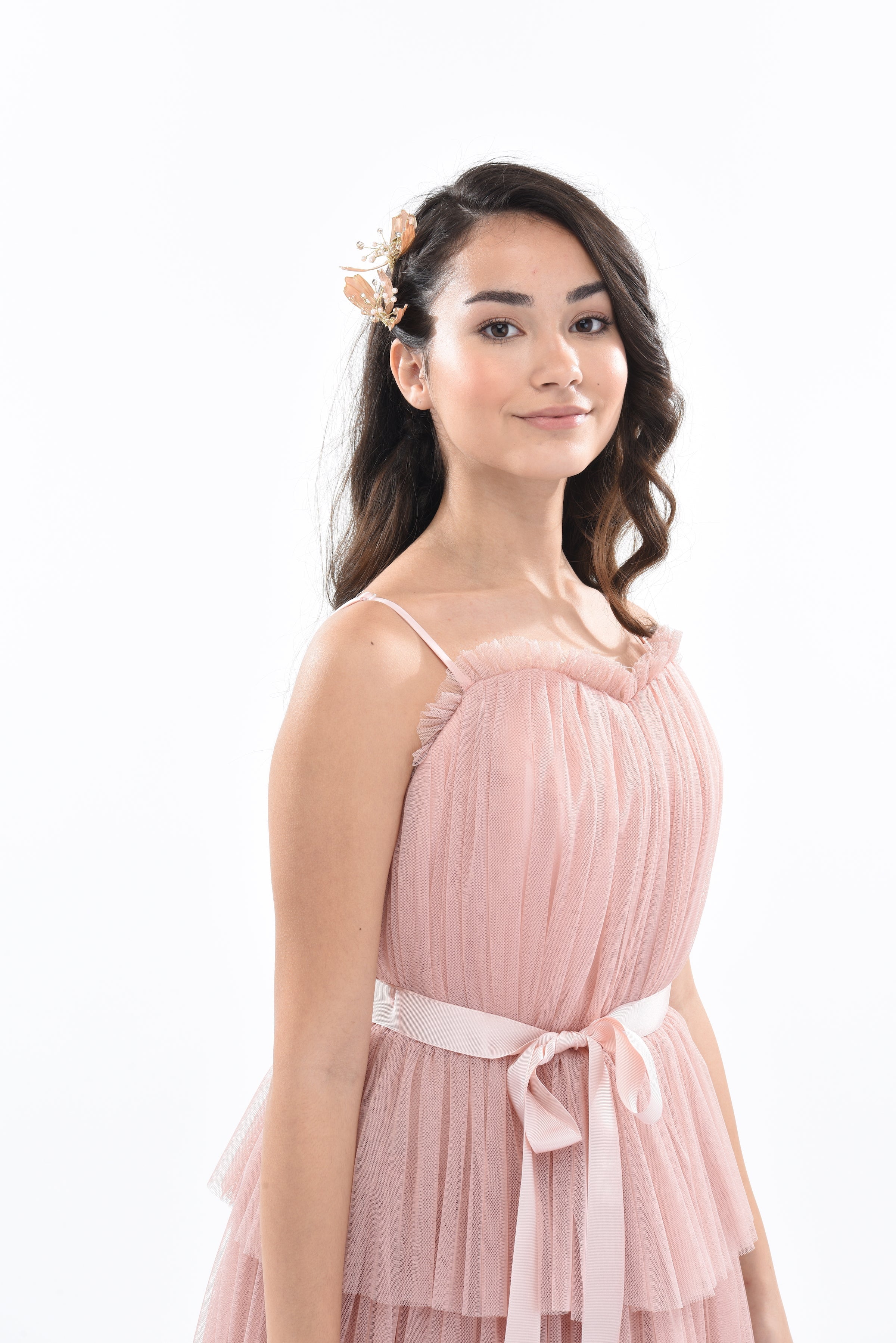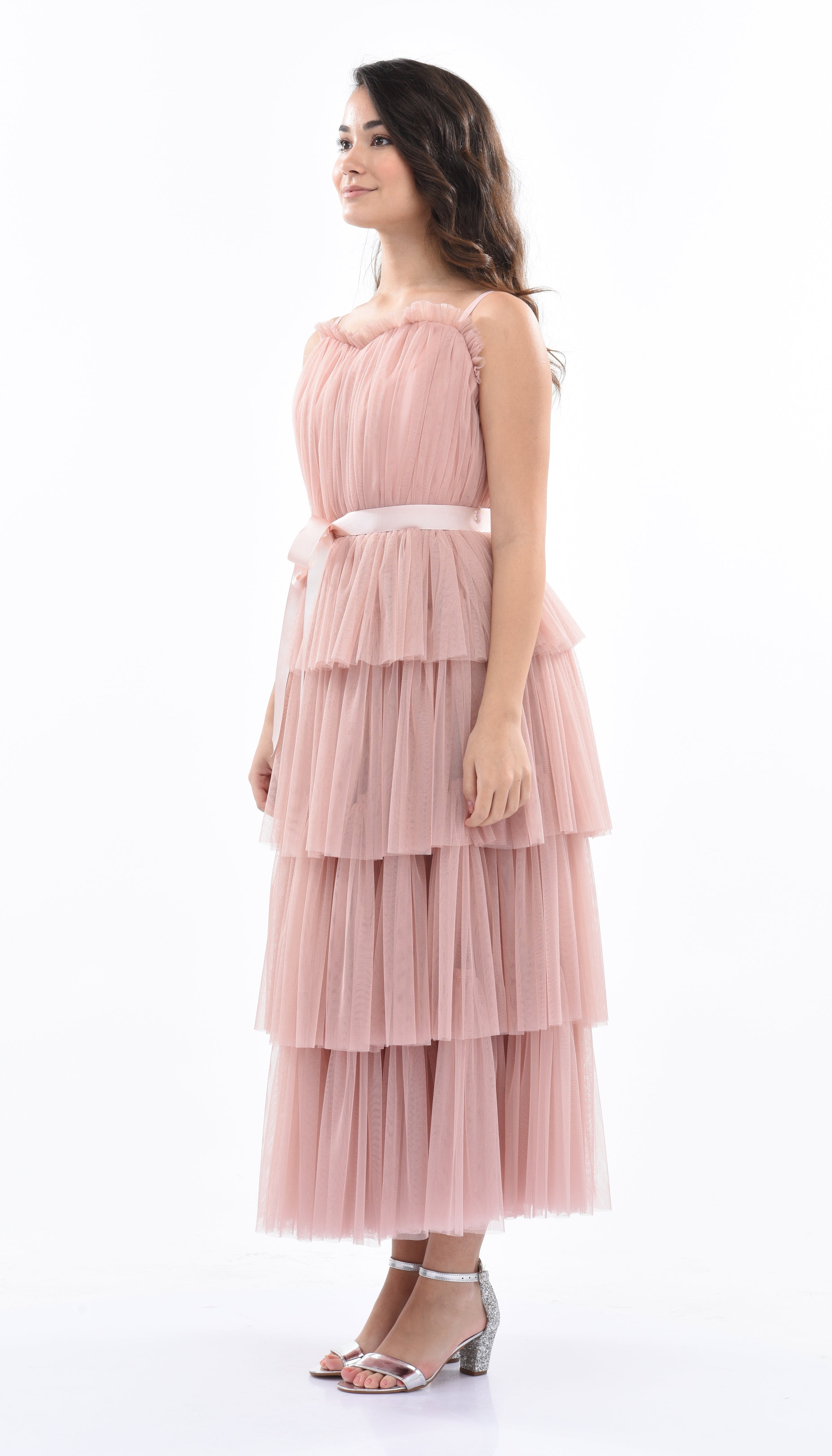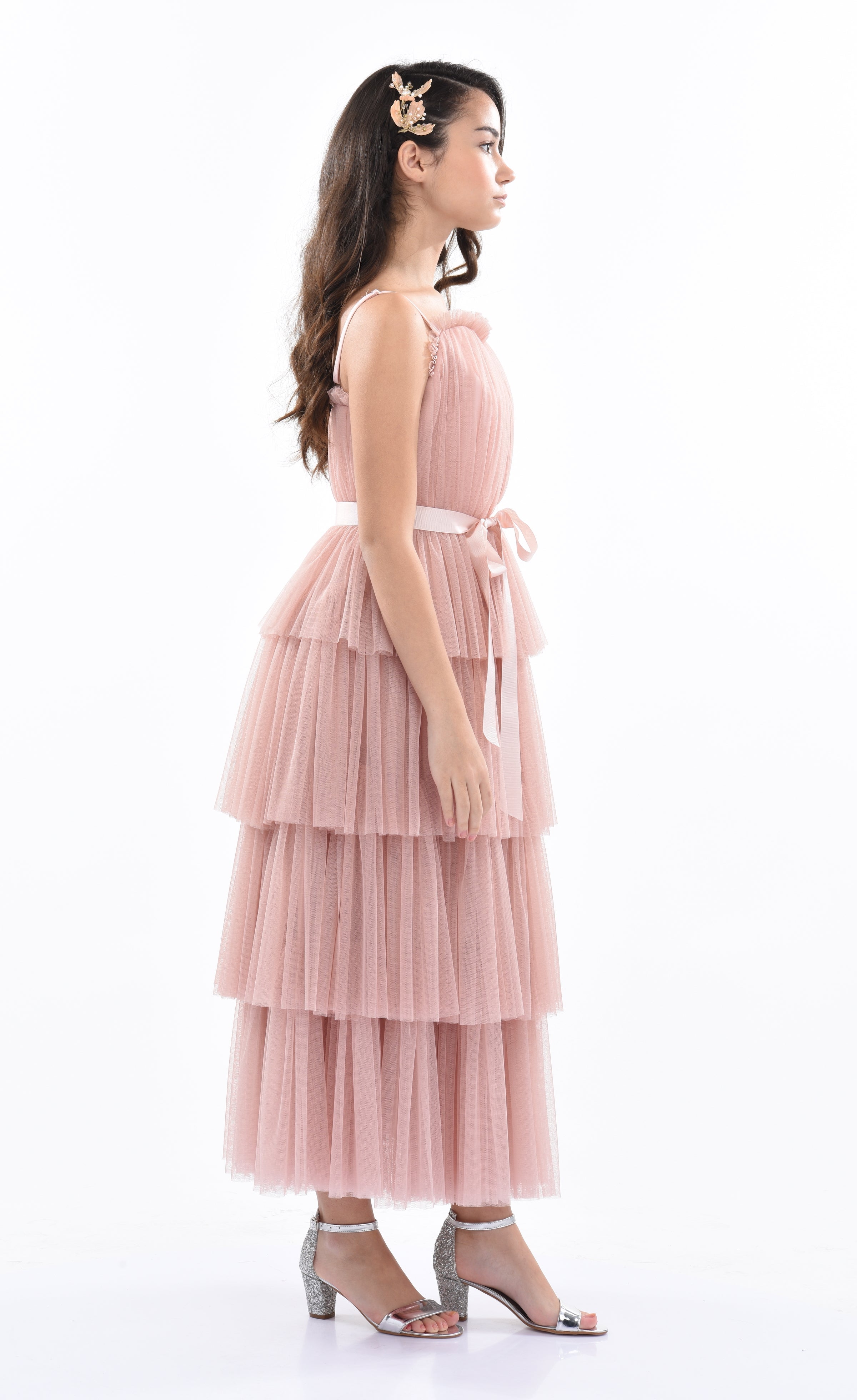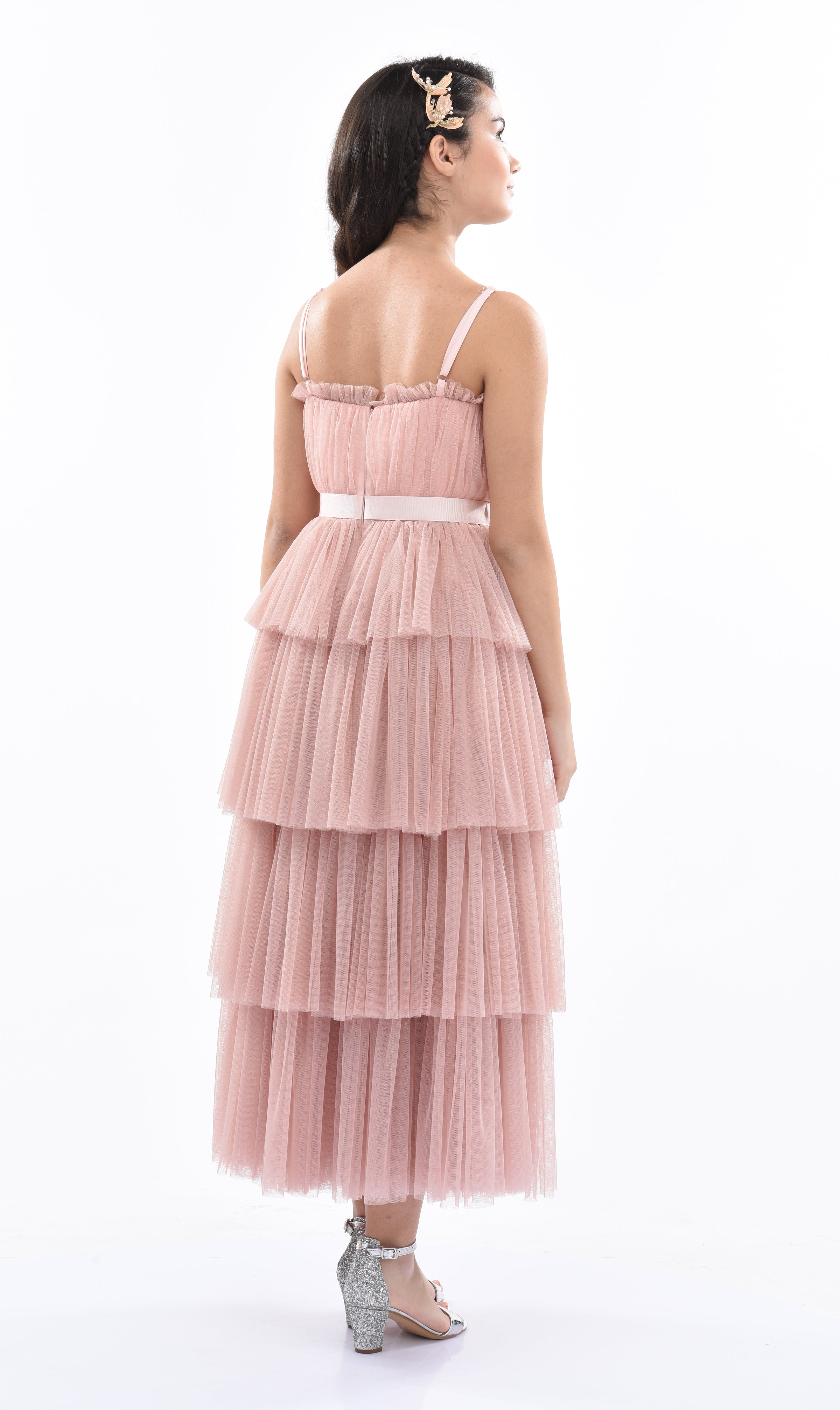 The Pink Blush Firenze Tiered Ribbon Dress for kid girls from Tulleen is a delightful and elegant choice for any special occasion. This dress features a thin strap bodice with tulle layers, creating a whimsical and charming look. Firstly, the square neck provides a classic and sophisticated fit.