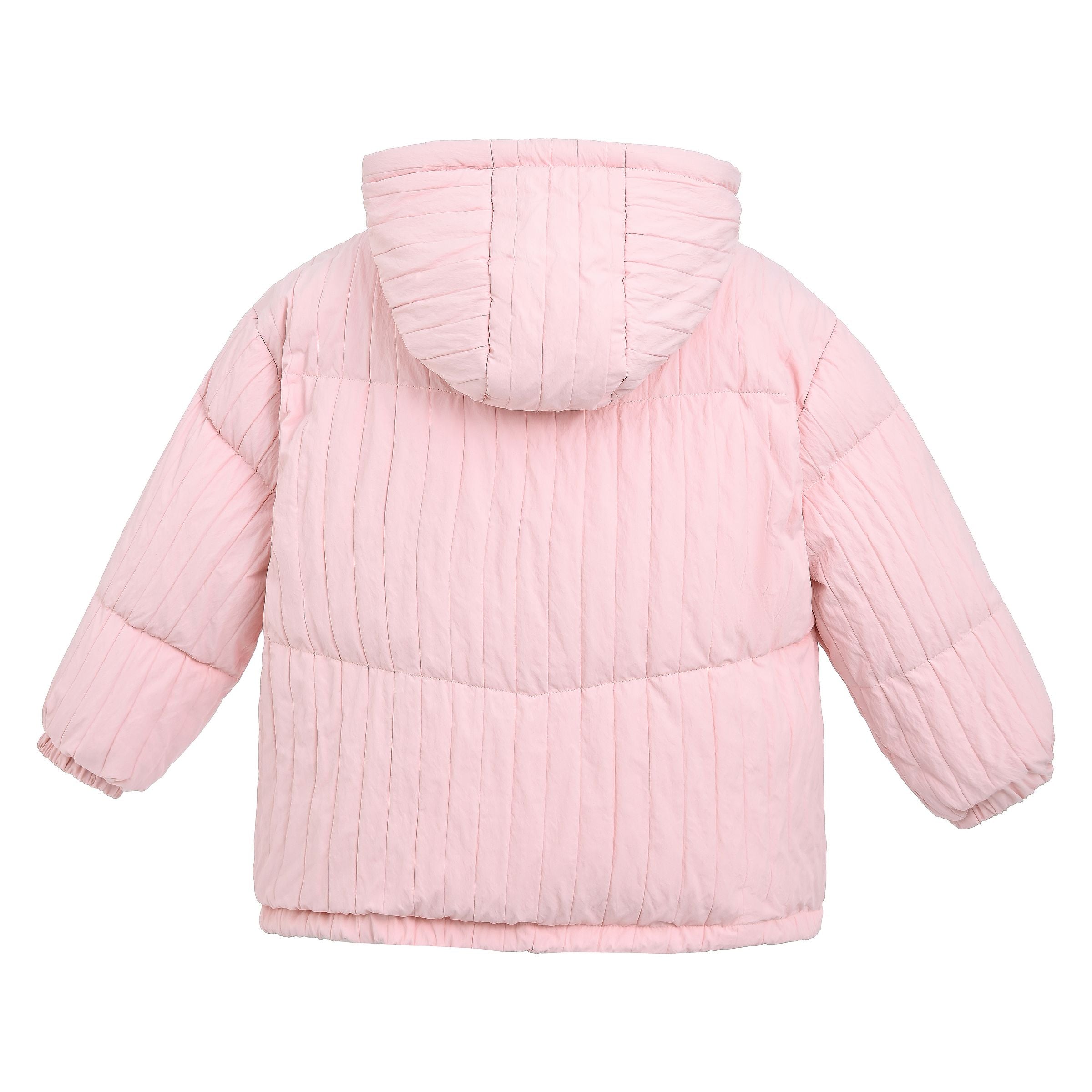 This light pink puffer jacket wraps little ones in warmth and charm. With vertical quilting, a cozy hood, and two sweet bows at the waist, it’s the perfect blend of function and flair for chilly days and stylish strolls.