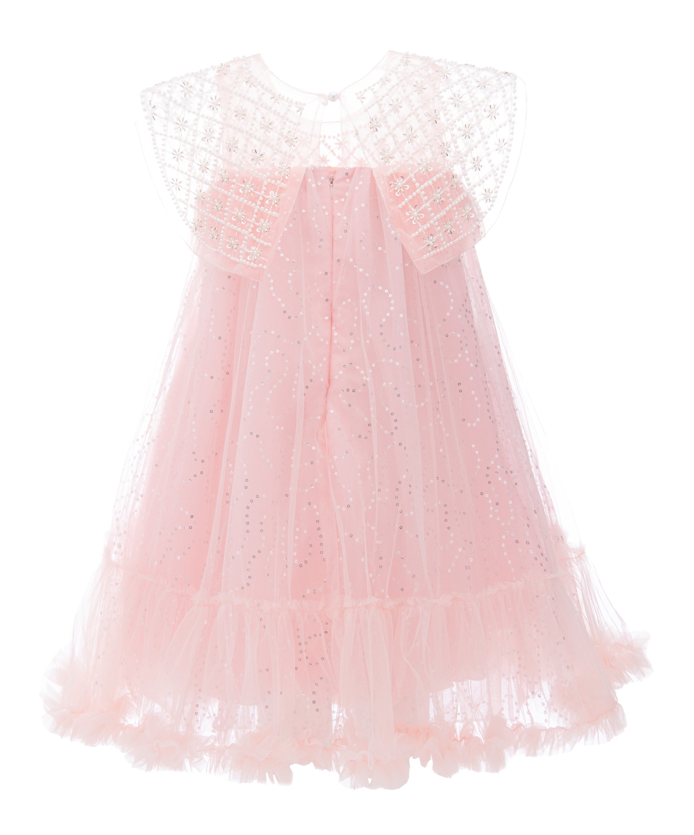 Additionally, the pink tulle frills at the hem of the skirt add a whimsical and fun detail, perfect for twirling and dancing. Made from a blend of 65% polyester and 35% viscose, this dress ensures both durability and comfort. The zip closure at the back allows for easy dressing and a secure fit. Designed to be dry cleaned only, this dress maintains its quality and luxurious appearance over time.