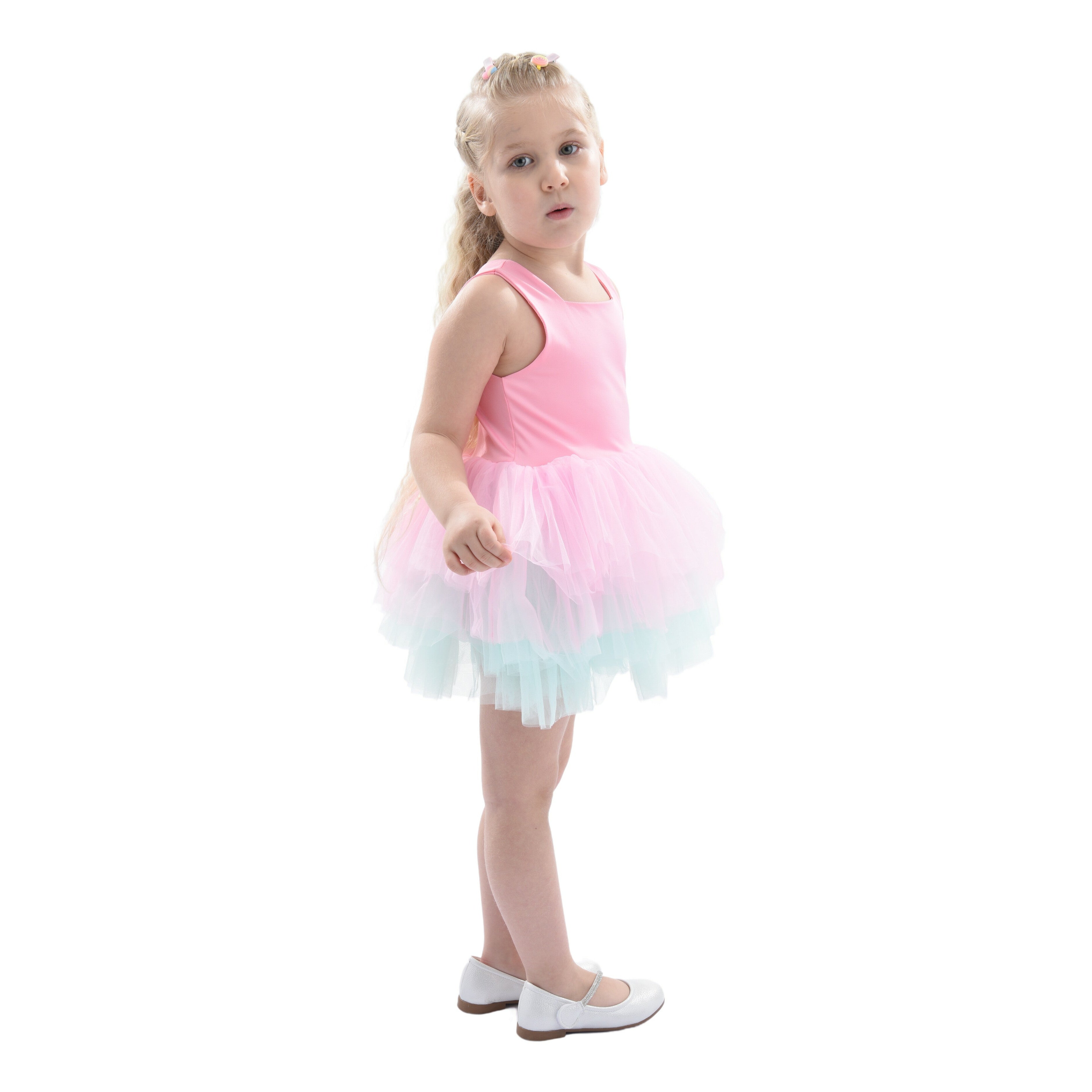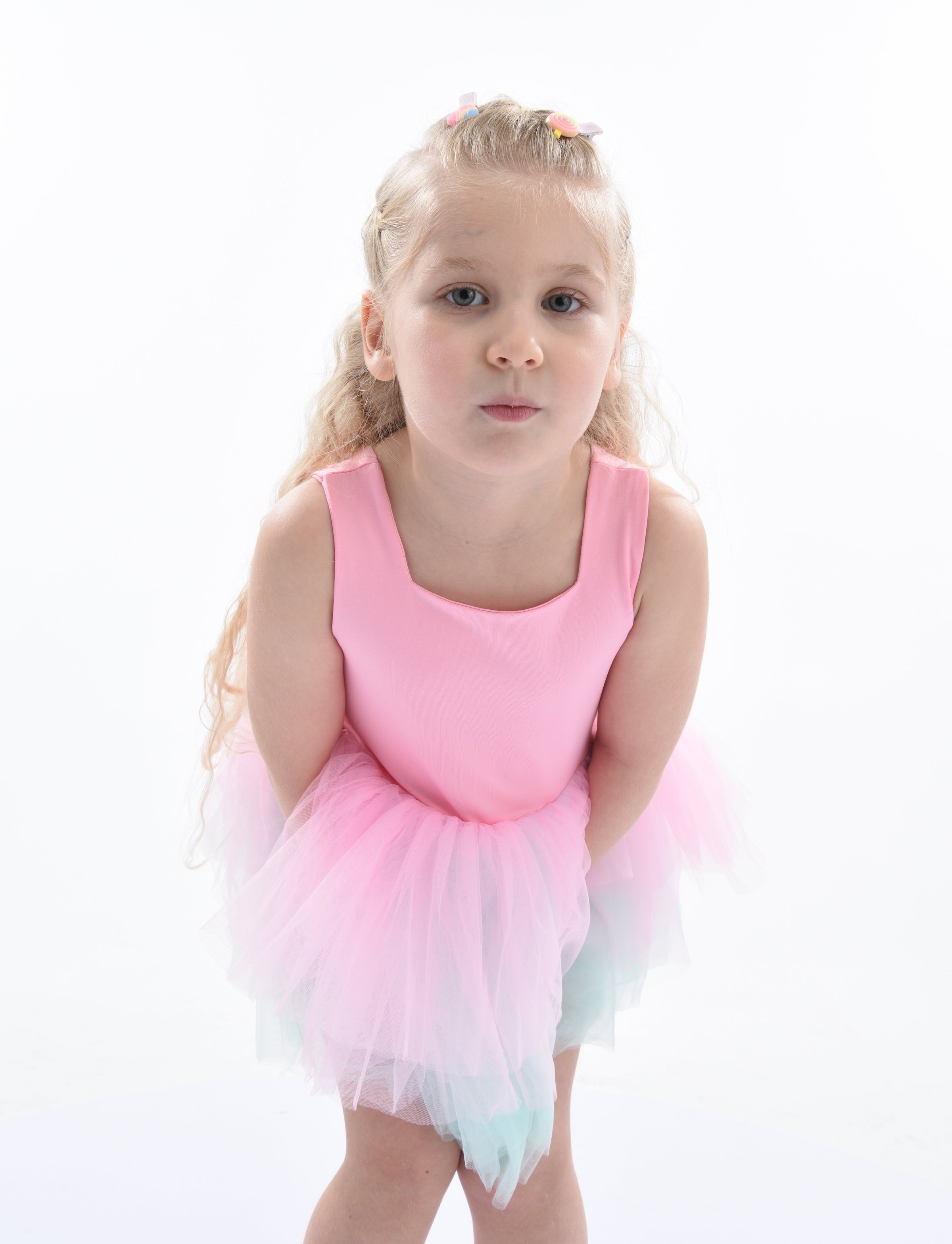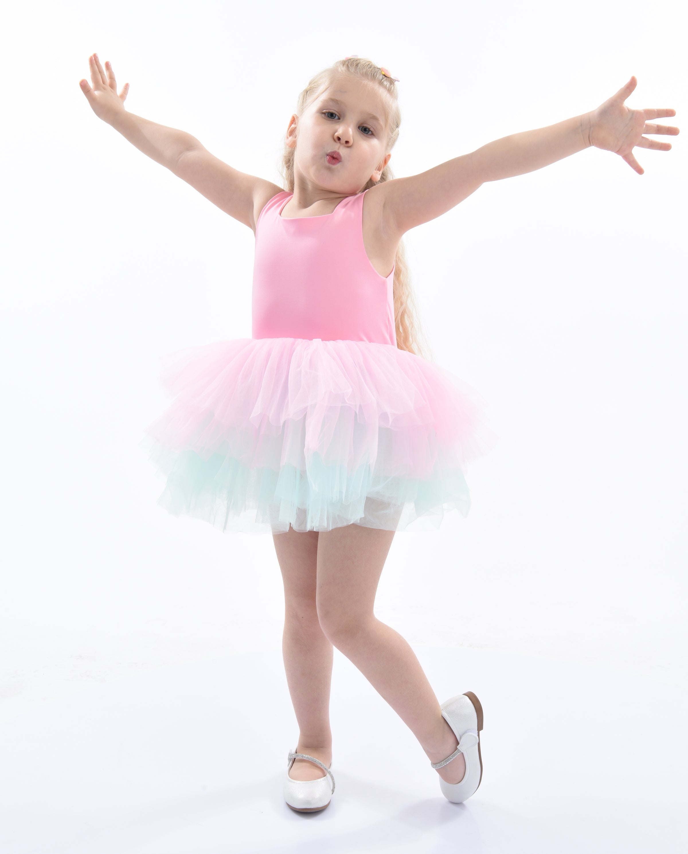 The Pink Bubblegum Eva tutu leotard dress for baby girls from Mimi Tutu is perfect for any special occasion. This dress features thin sleeves and a square neck, offering both style and comfort. The multiple layers of lightweight tulle give the dress a whimsical look, while the light blue tulle underlay adds a pop of color.