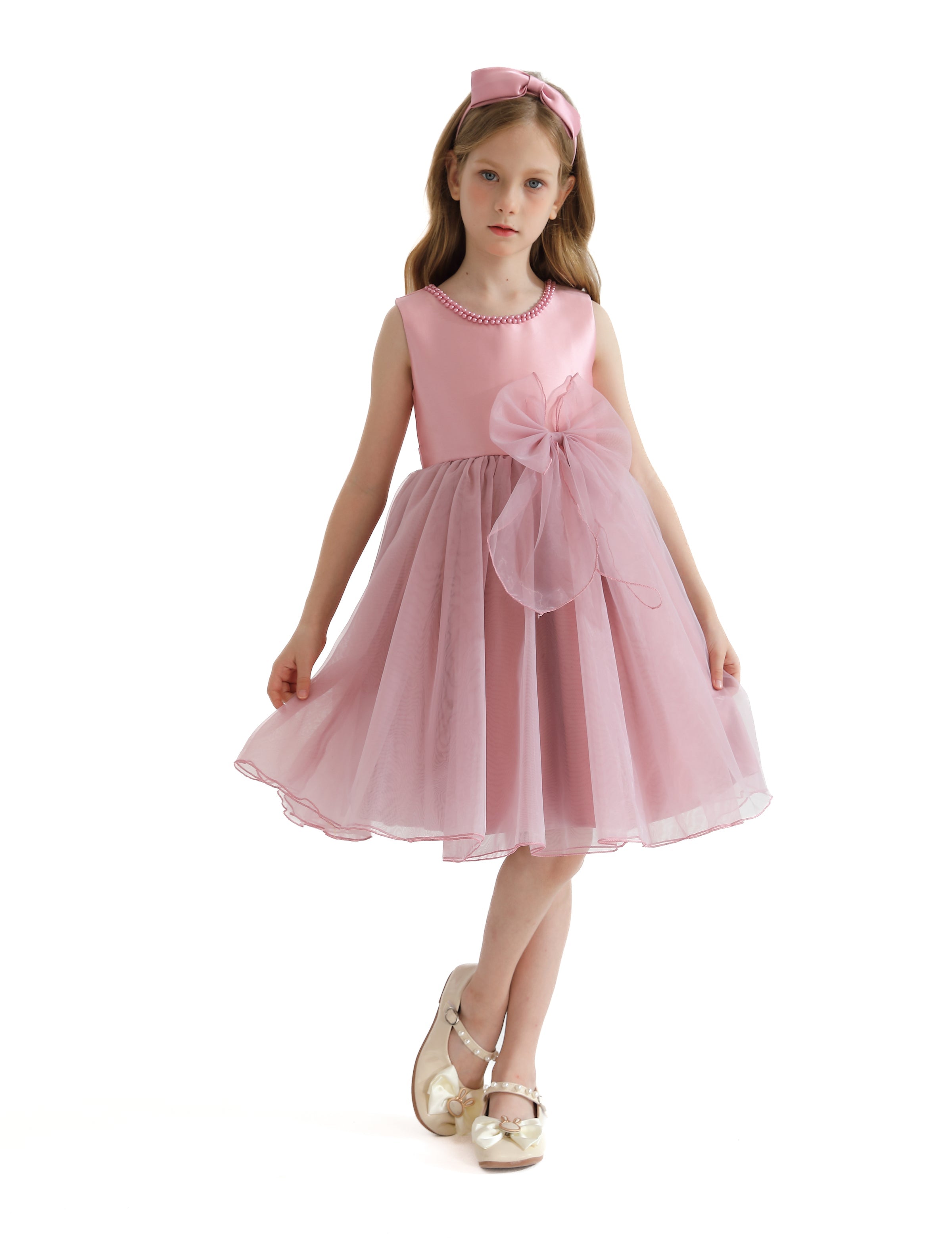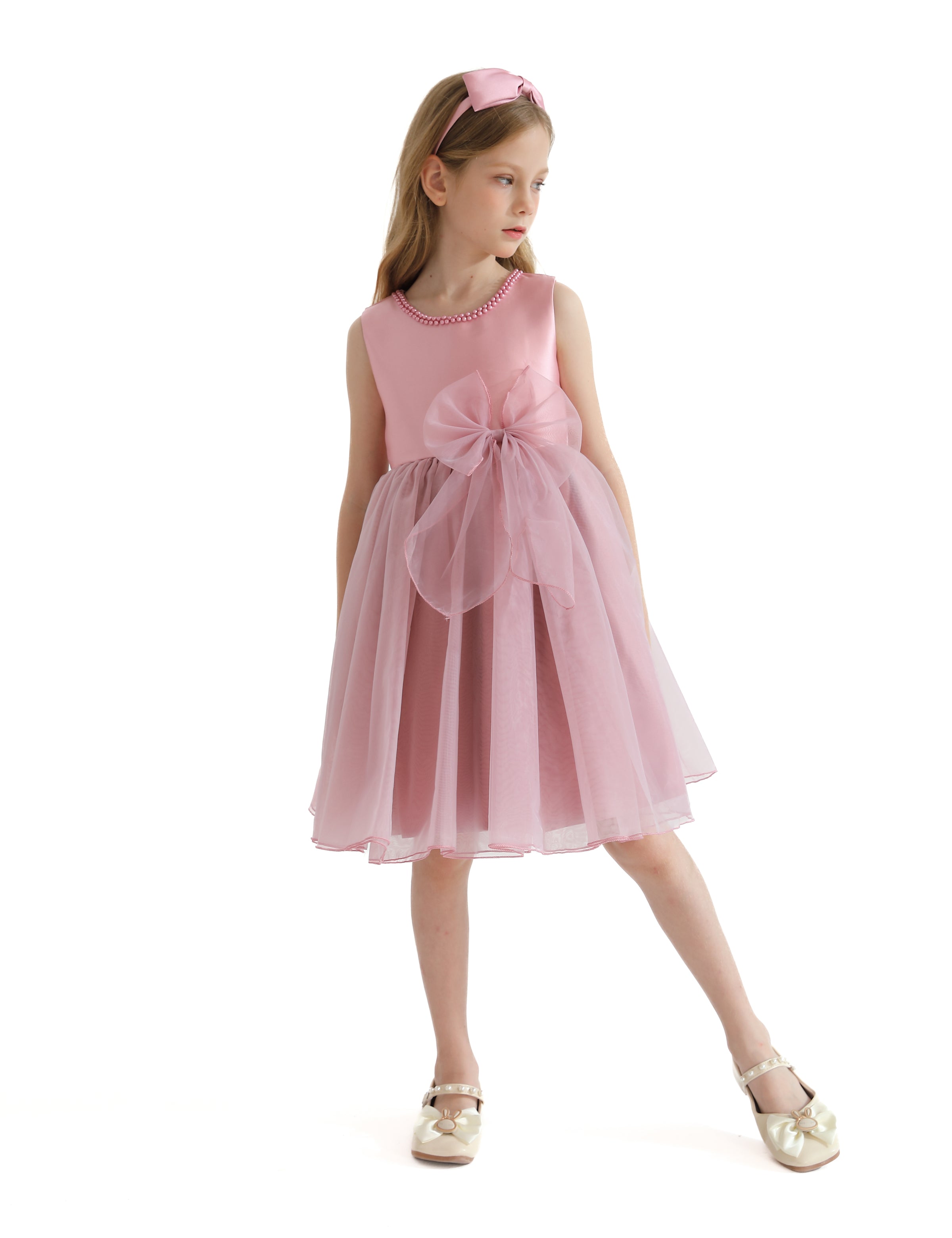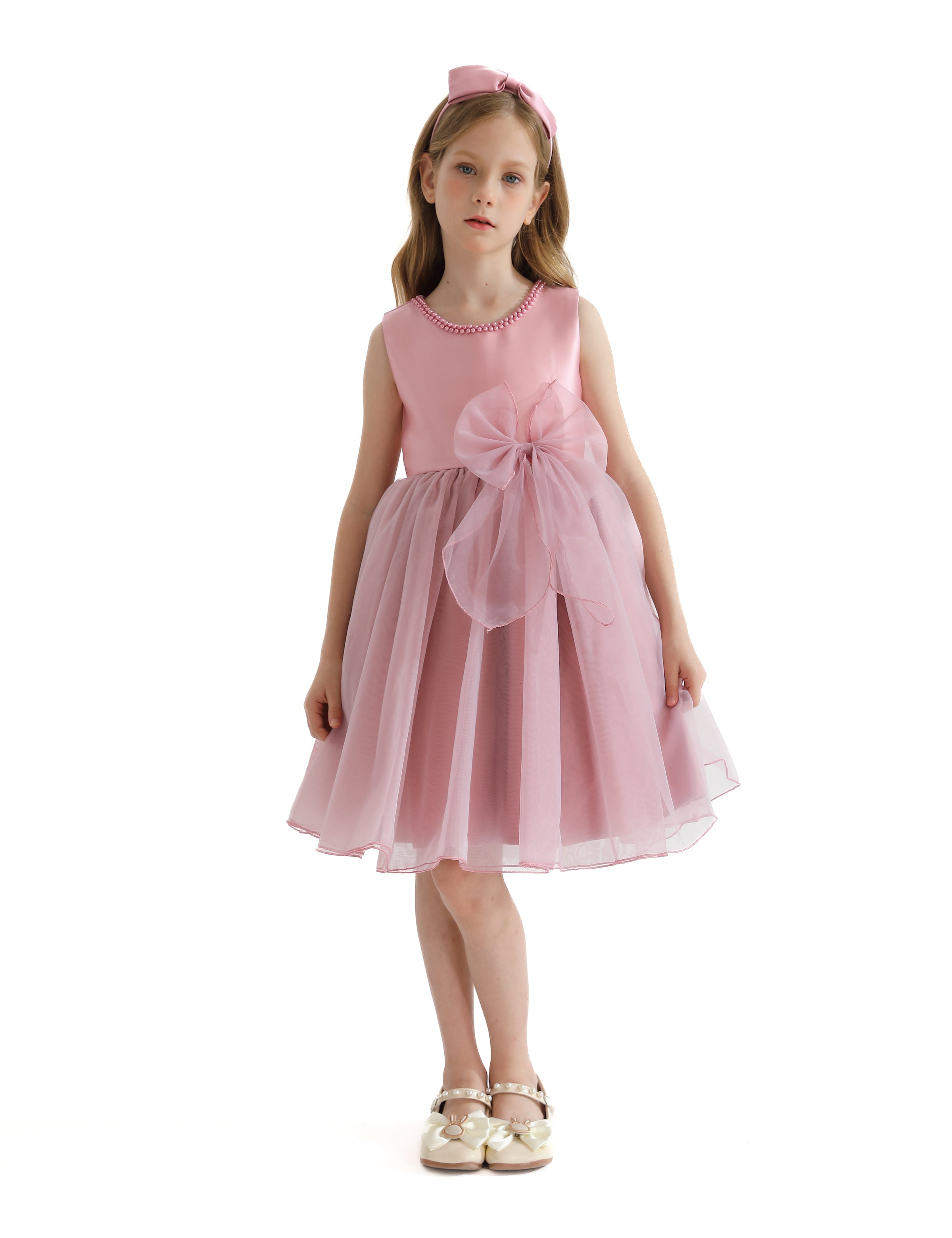The Pink Felice Tulle Bow Dress for kid girls from Tulleen is an exquisite and elegant choice for any special occasion. This dress features a sleeveless glimmer bodice that adds a touch of sparkle and sophistication. Firstly, the pearl trim along the bodice enhances the dress's luxurious and refined look.