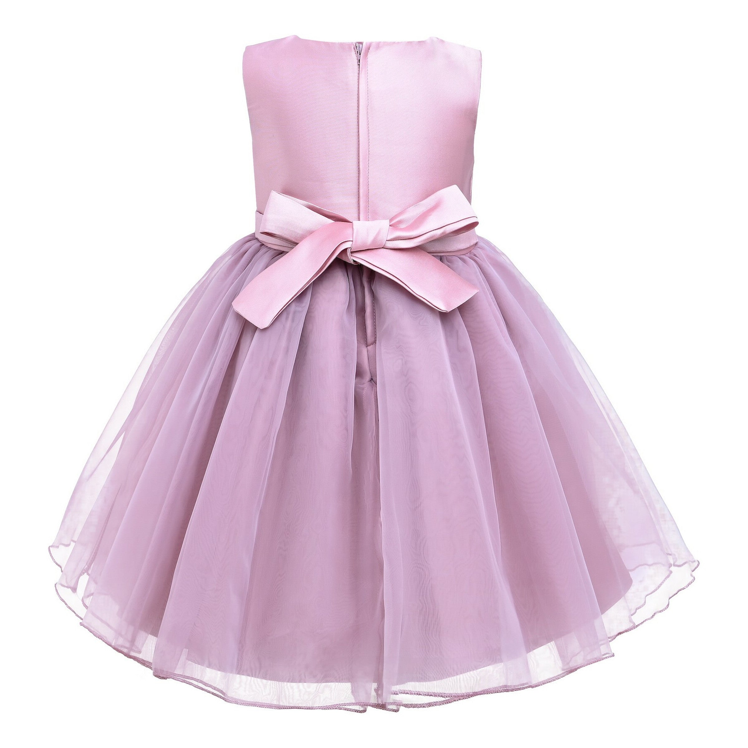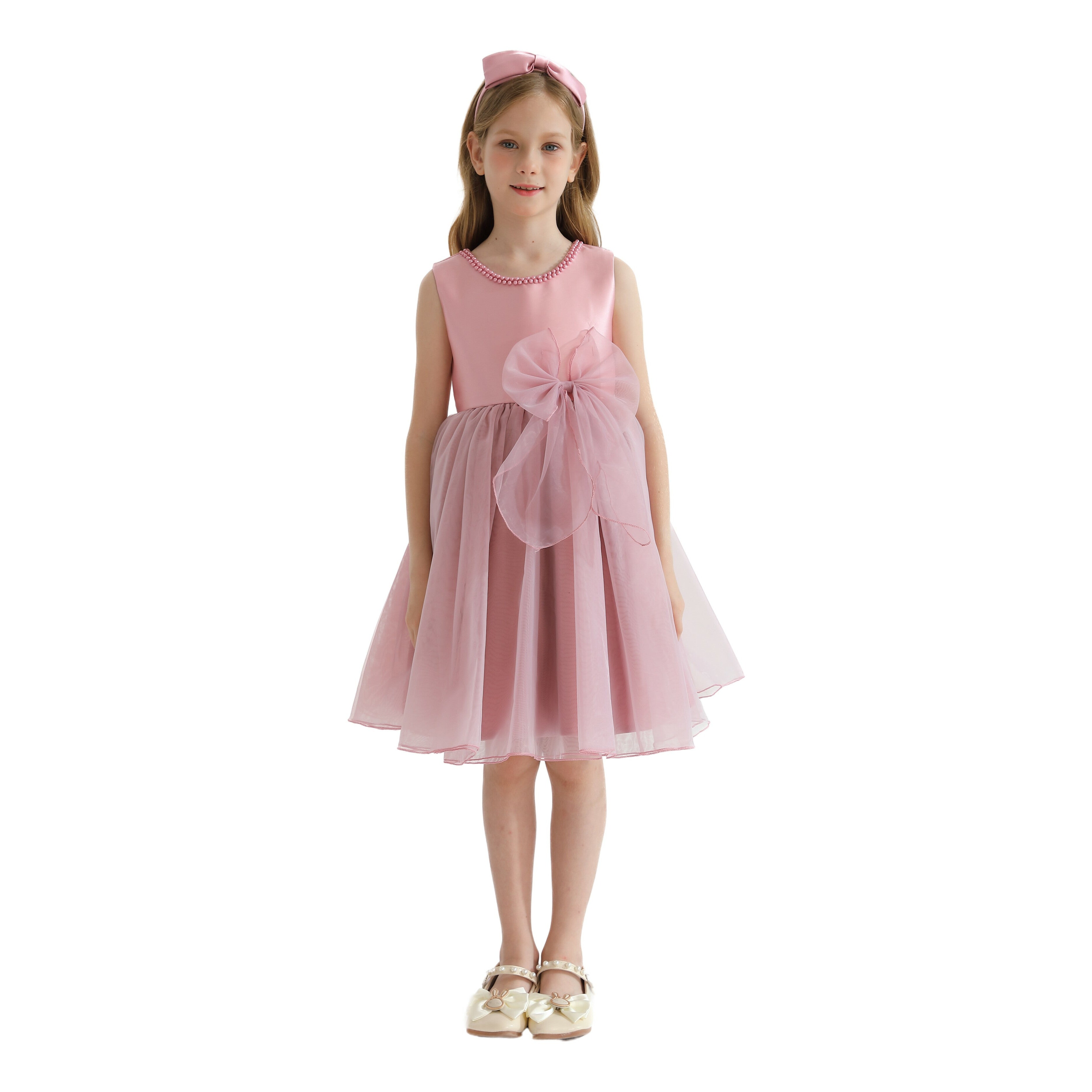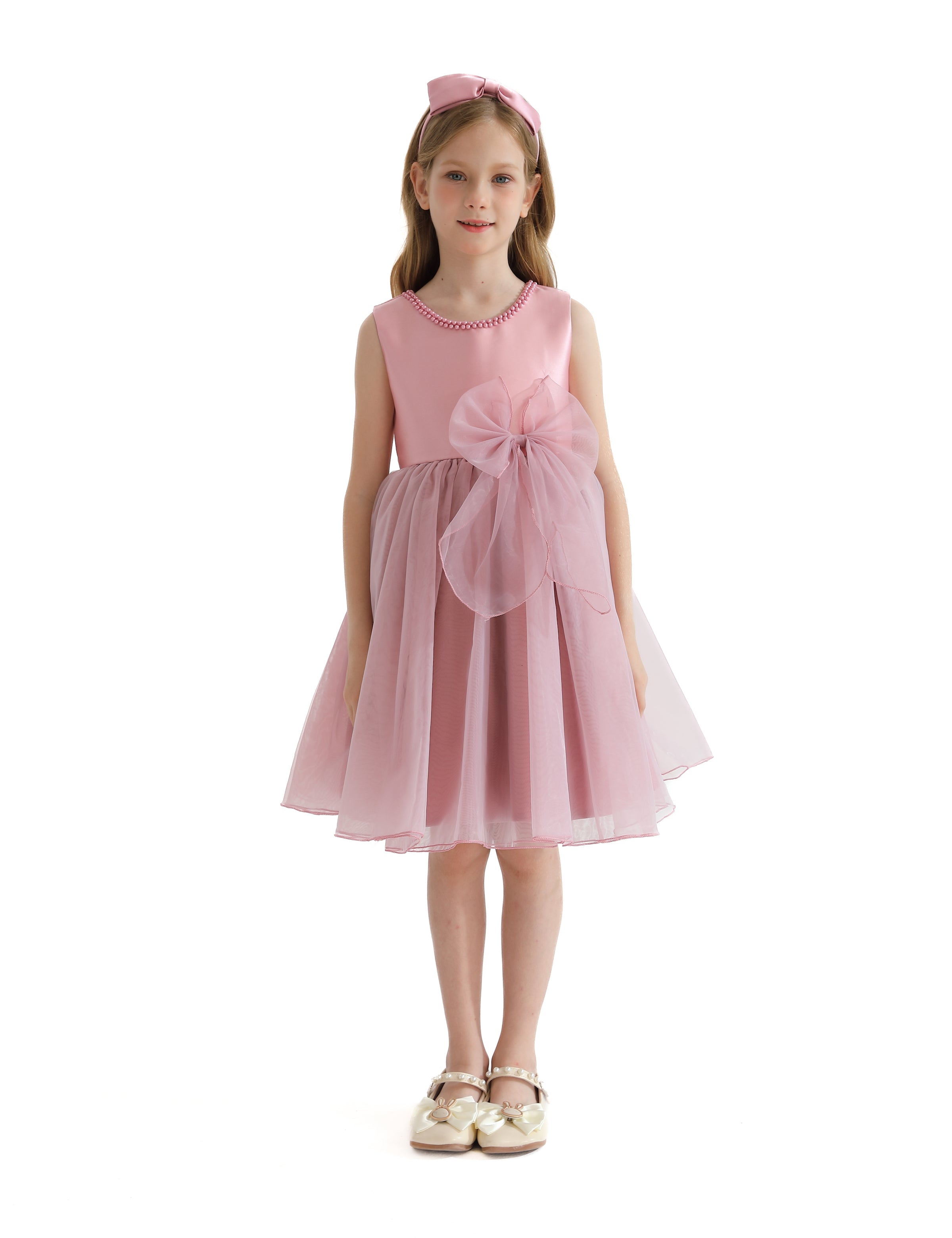 The Pink Felice Tulle Bow Dress for kid girls from Tulleen is an exquisite and elegant choice for any special occasion. This dress features a sleeveless glimmer bodice that adds a touch of sparkle and sophistication. Firstly, the pearl trim along the bodice enhances the dress's luxurious and refined look.