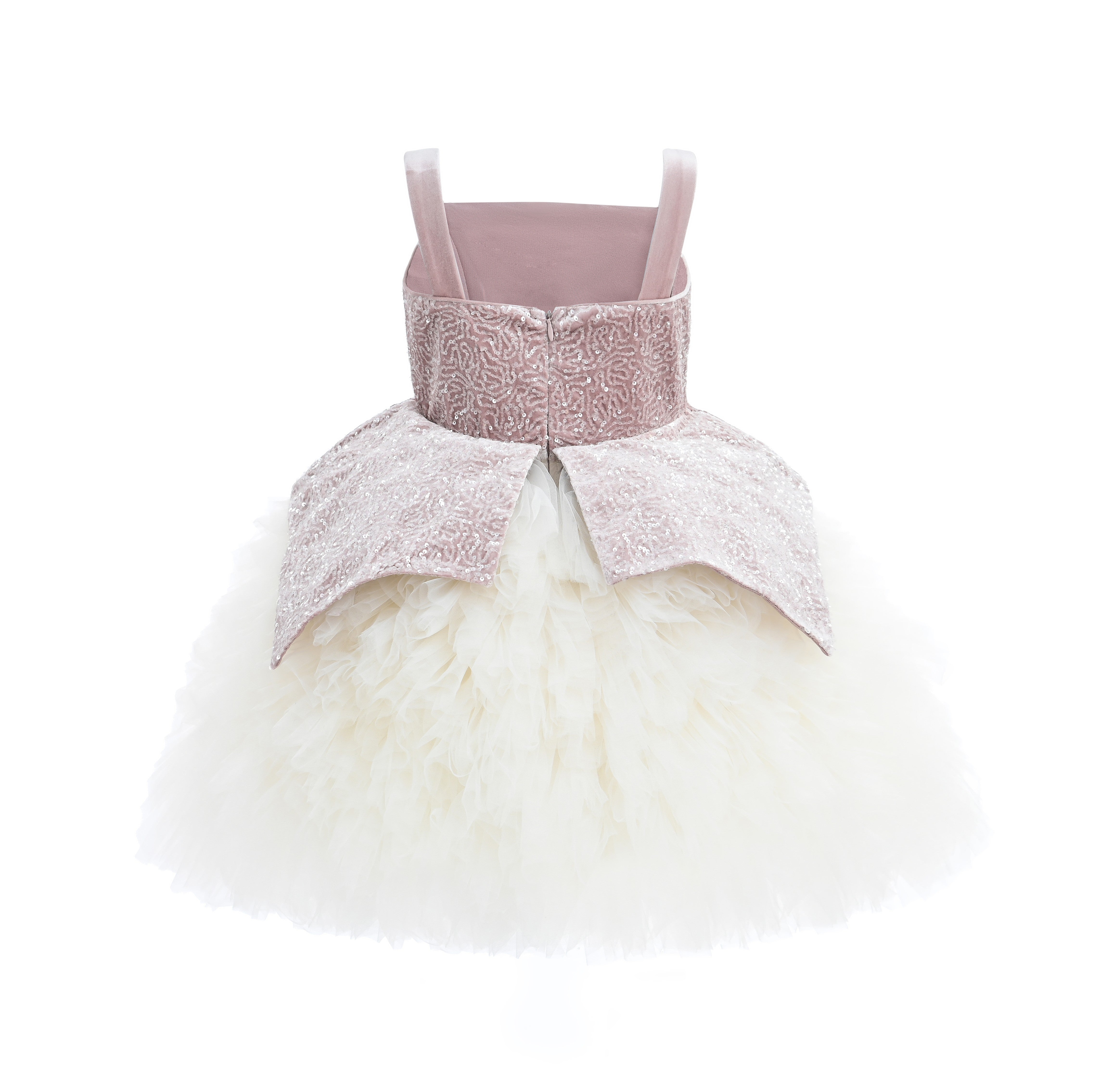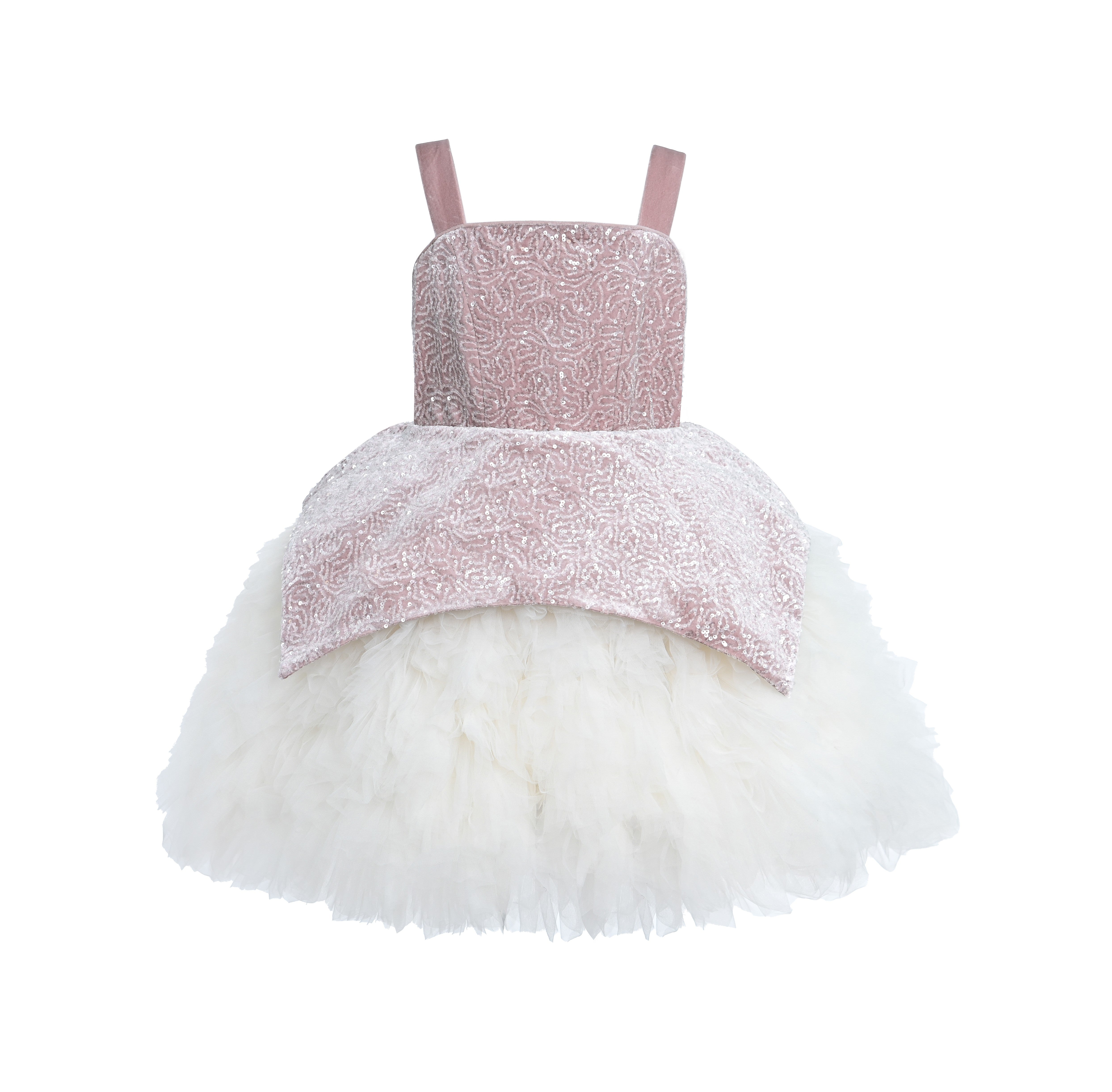A charming blend of sparkle and softness, this dress features a glittery pink bodice and a cloud-like white tulle skirt—perfect for parties, portraits, and twirl-worthy moments.