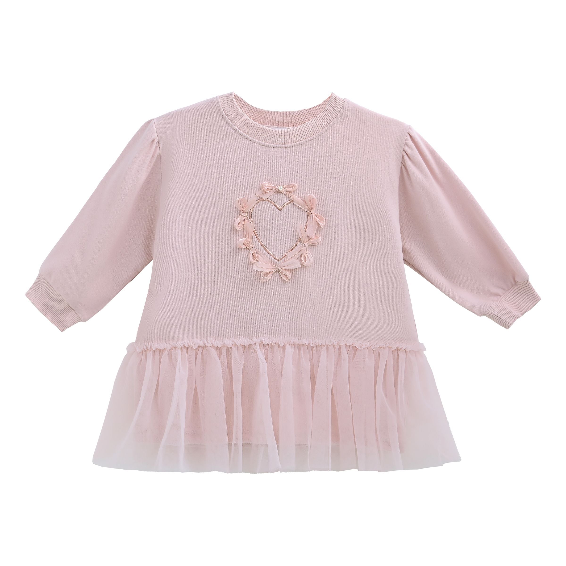 The Pink Heart Bow Dress radiates playful elegance with its soft hue and charming heart pattern. A dainty bow detail adds a sweet finishing touch to the classic silhouette, making it both fun and feminine.