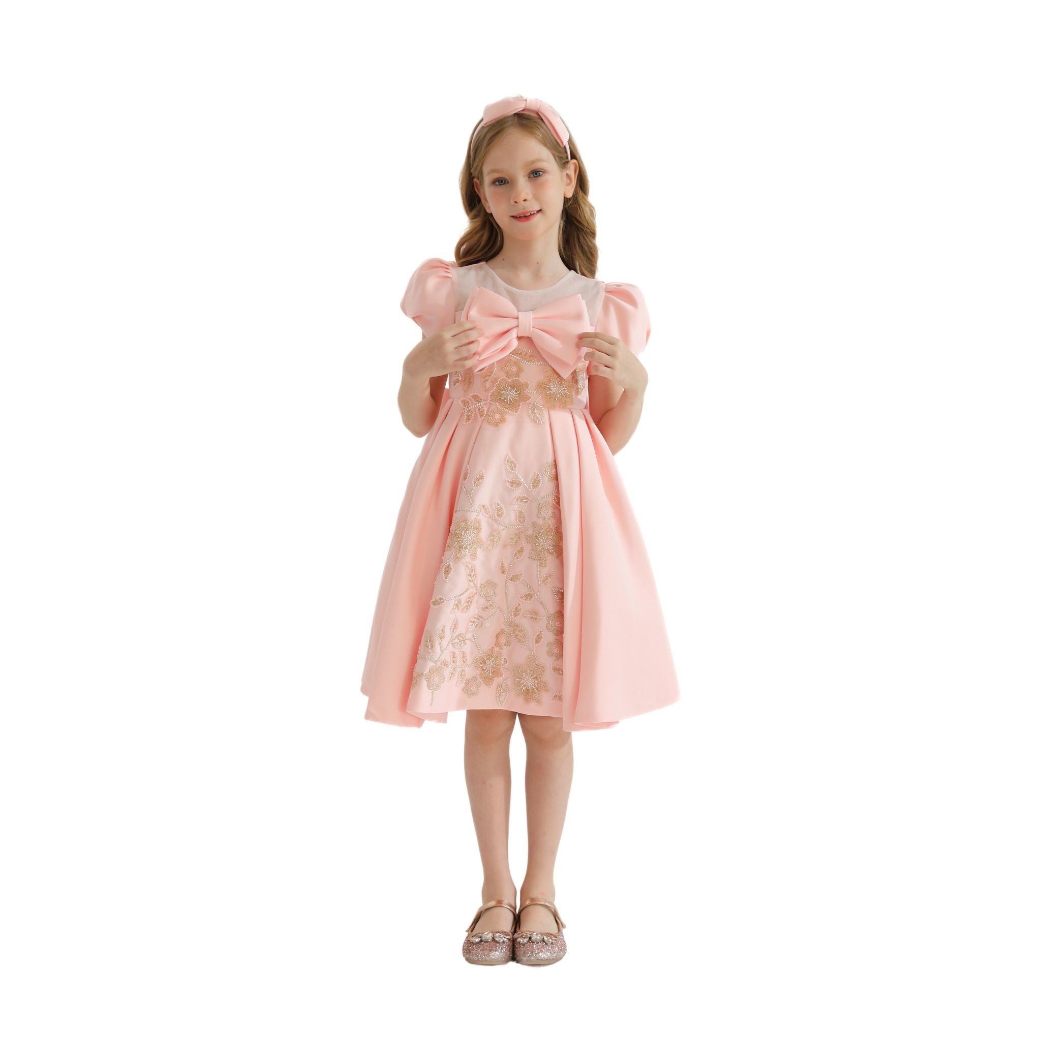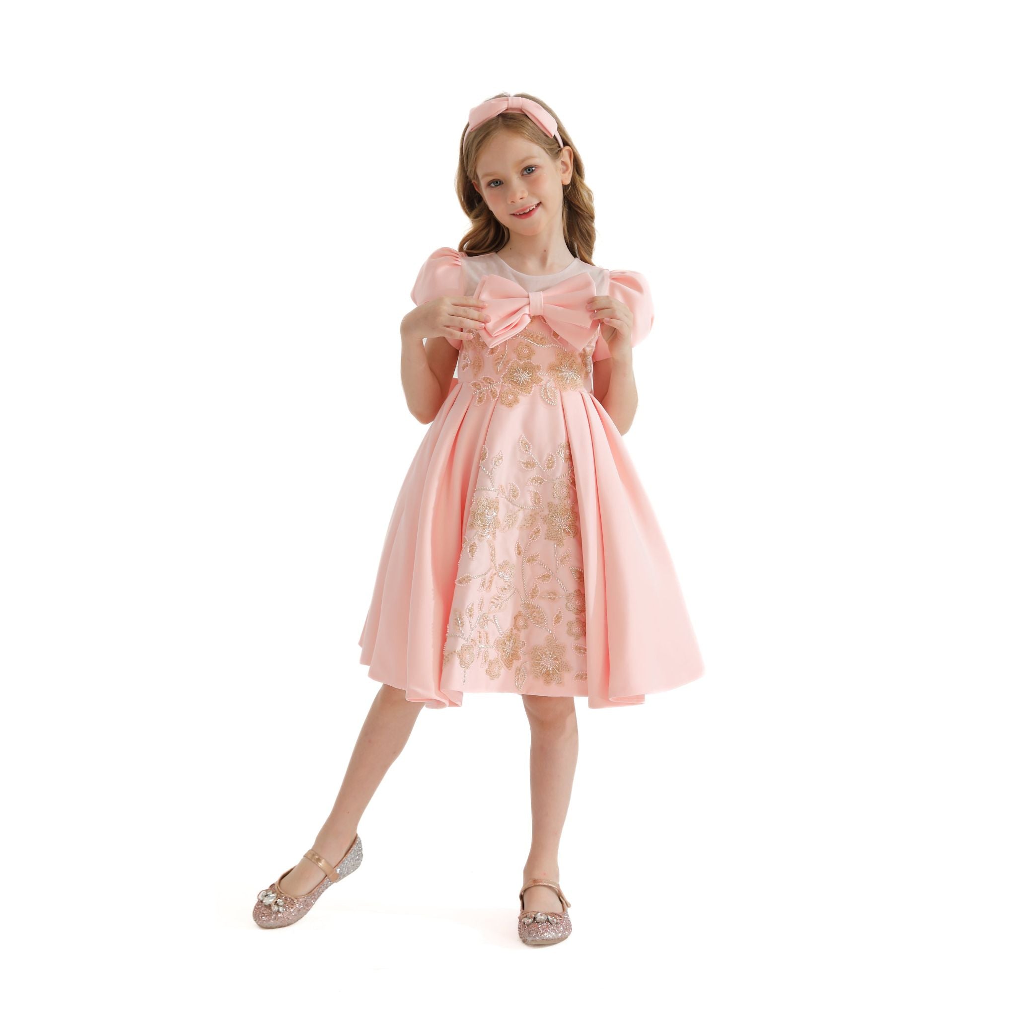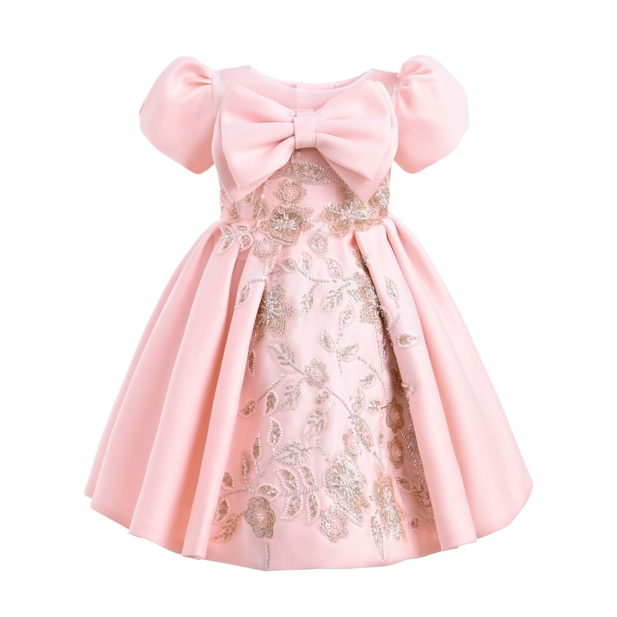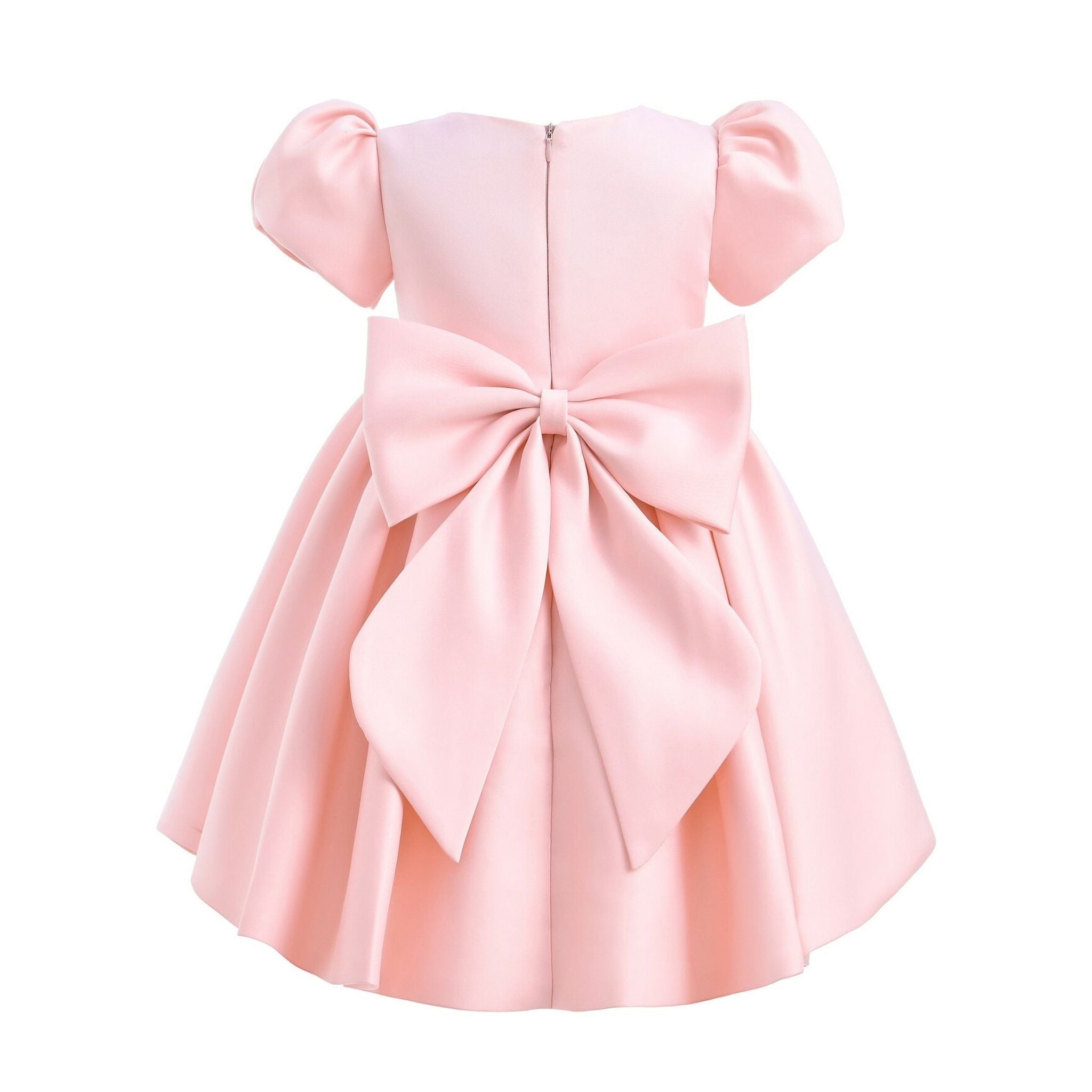 The Pink Leona Floral Teacup Bow Dress for kid girls from Tulleen is an exquisite choice for any special occasion. This dress features a charming teacup puff shoulder design that adds a touch of vintage-inspired elegance. Firstly, the large bows on the bodice and the back enhance the dress's sophisticated look, providing a striking and stylish accent.