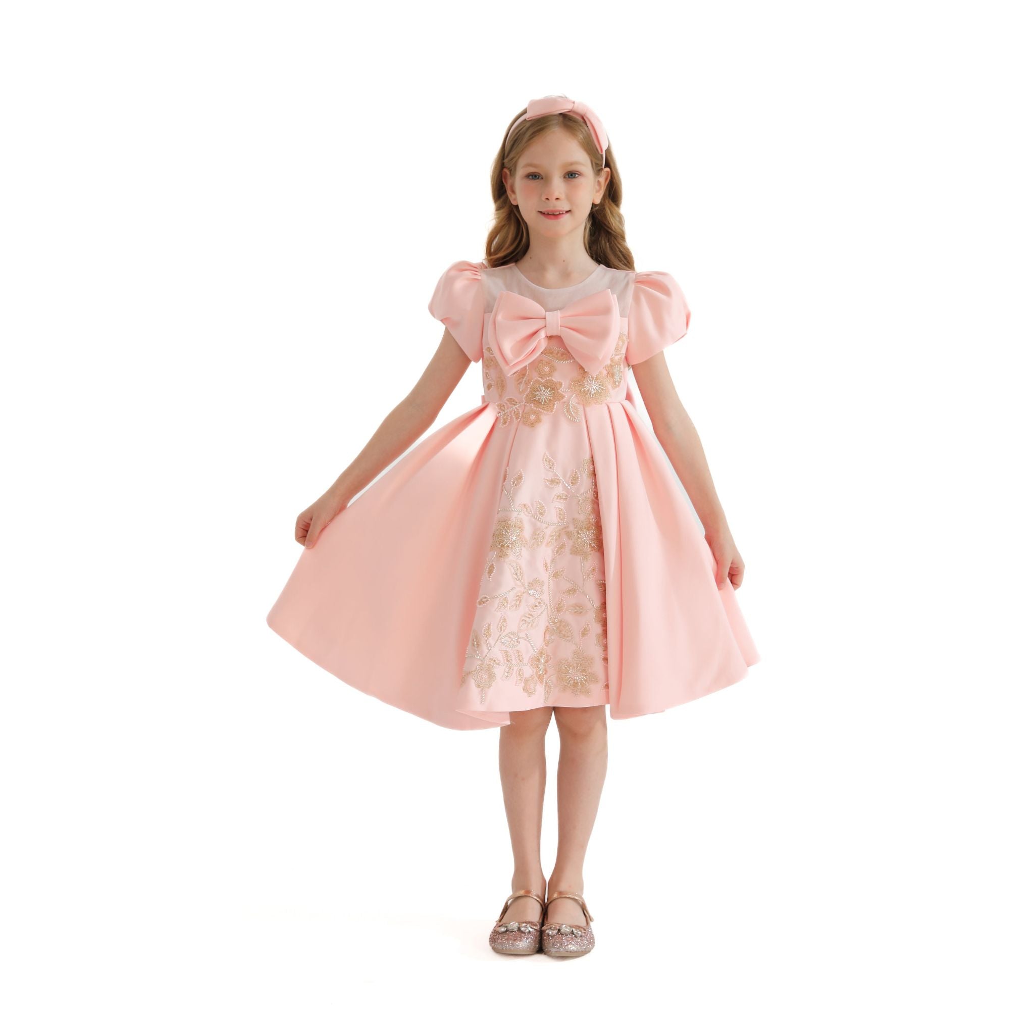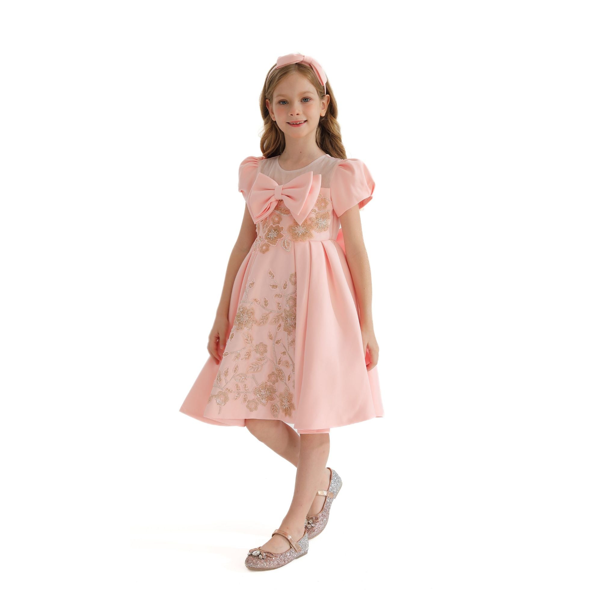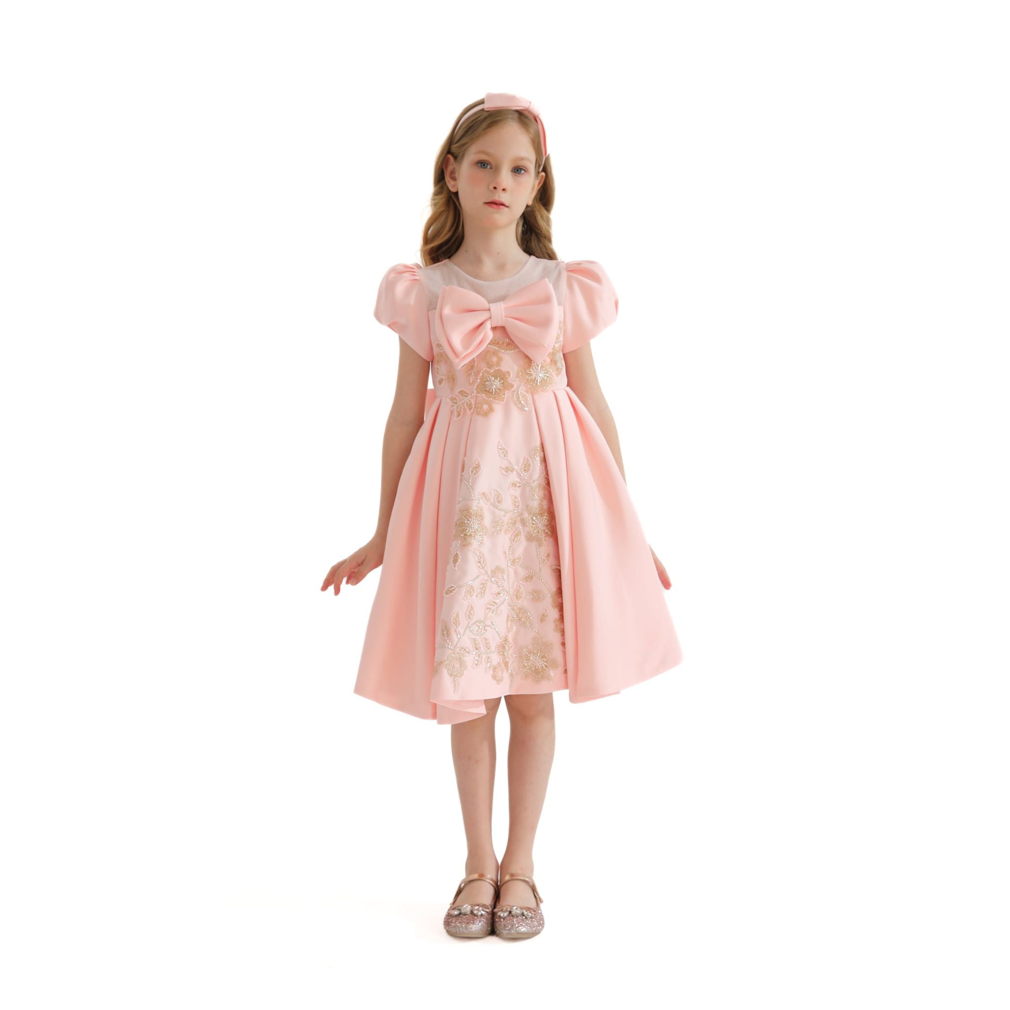 The Pink Leona Floral Teacup Bow Dress for kid girls from Tulleen is an exquisite choice for any special occasion. This dress features a charming teacup puff shoulder design that adds a touch of vintage-inspired elegance. Firstly, the large bows on the bodice and the back enhance the dress's sophisticated look, providing a striking and stylish accent.