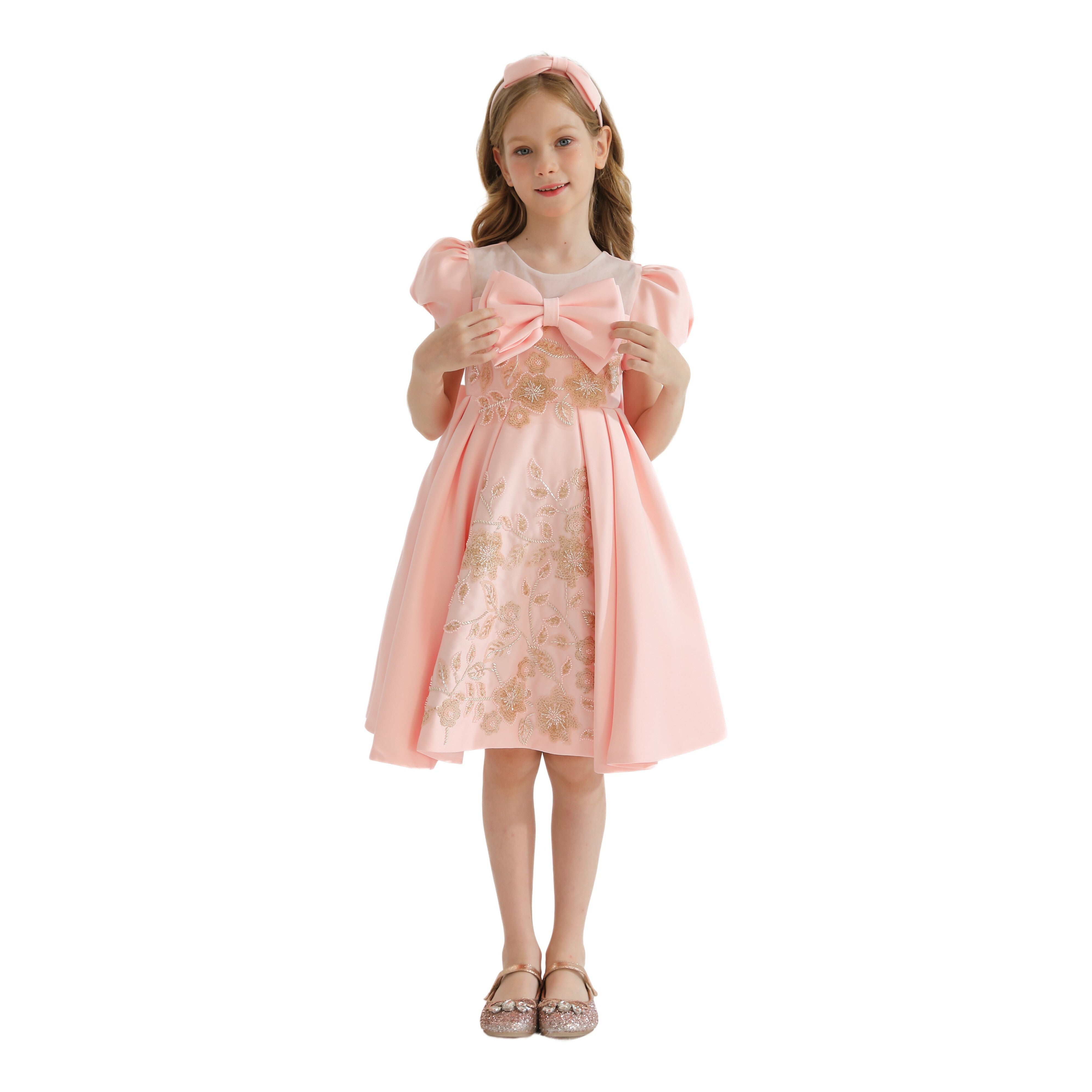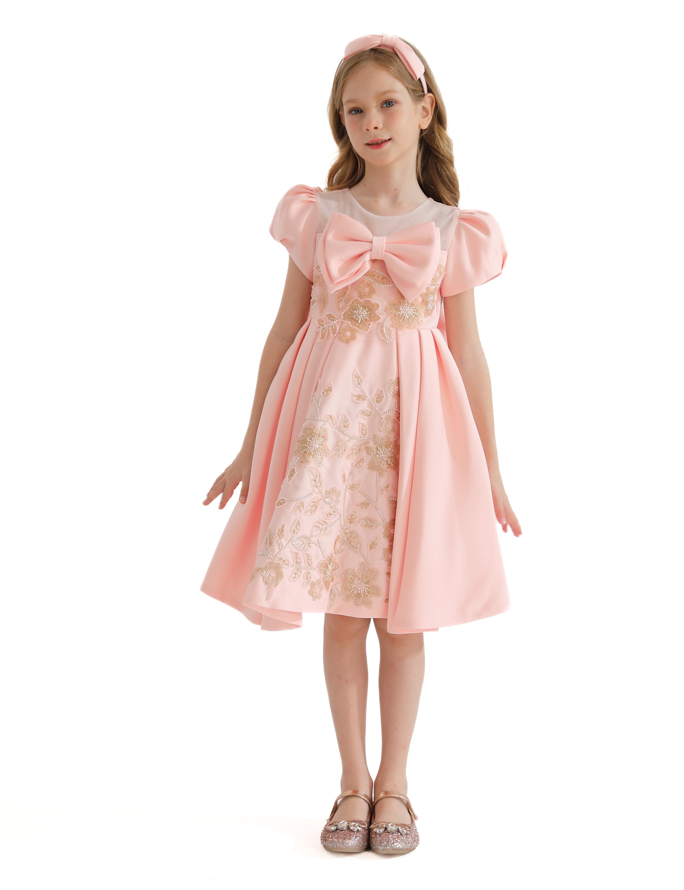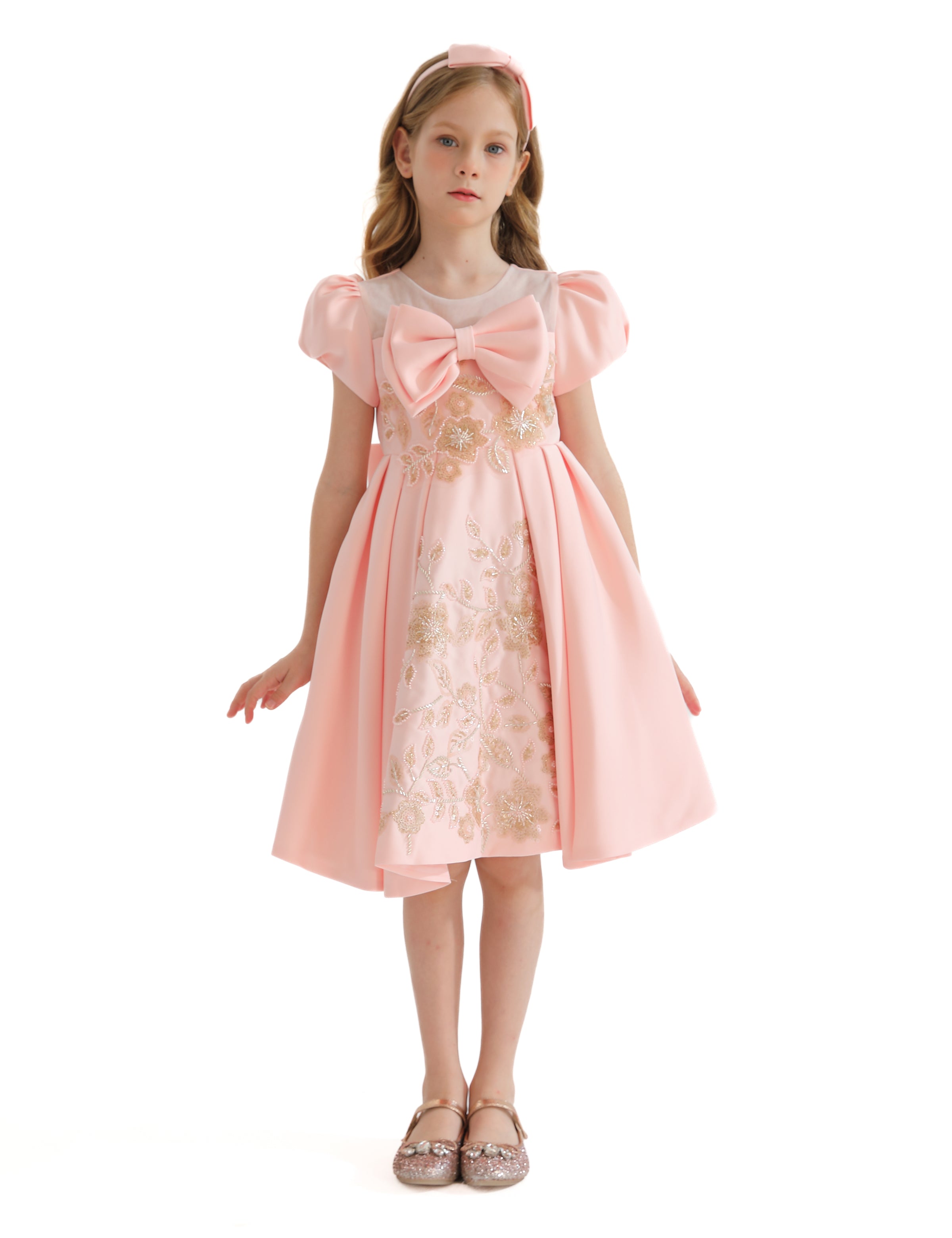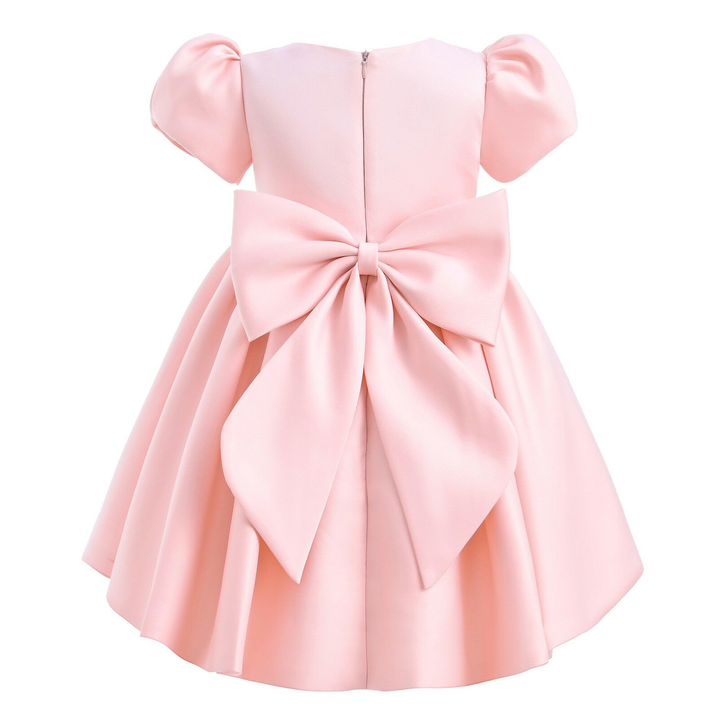 The Pink Leona Floral Teacup Bow Dress for kid girls from Tulleen is an exquisite choice for any special occasion. This dress features a charming teacup puff shoulder design that adds a touch of vintage-inspired elegance. Firstly, the large bows on the bodice and the back enhance the dress's sophisticated look, providing a striking and stylish accent.
