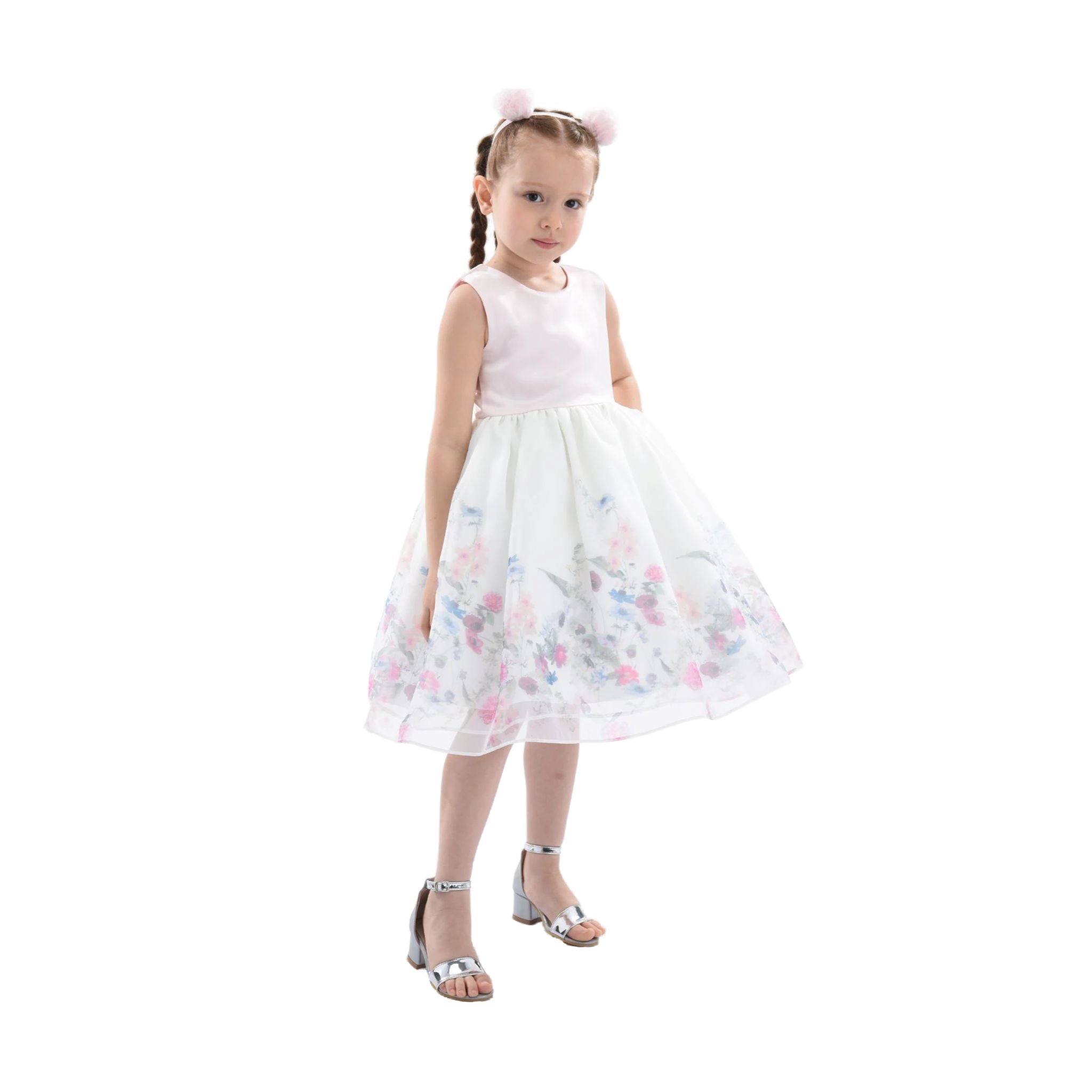 The Pink Mabel Floral Garden Organza Dress for kid girls from Tulleen is an exquisite choice for any special occasion. This dress features a sleeveless satin round neck bodice that offers both comfort and elegance. Moreover, the magical centerpiece of this dress lies in its dreamy white lightweight tulle skirt, adorned with a mesmerizing floral garden design.