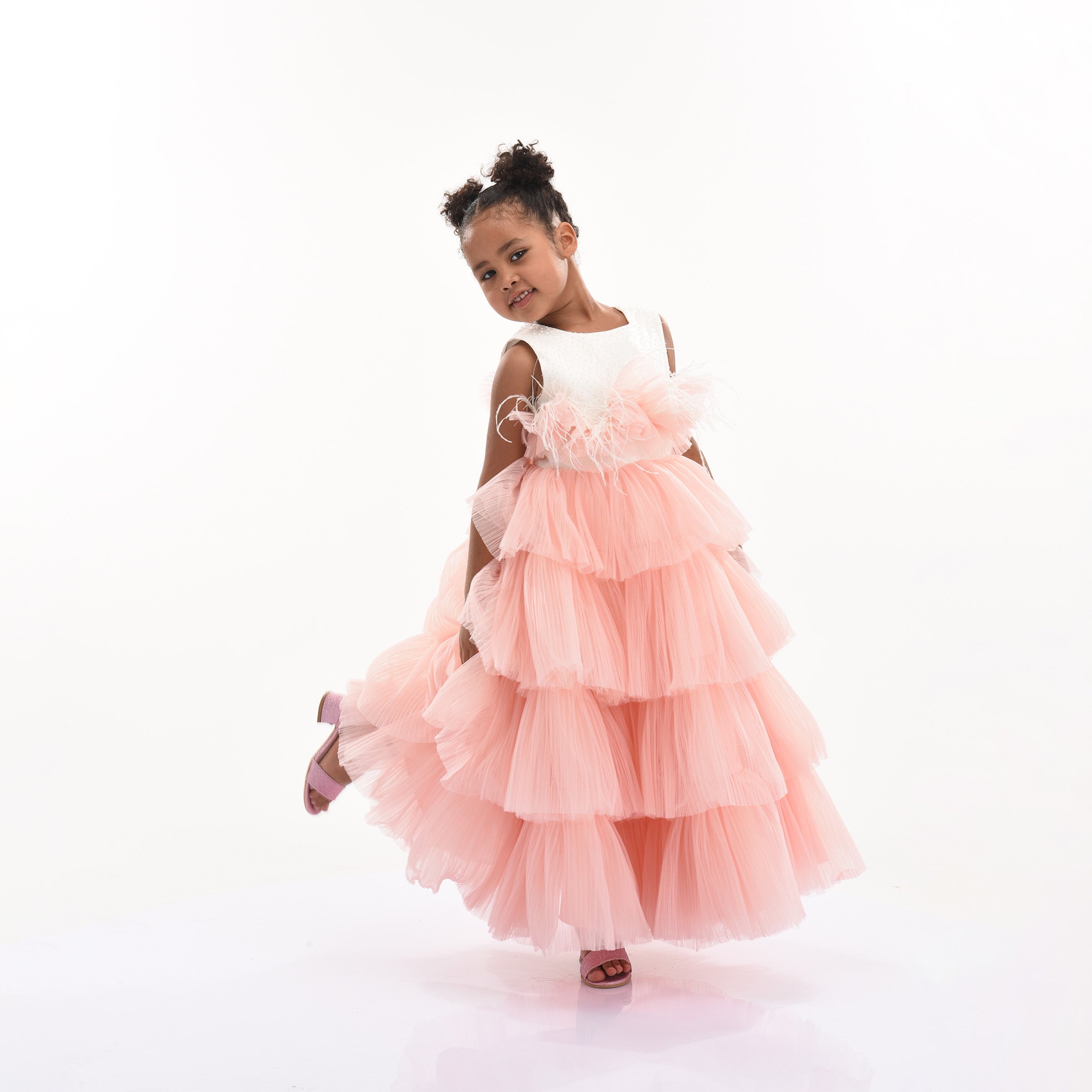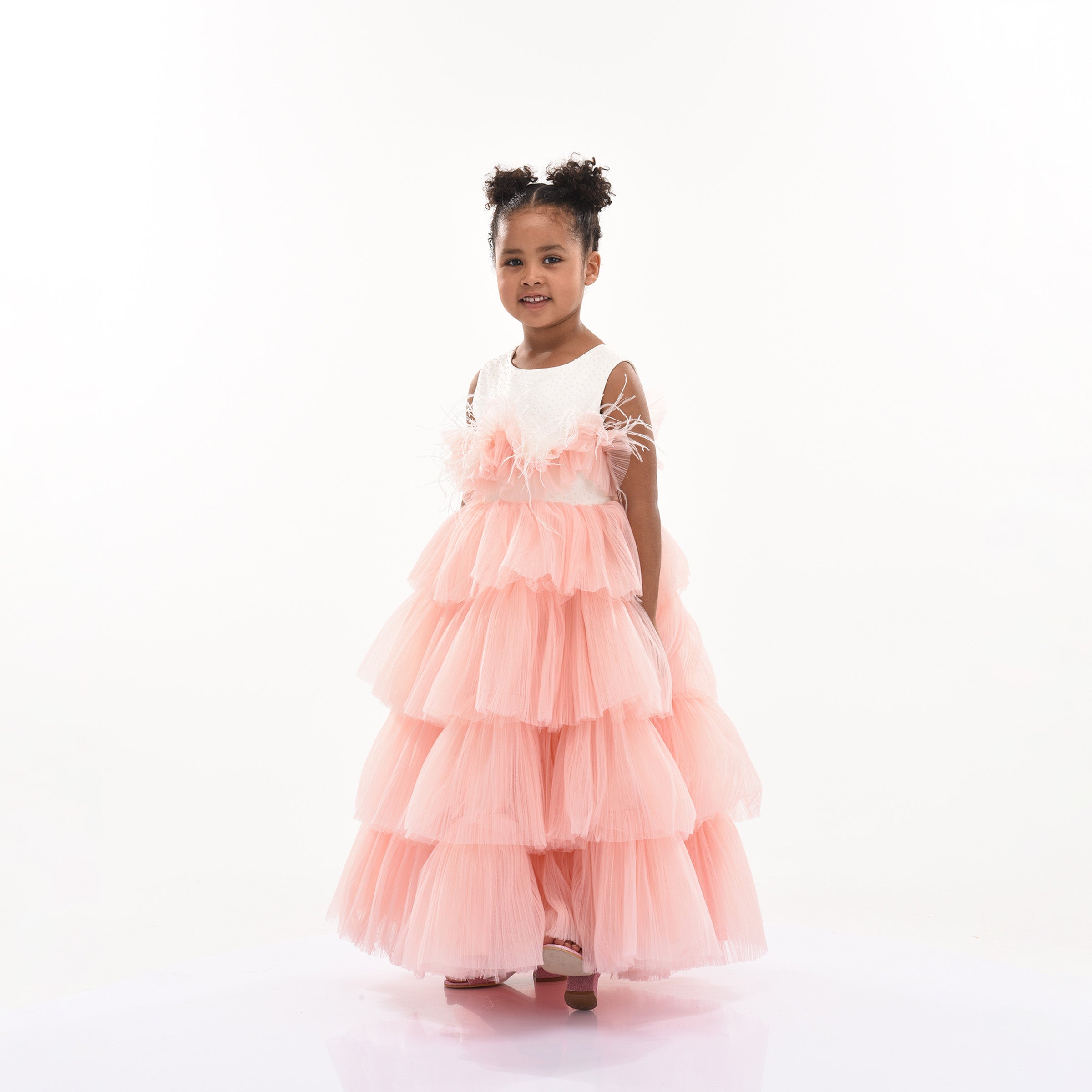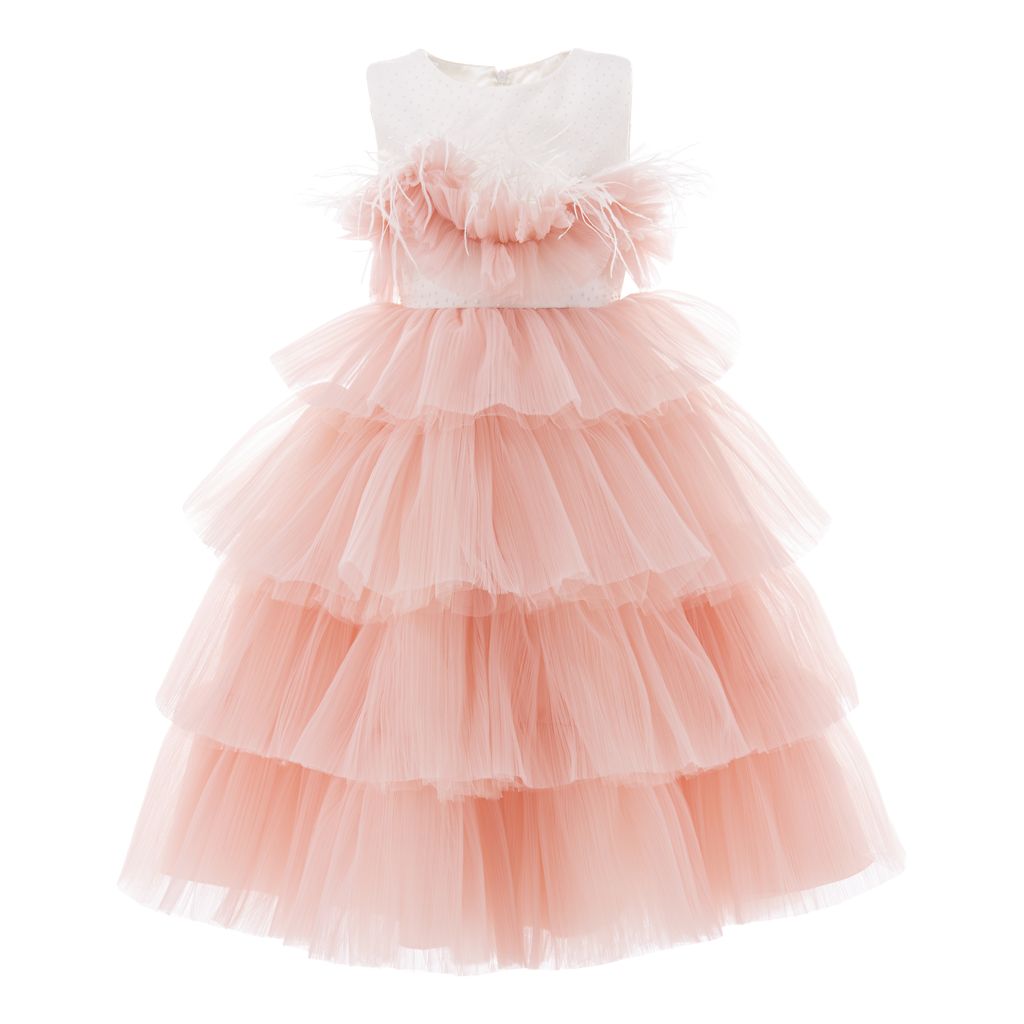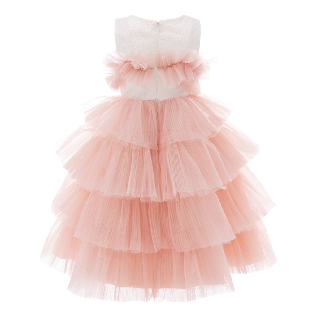 The Pink Madera Sleeveless Tiered Tulle Dress for kid girls from Tulleen is a beautiful and elegant piece perfect for any special occasion. This dress features an ivory sleeveless cut bodice, providing a timeless and classic look. The ruffle belt across the hem adds a touch of charm and sophistication, seamlessly leading to a lightweight and flowy tiered pink tulle skirt.