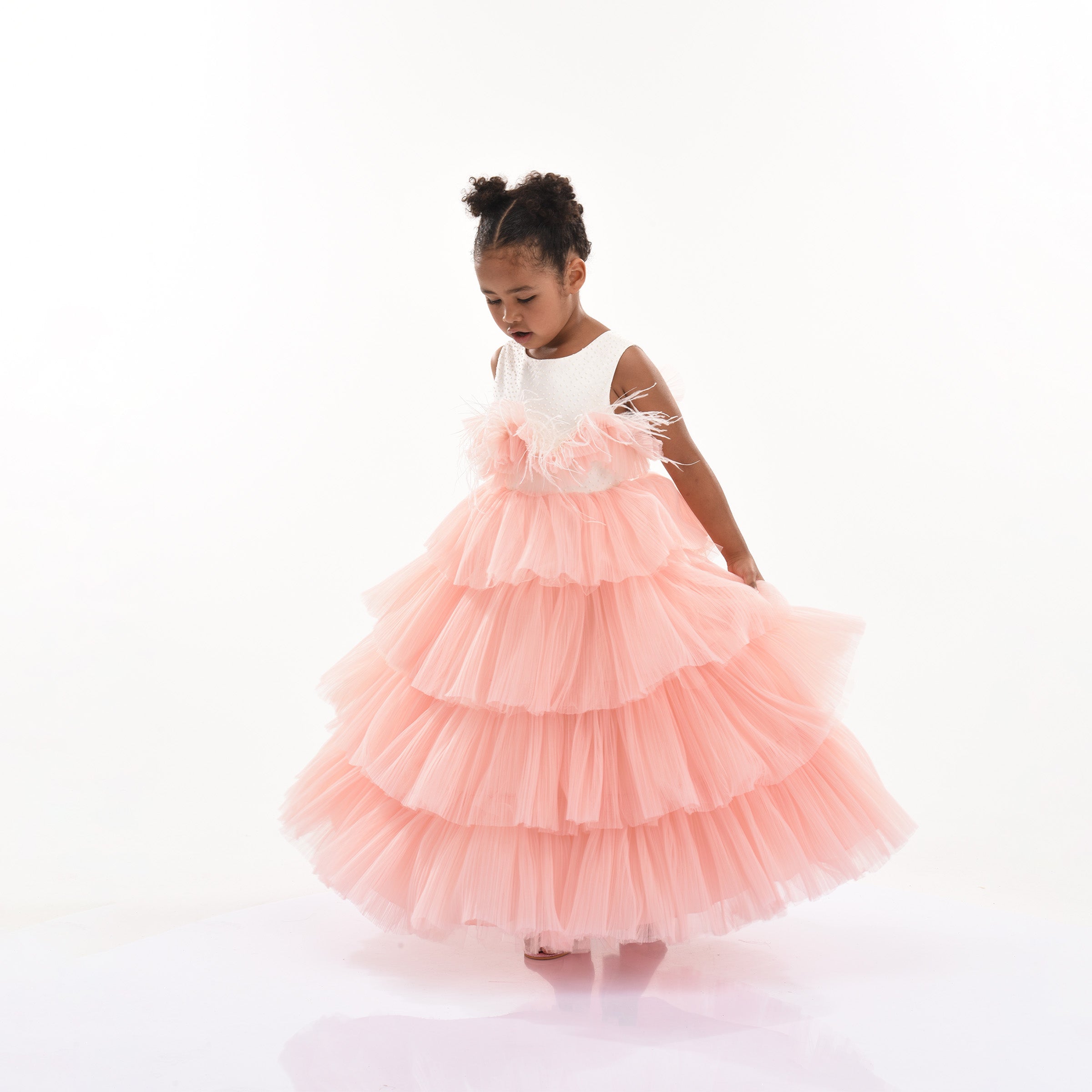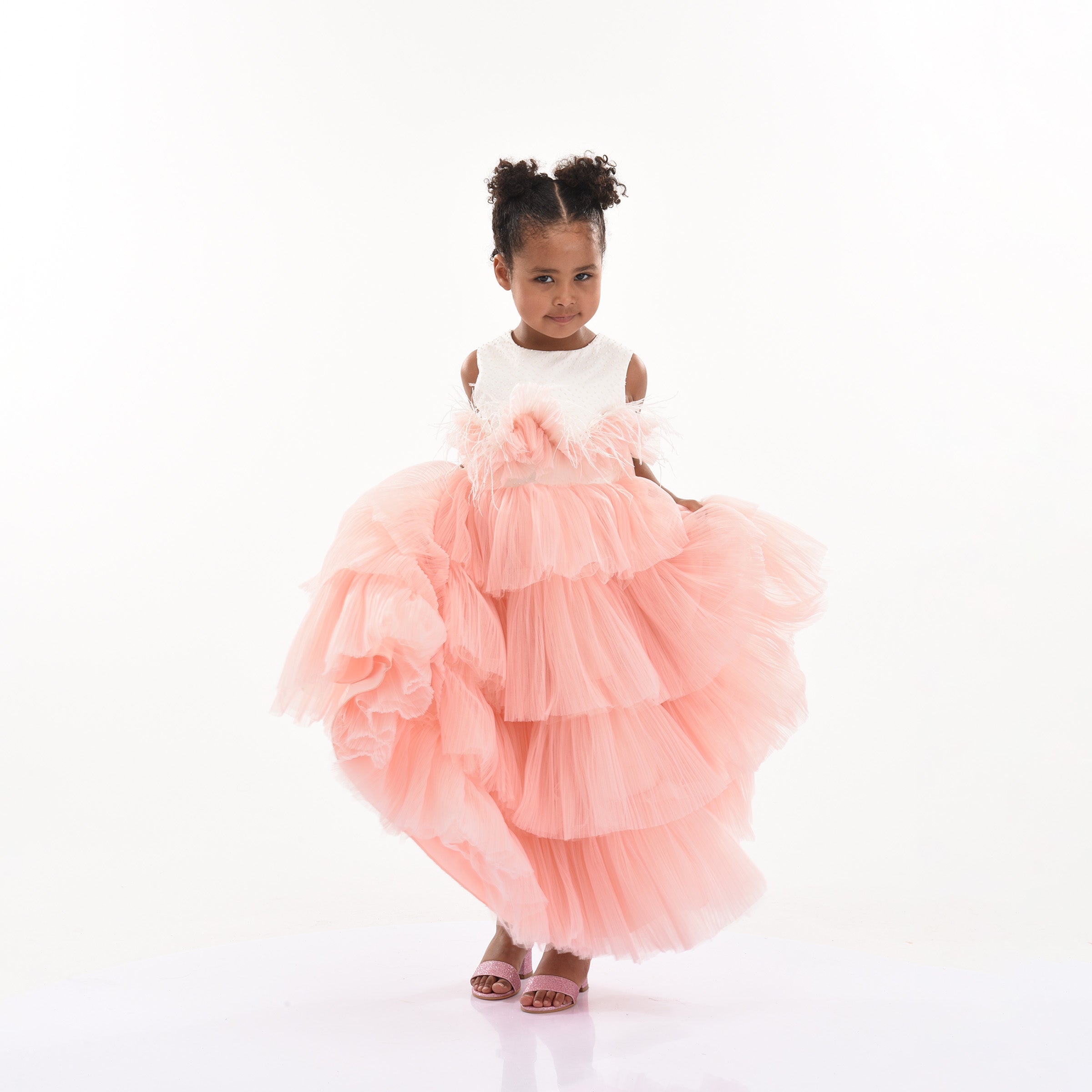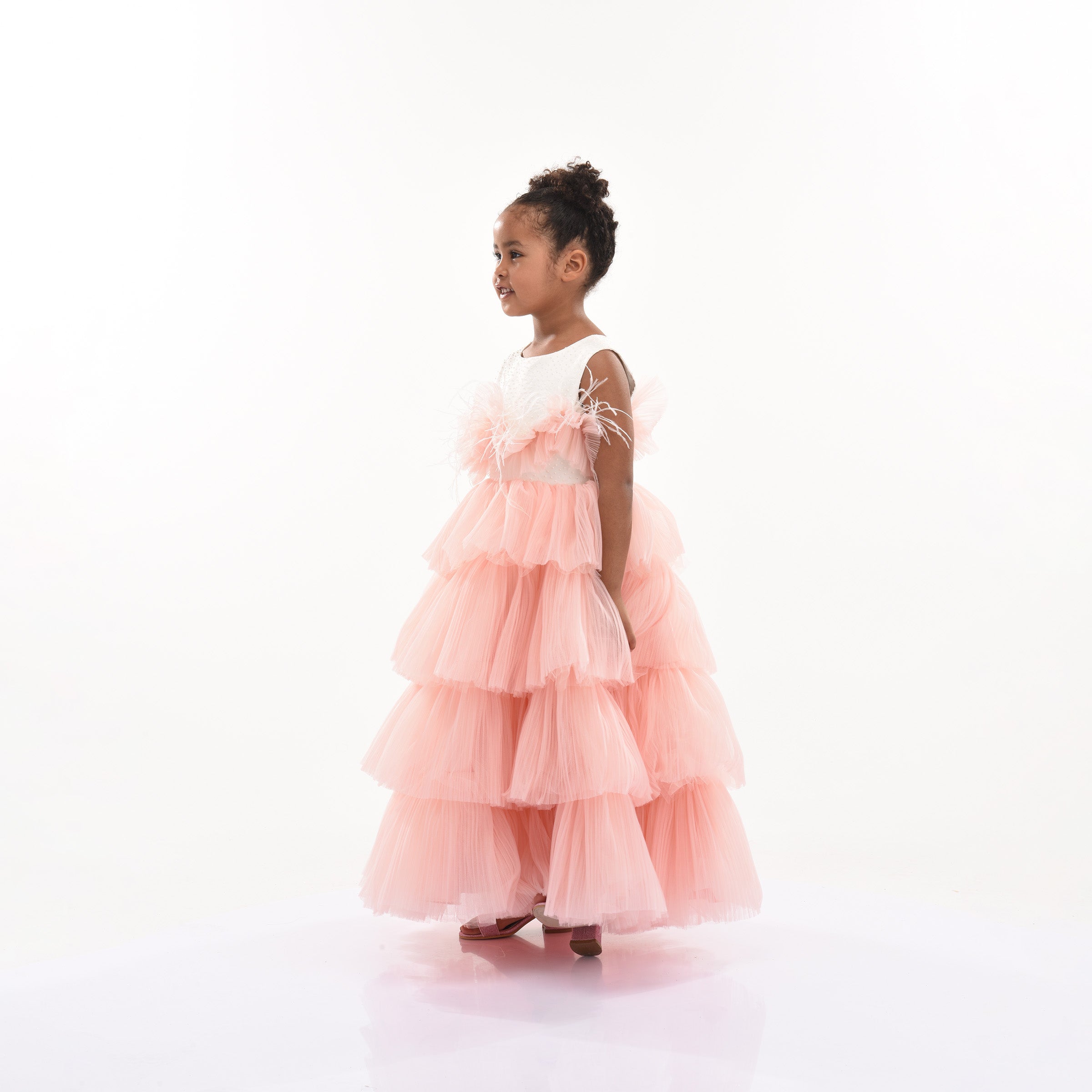 The Pink Madera Sleeveless Tiered Tulle Dress for kid girls from Tulleen is a beautiful and elegant piece perfect for any special occasion. This dress features an ivory sleeveless cut bodice, providing a timeless and classic look. The ruffle belt across the hem adds a touch of charm and sophistication, seamlessly leading to a lightweight and flowy tiered pink tulle skirt.