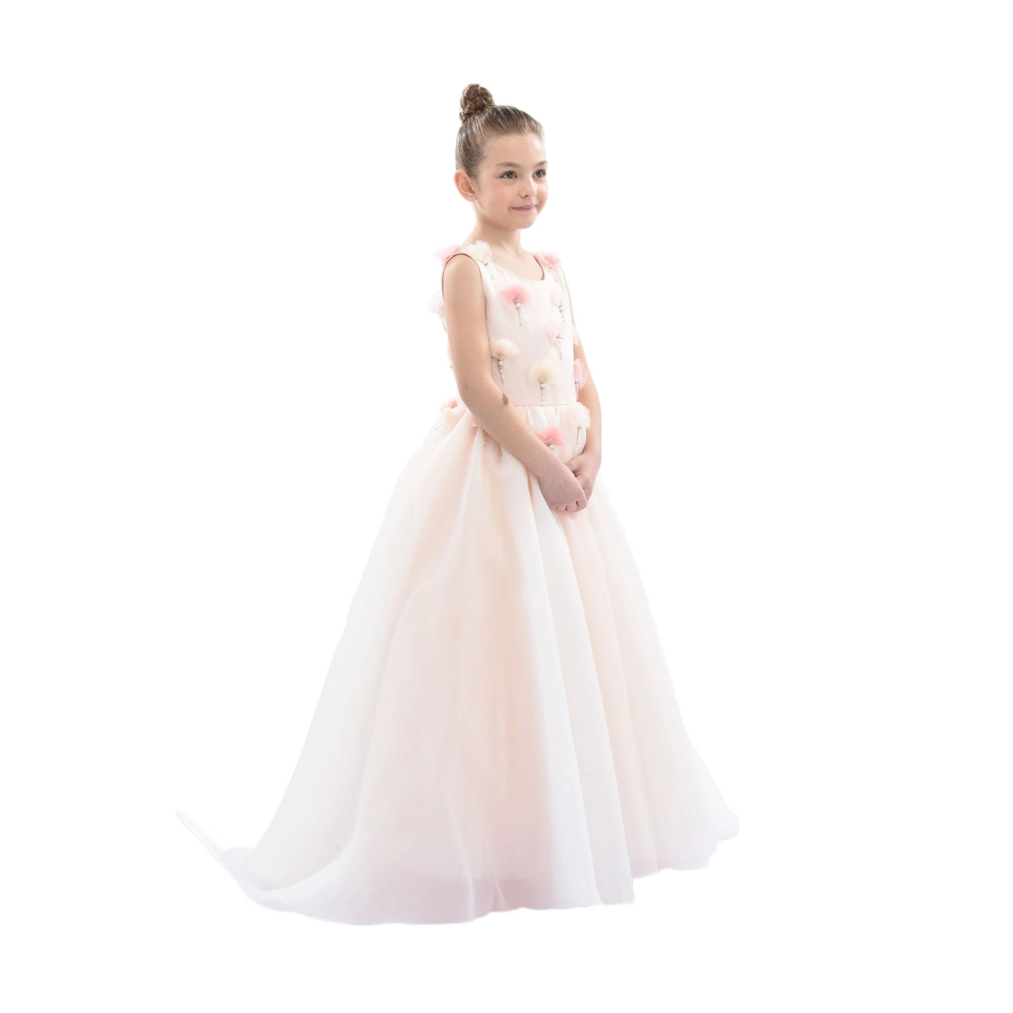 The Pink Magnolia Applique Princess Gown for kid girls from Tulleen is an exquisite and elegant choice for any event. This gown features a sleeveless cut bodice in a lovely peach pink hue, adorned with delicate tulle broach appliques that add a touch of refinement and charm. Firstly, the peach pink tulle skirt is lightweight and flowy, creating a graceful silhouette.