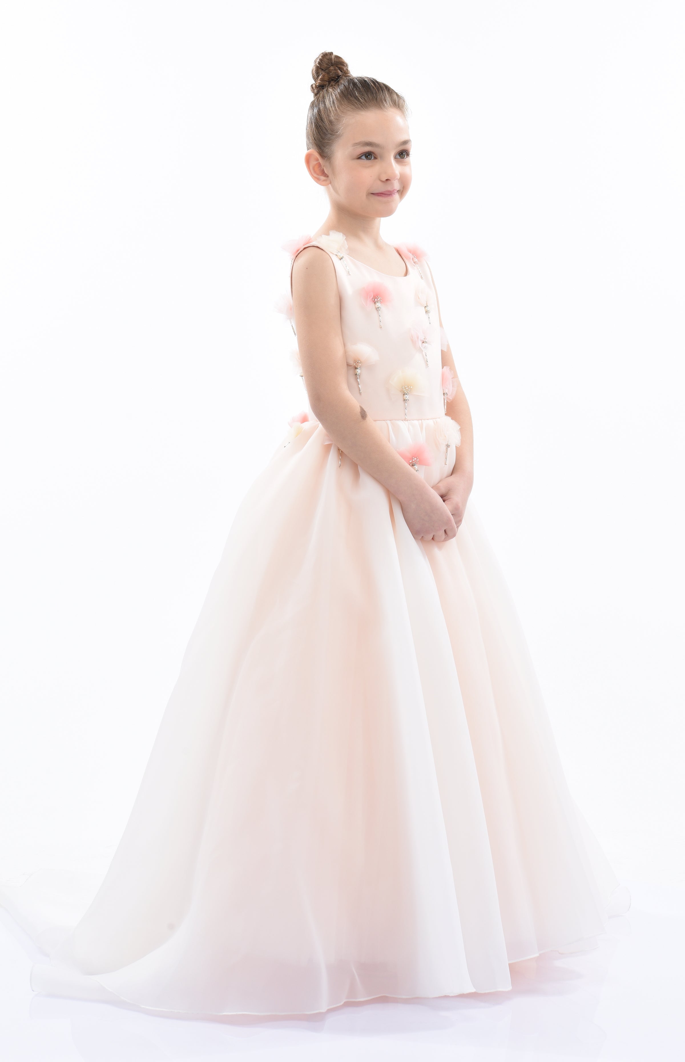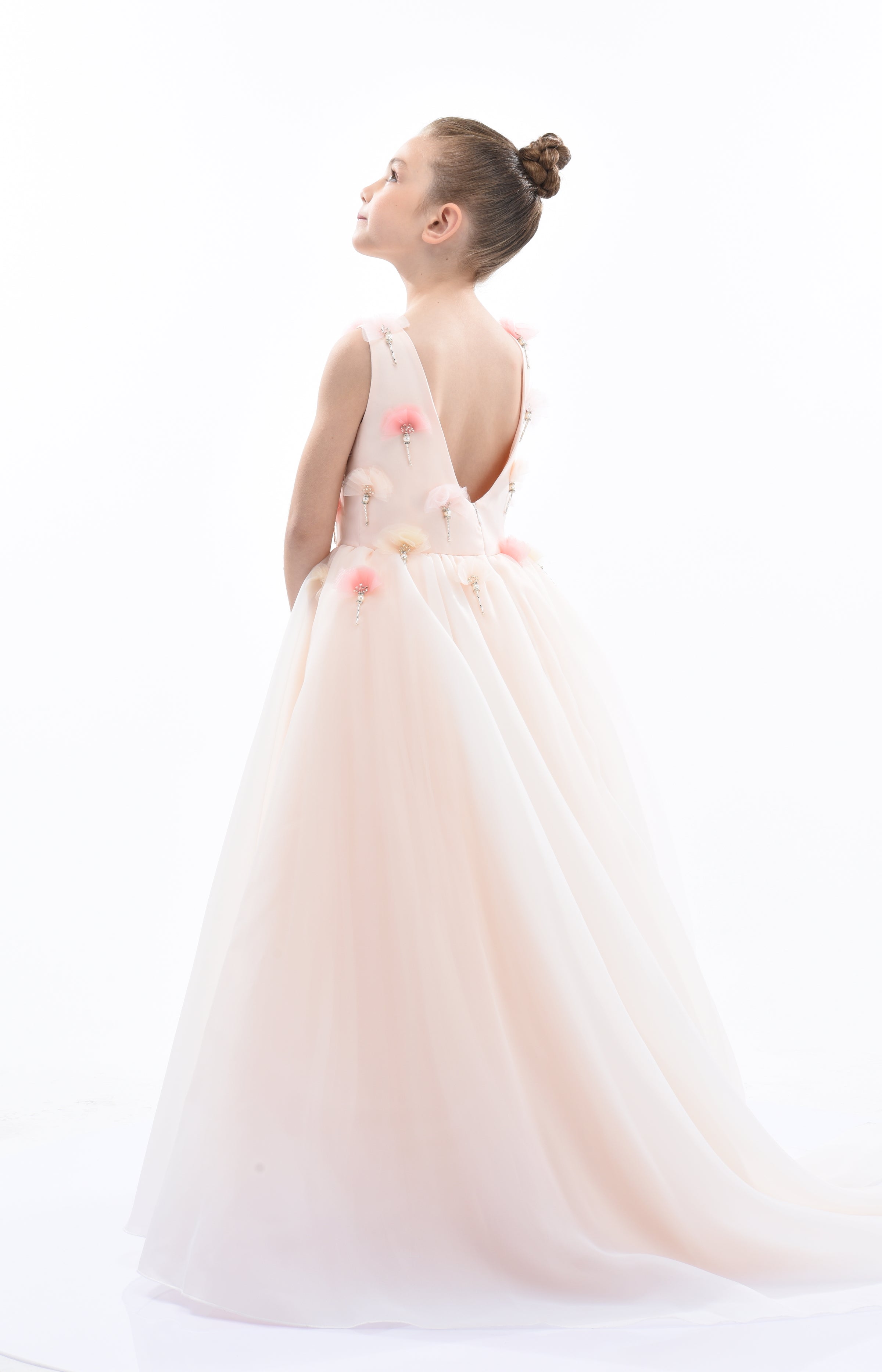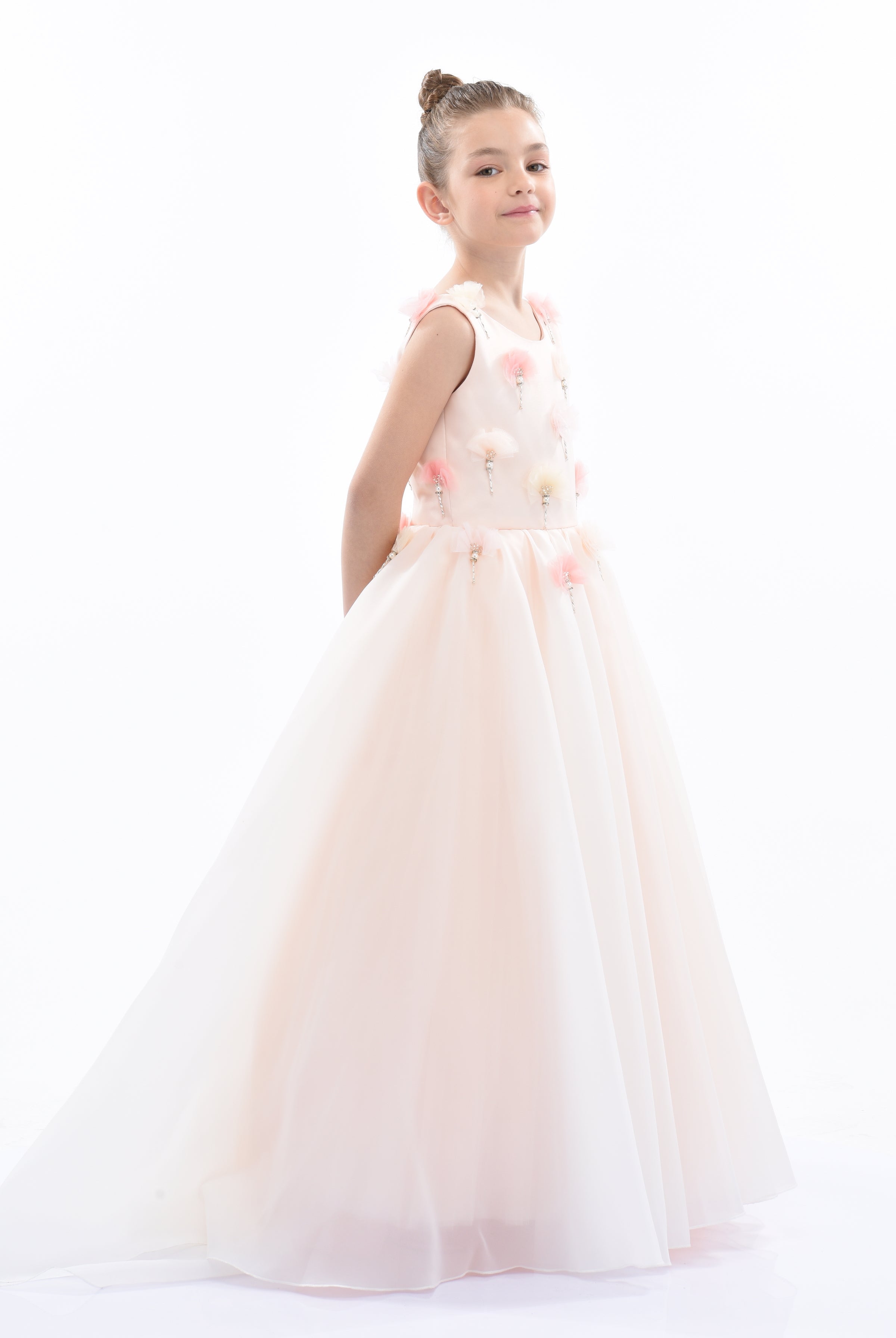The Pink Magnolia Applique Princess Gown for kid girls from Tulleen is an exquisite and elegant choice for any event. This gown features a sleeveless cut bodice in a lovely peach pink hue, adorned with delicate tulle broach appliques that add a touch of refinement and charm. Firstly, the peach pink tulle skirt is lightweight and flowy, creating a graceful silhouette.