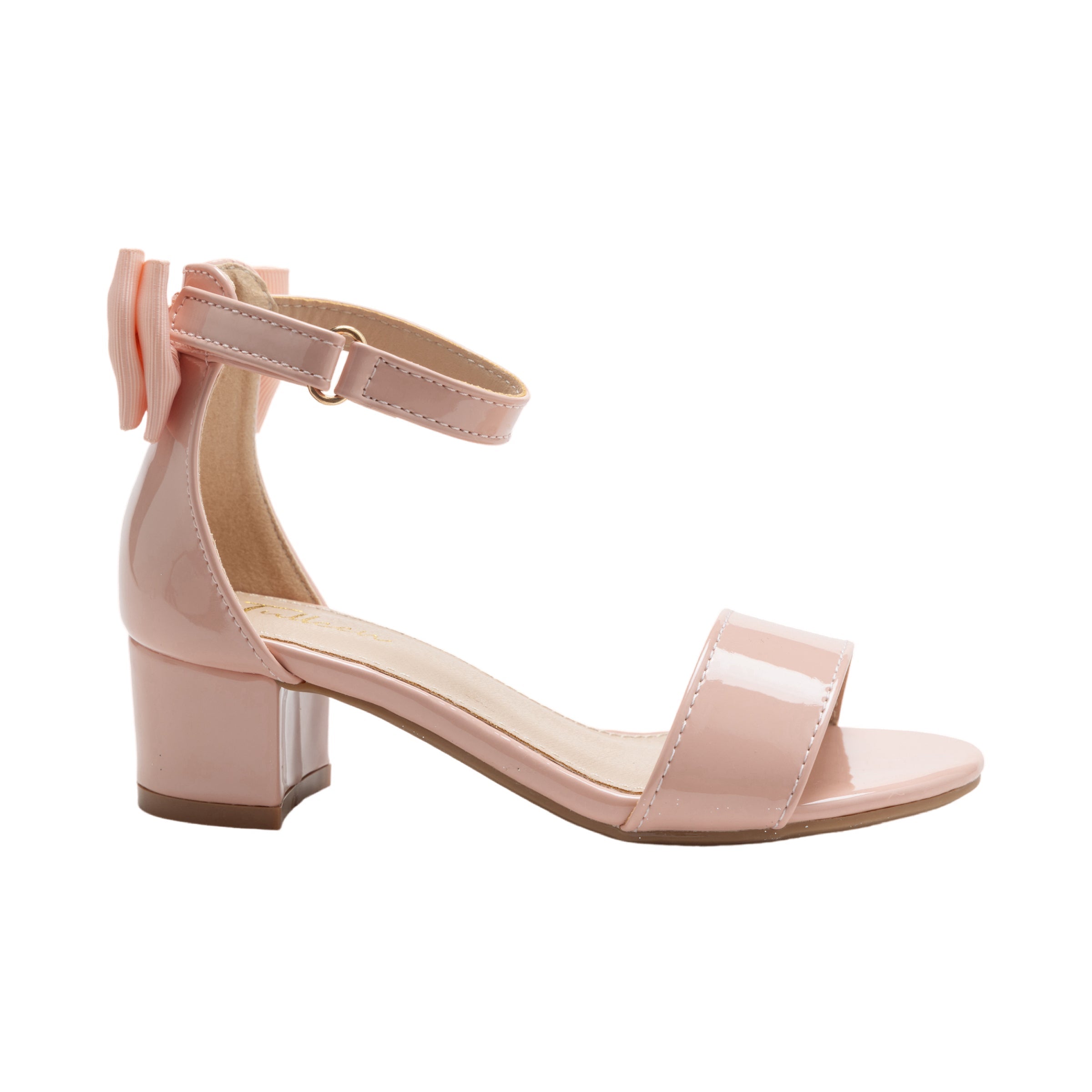 Introducing the Pink Patent Banded Block Heels by Tulleen, featuring a glossy pale pink finish that radiates sophistication and charm. The shiny gloss adds a refined touch to these heels, making them a perfect choice for little girls who love a stylish and elegant look.