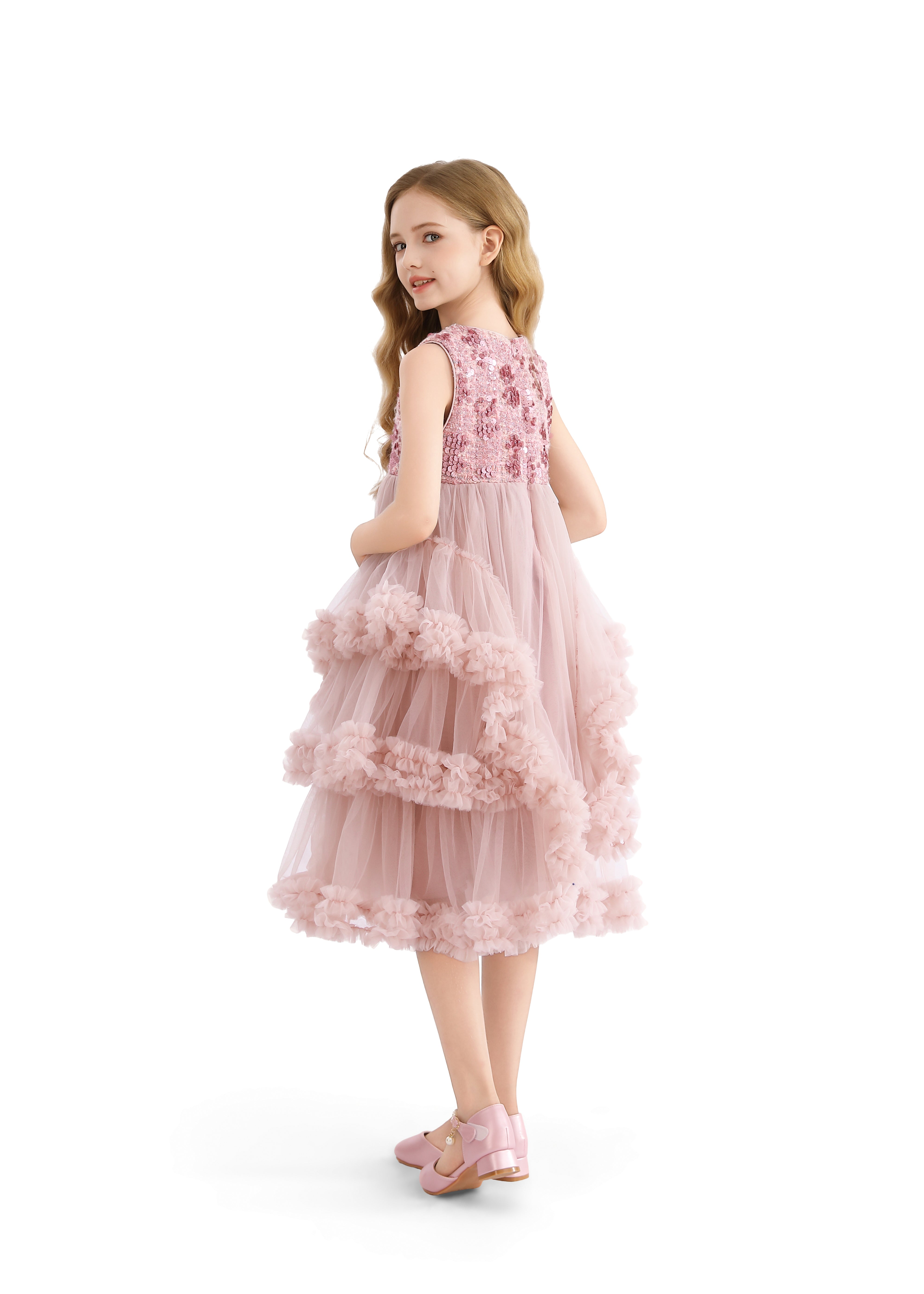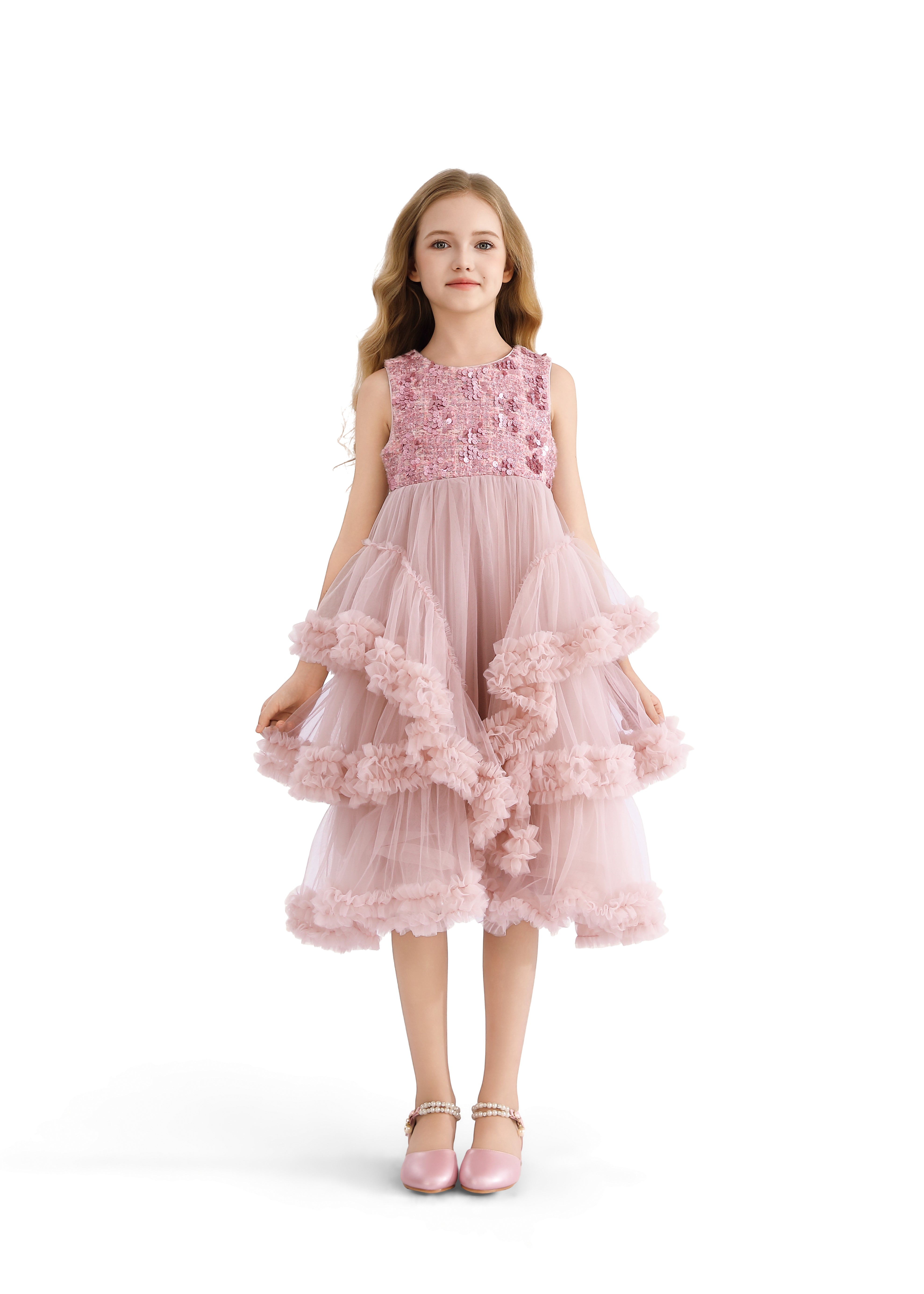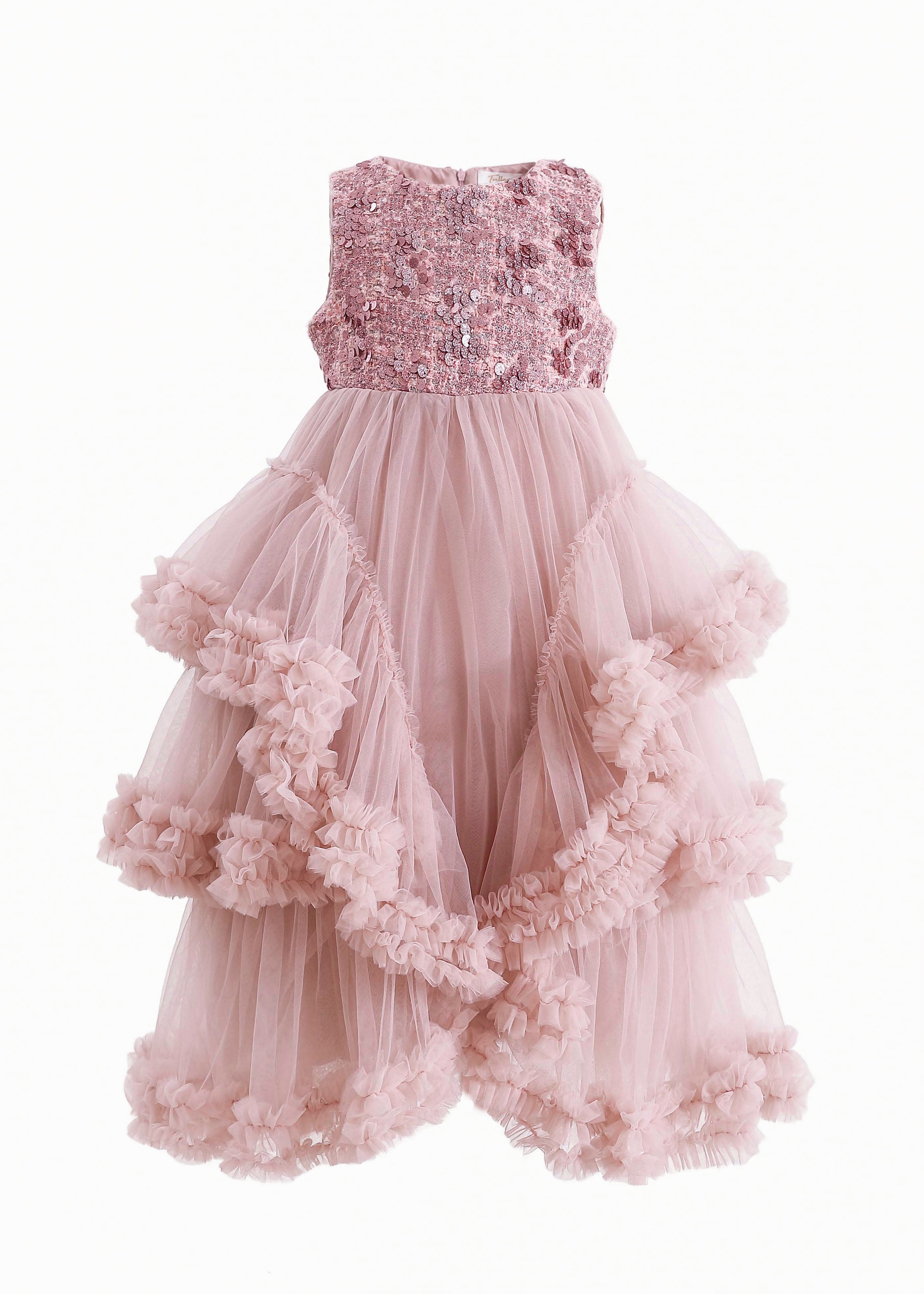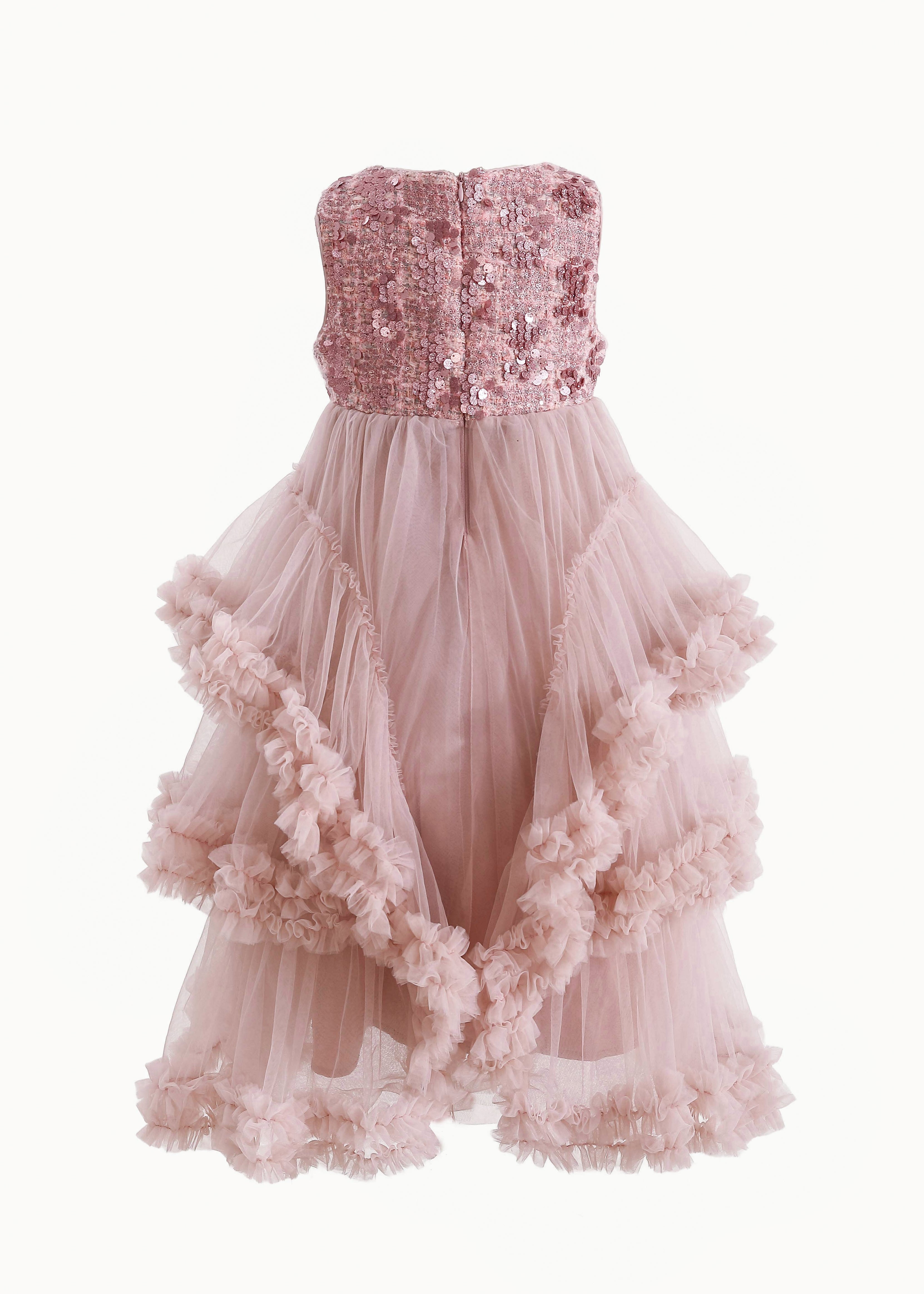 - Cascading ruffled tulle layers with high-low hem create graceful movement and volume