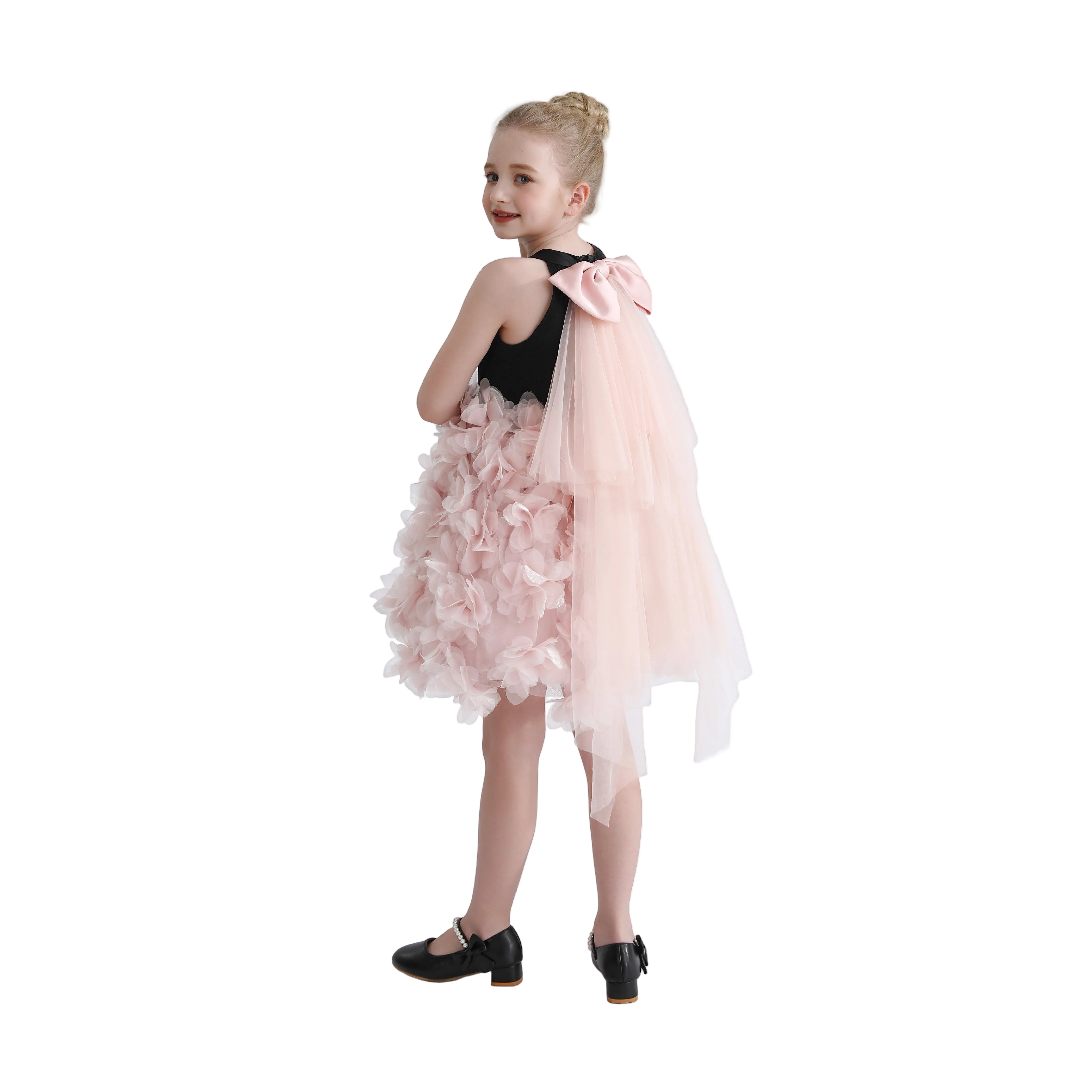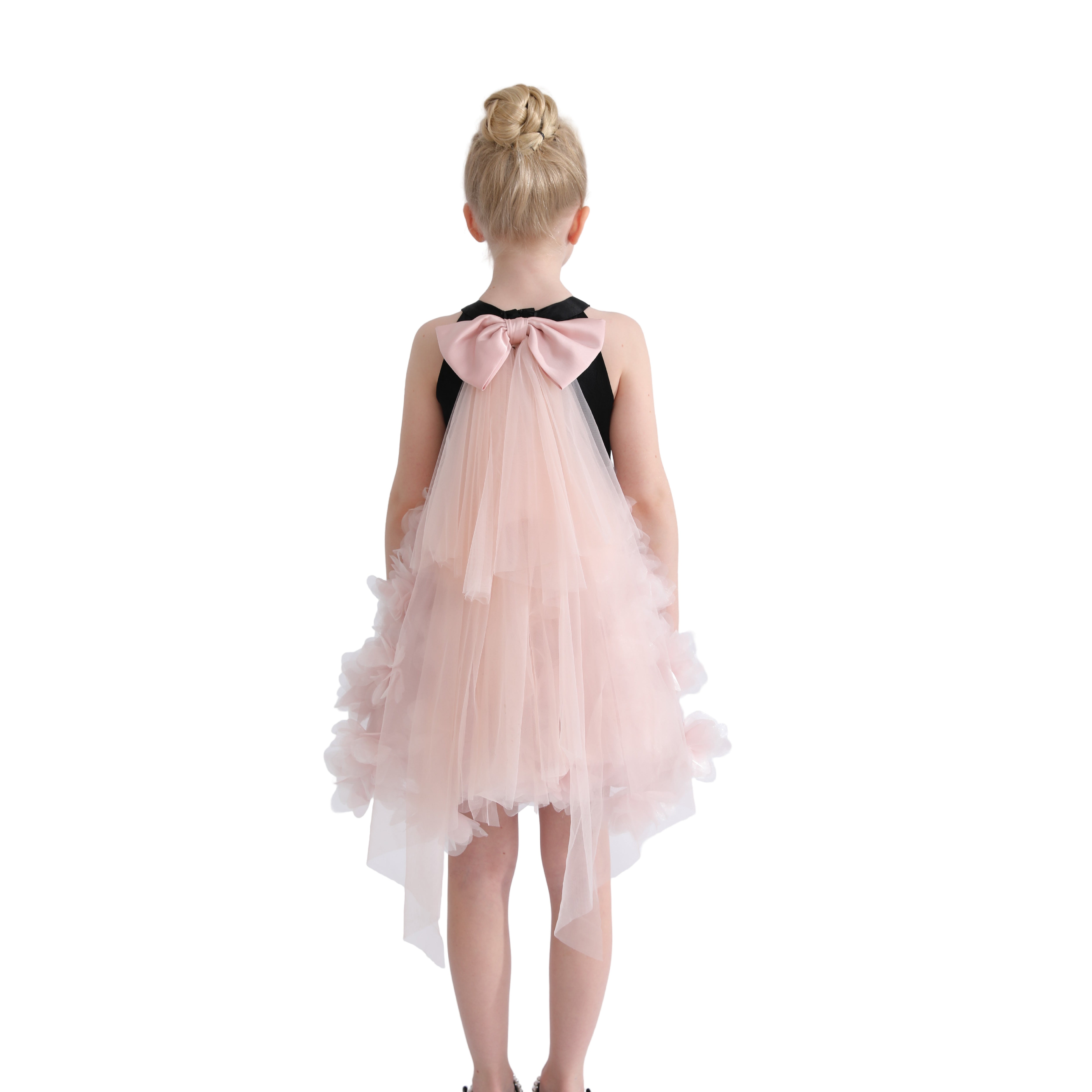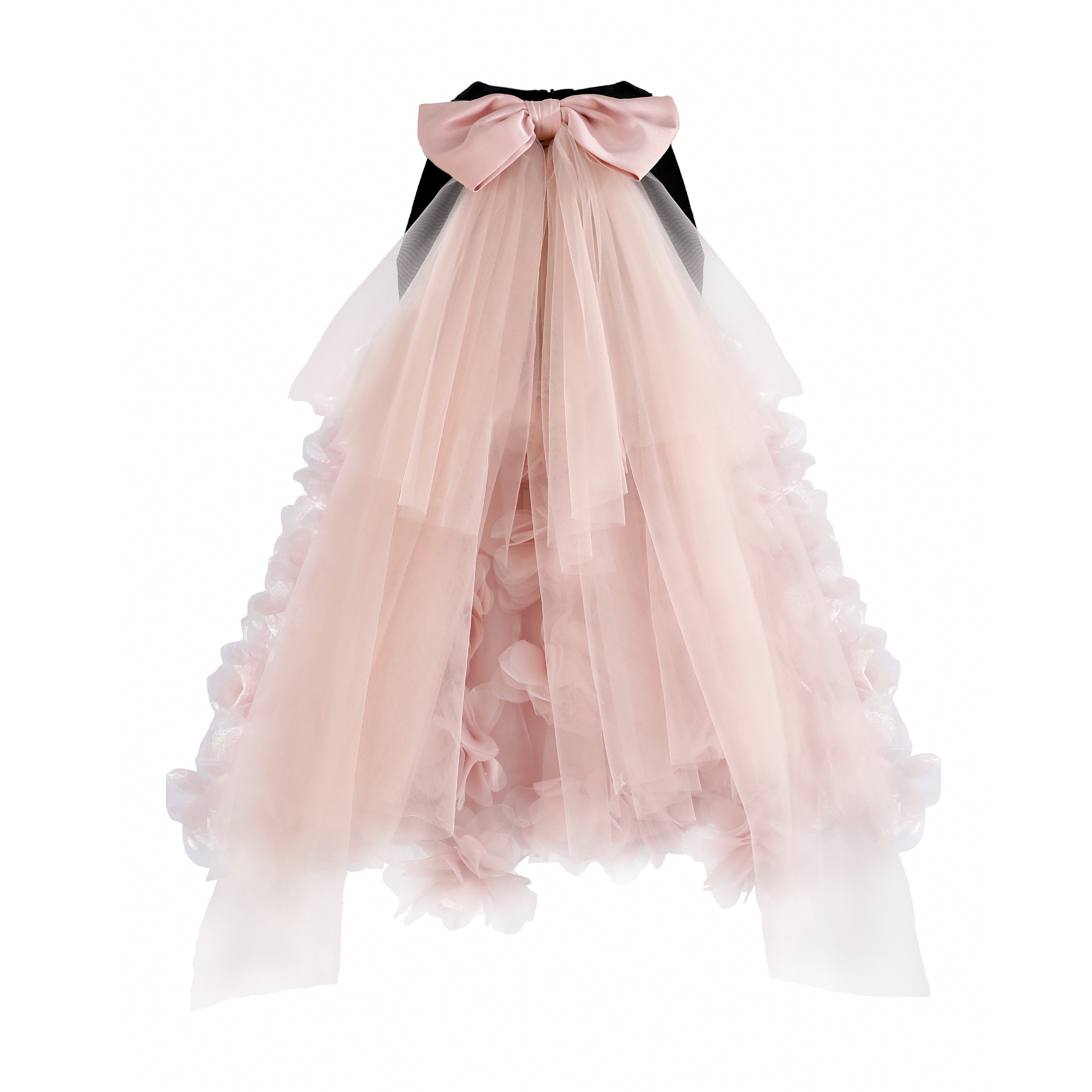 A couture-inspired gown overflowing with soft pink tulle layers that create a flowing, ethereal silhouette. The dramatic back bow and petal-like ruffles add richness and elegance, making it a standout piece for formal occasions.