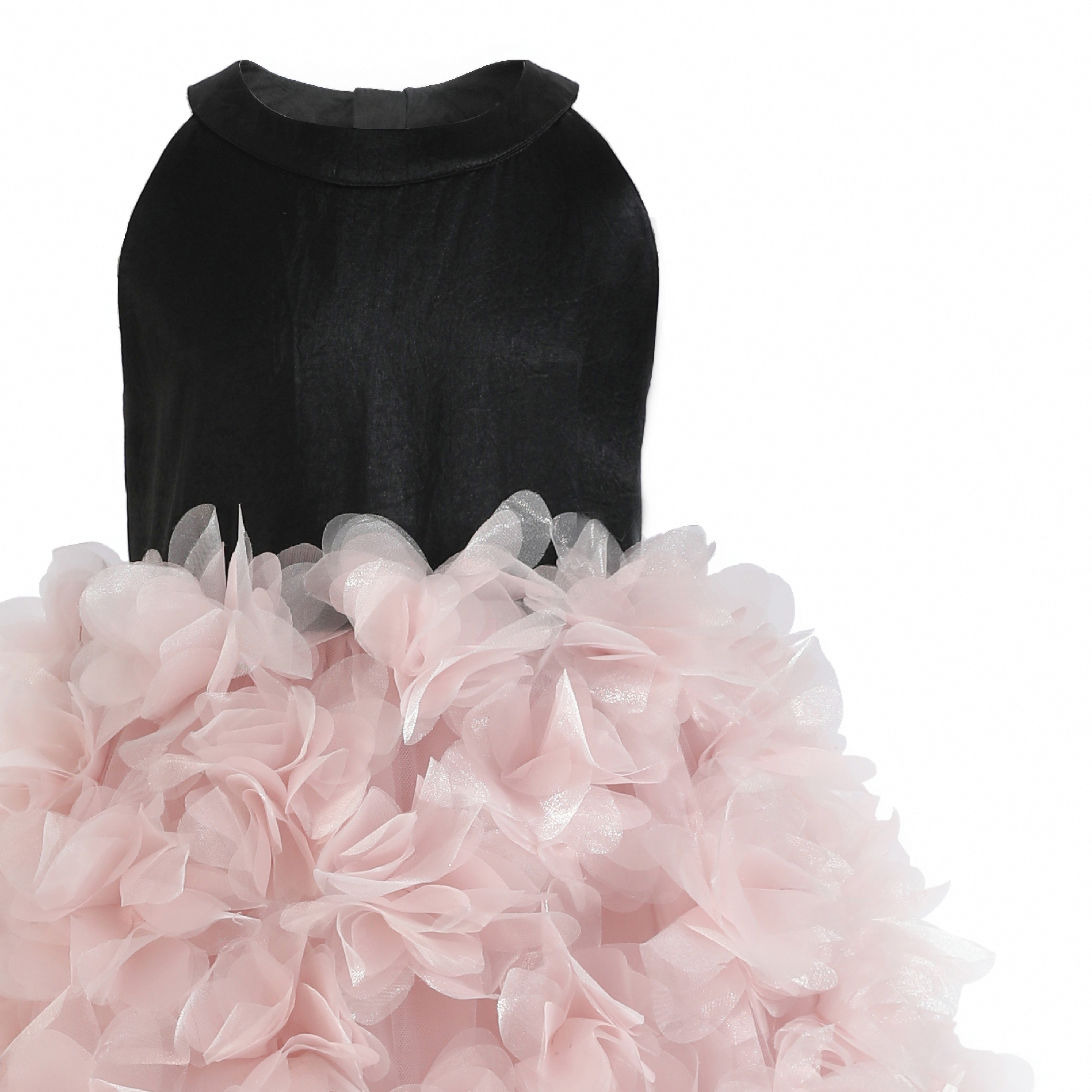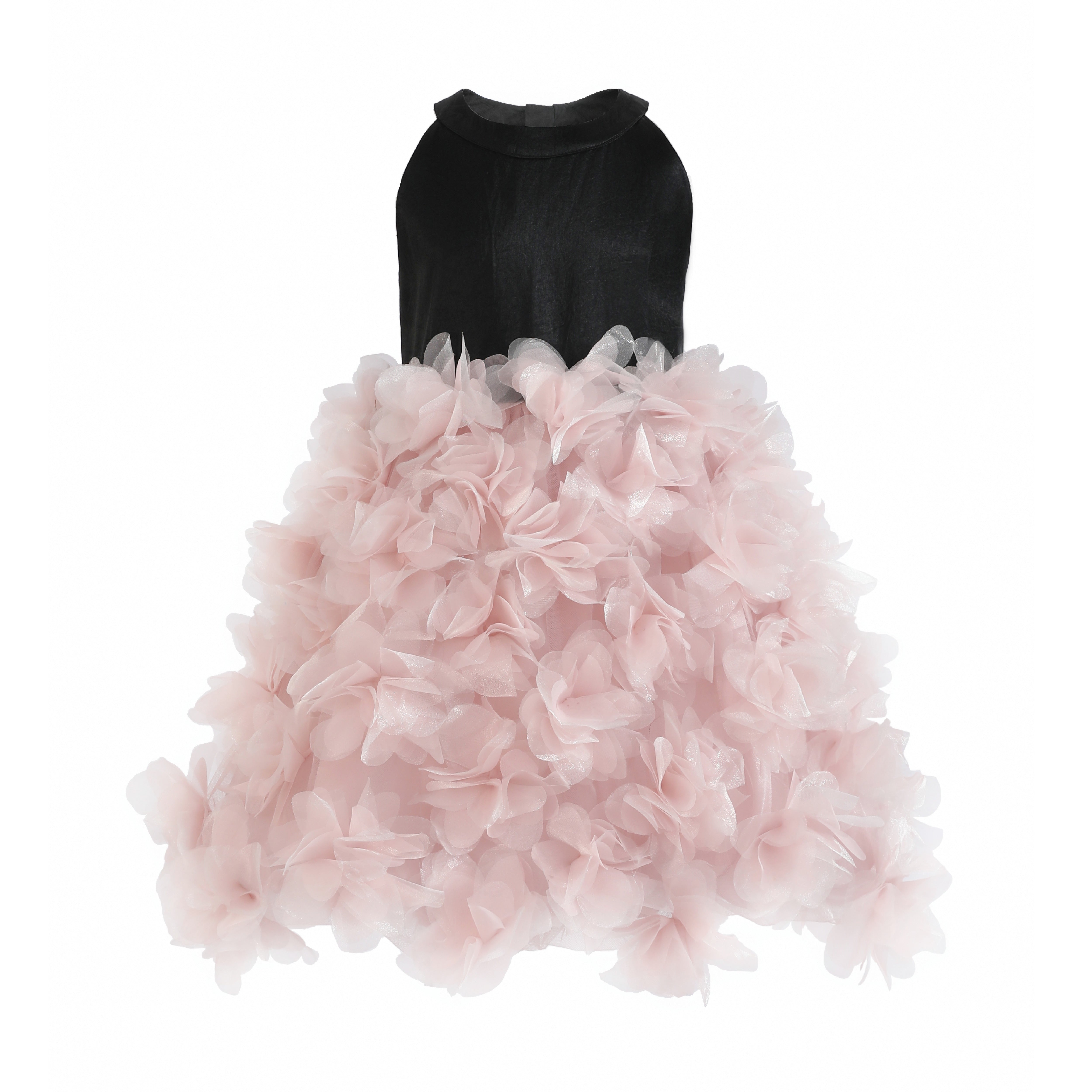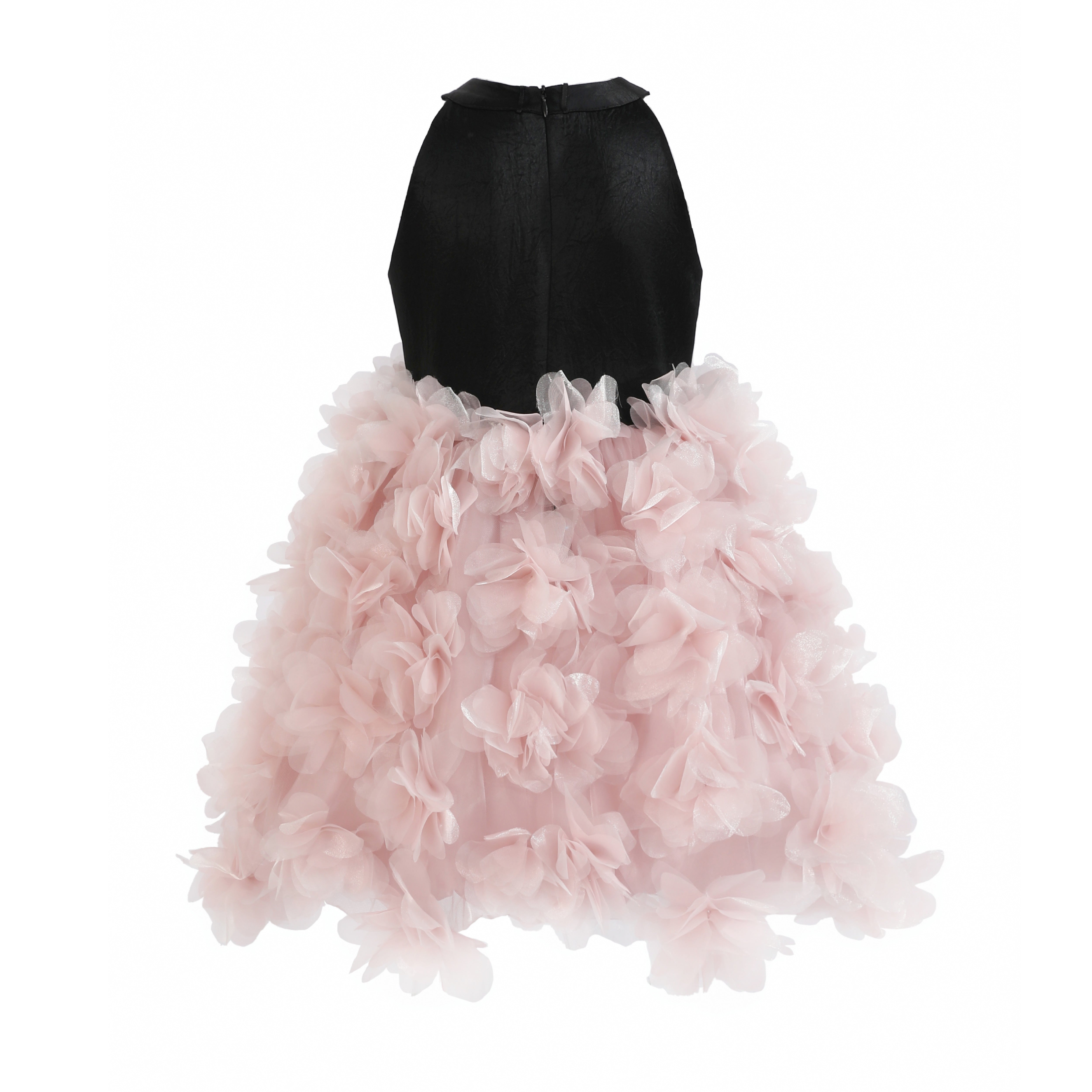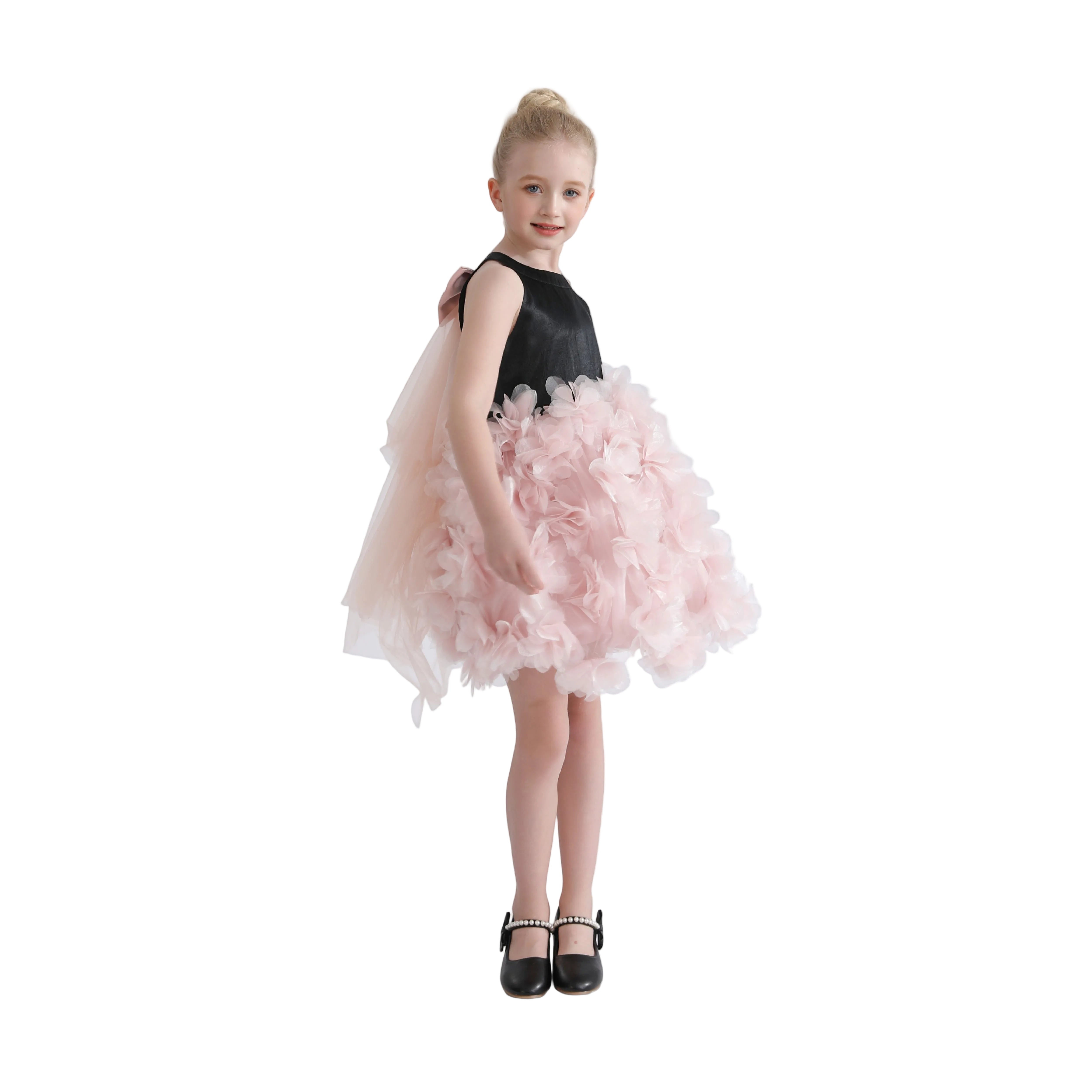 A couture-inspired gown overflowing with soft pink tulle layers that create a flowing, ethereal silhouette. The dramatic back bow and petal-like ruffles add richness and elegance, making it a standout piece for formal occasions.