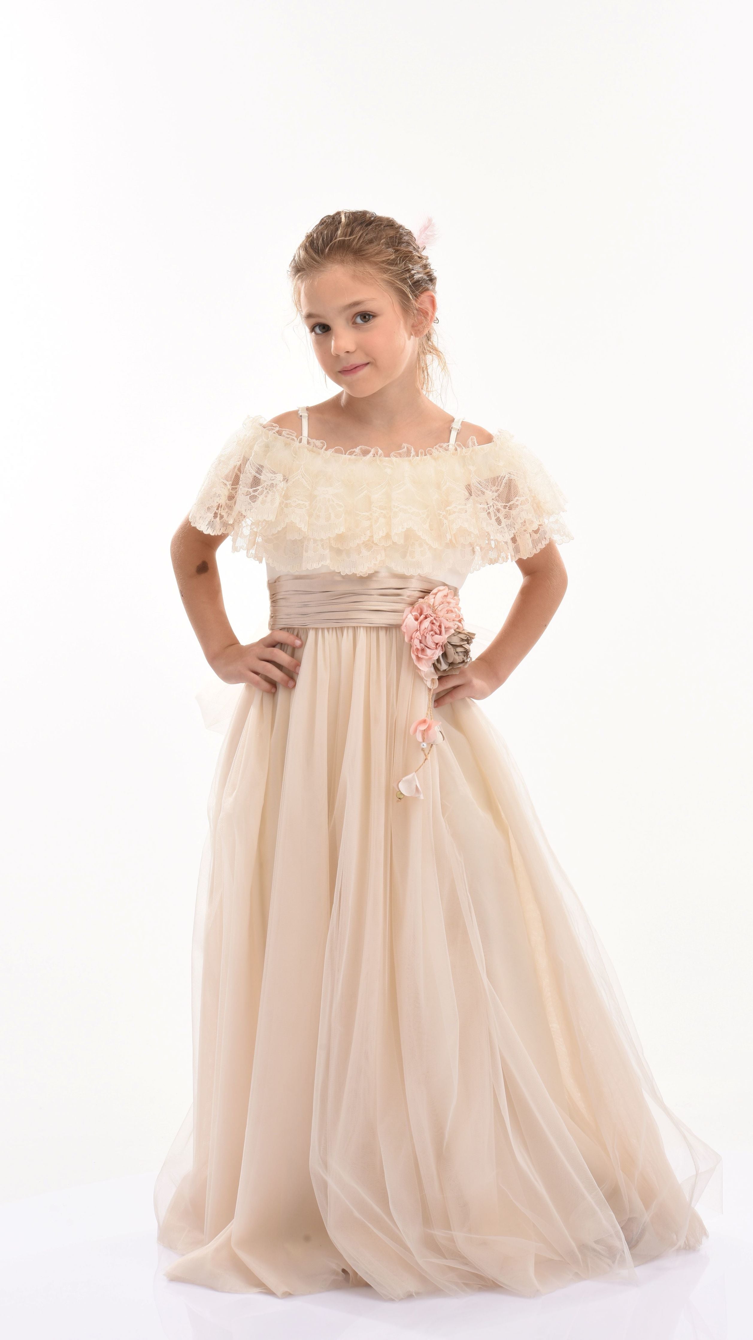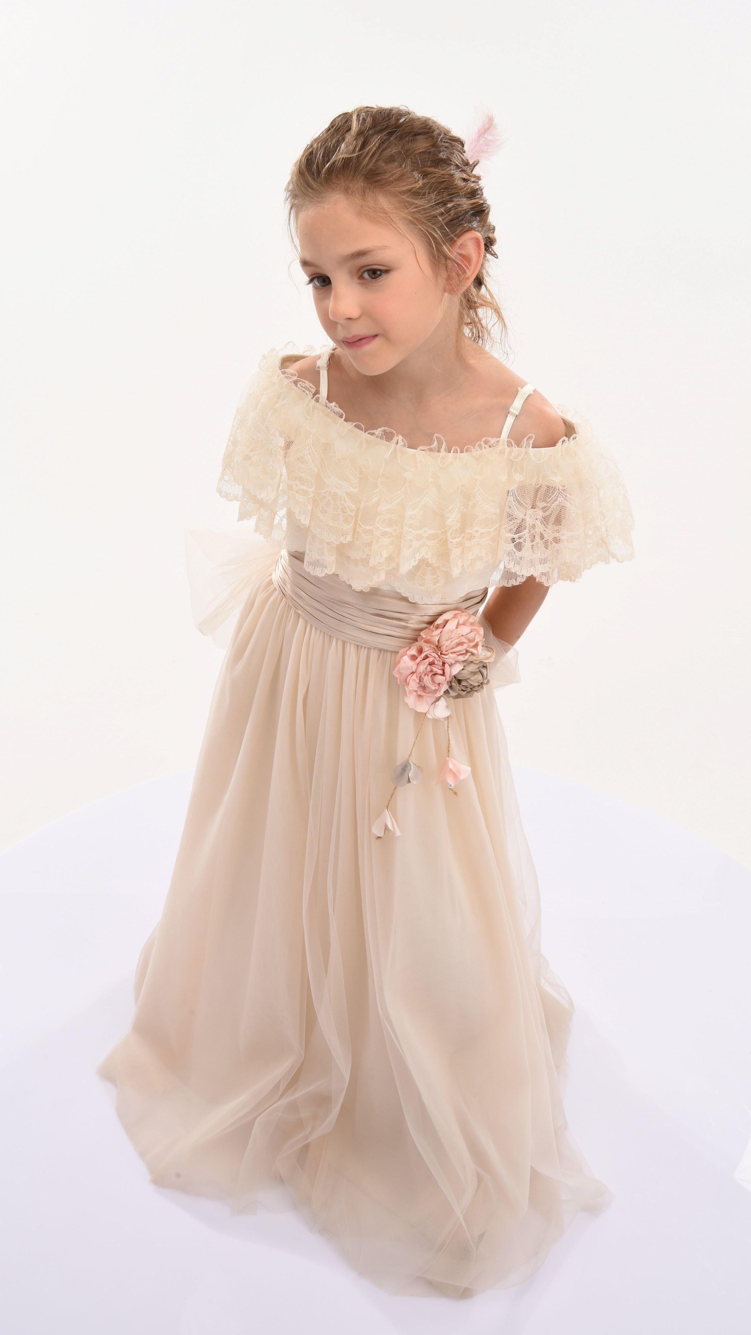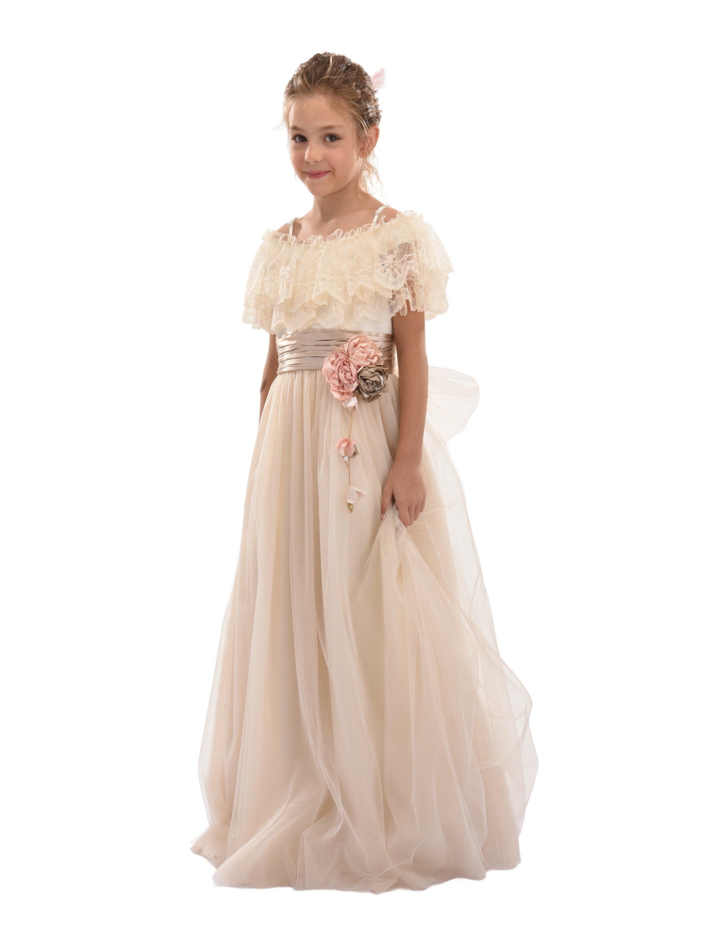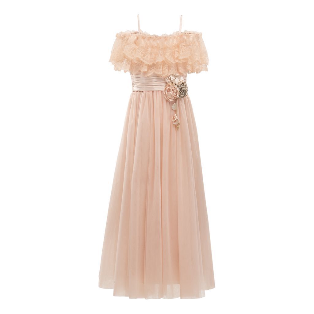 Similar to the Teresa dress, this powder high-waist dress features a muted pink sash tied perfectly around the waist, complemented with a pink and bronze rose applique. Scalloped lace lines the neckline in layers, flawlessly draping over the top and back of the dress.