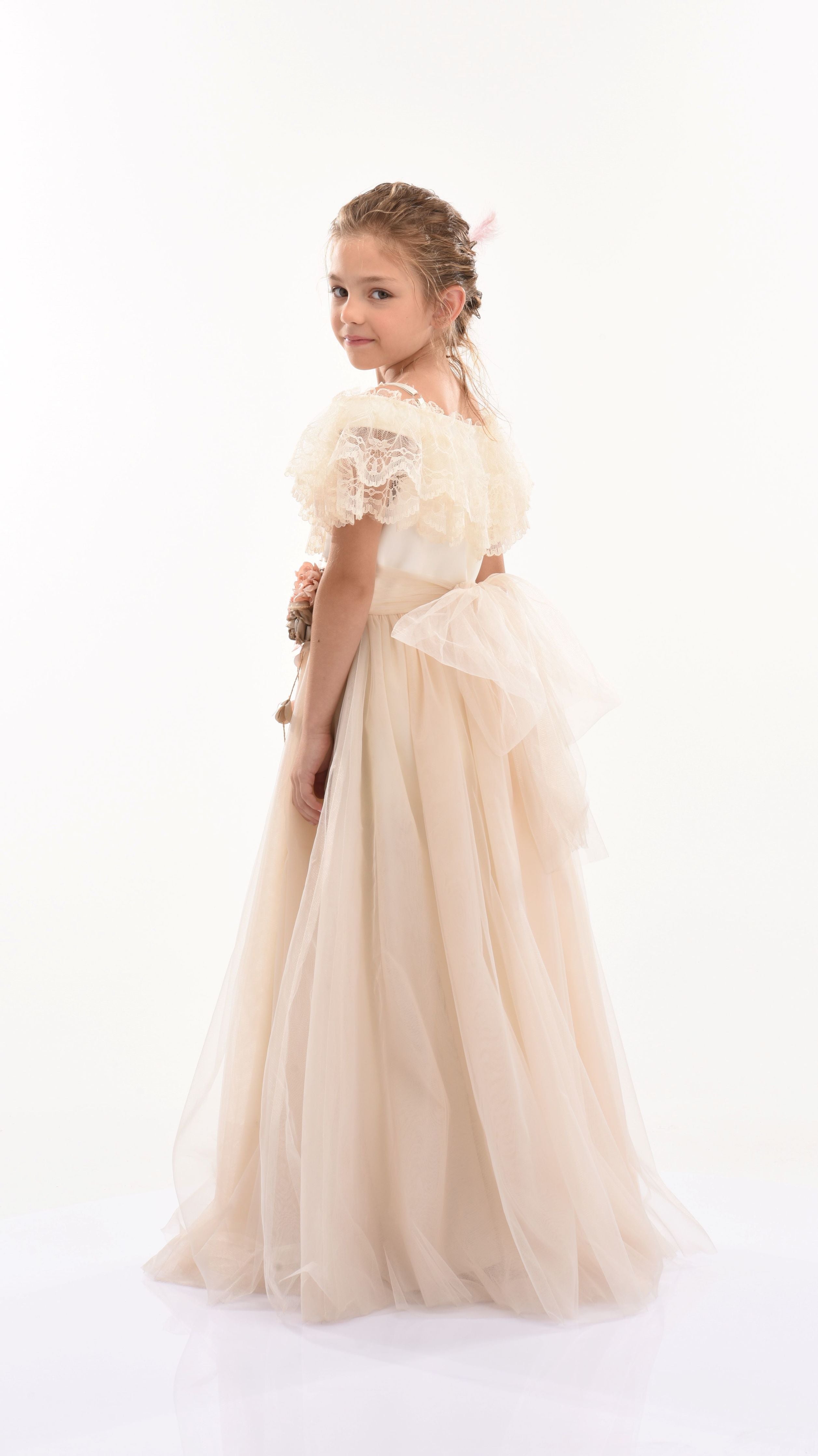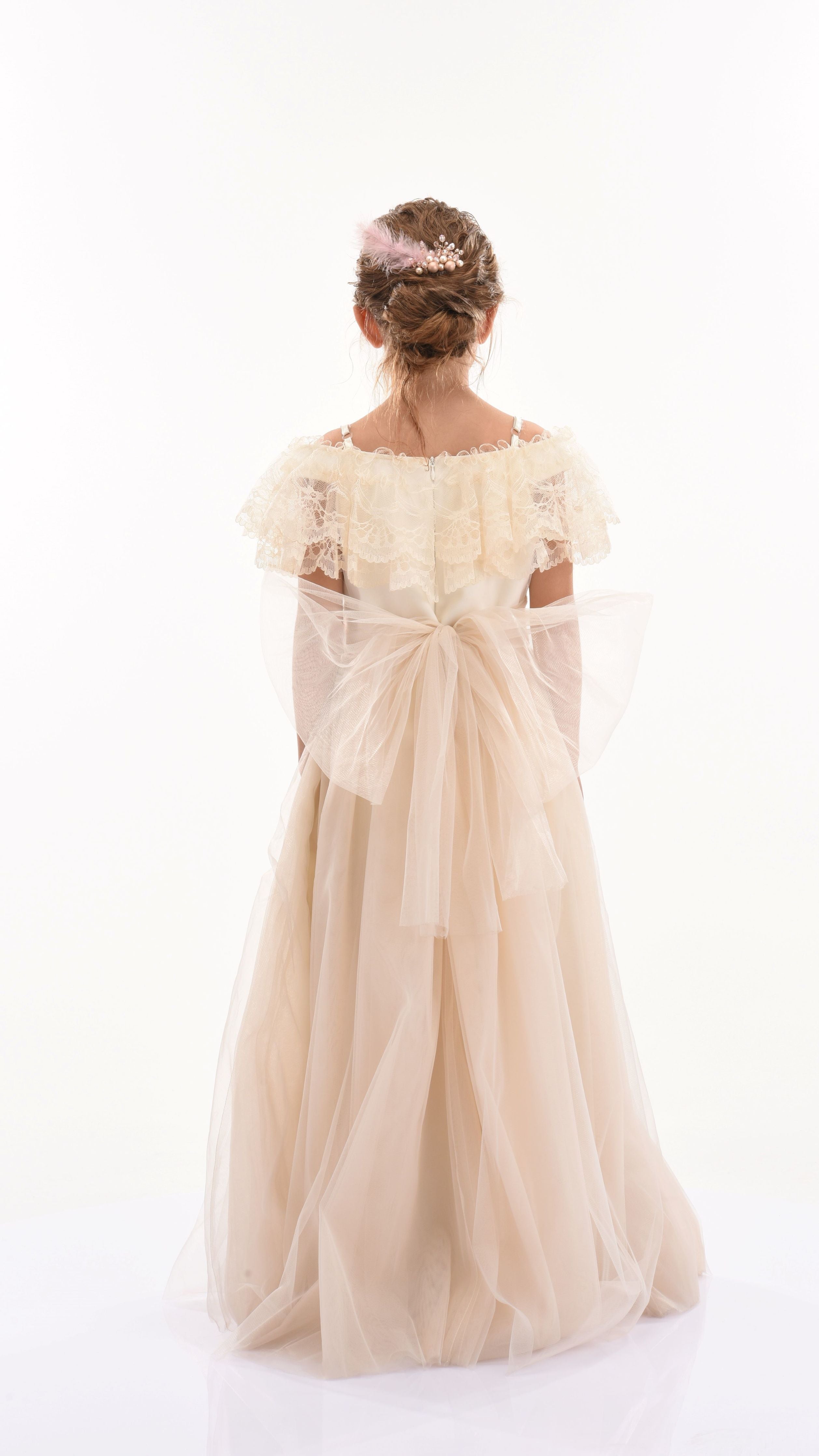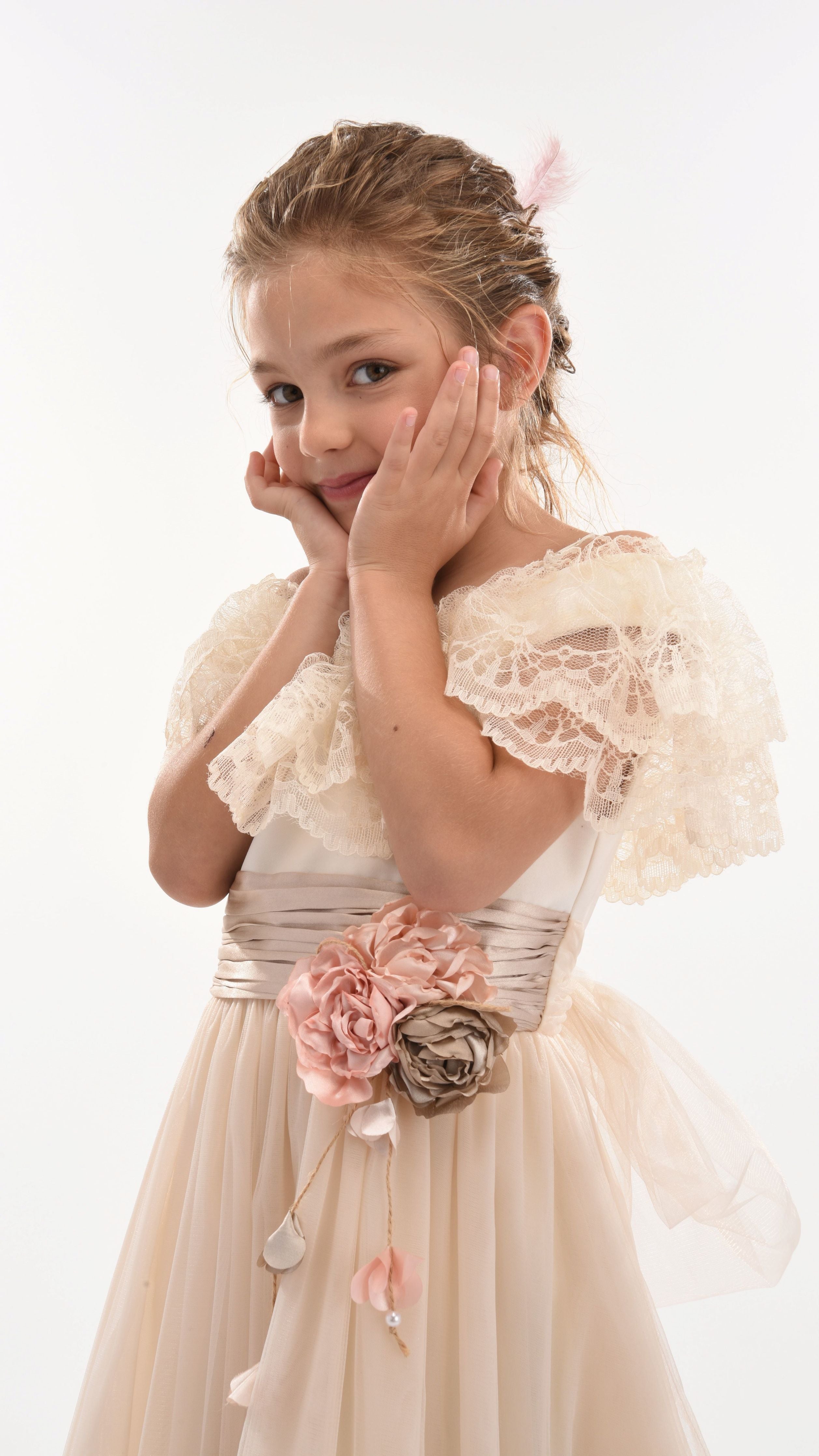 Similar to the Teresa dress, this powder high-waist dress features a muted pink sash tied perfectly around the waist, complemented with a pink and bronze rose applique. Scalloped lace lines the neckline in layers, flawlessly draping over the top and back of the dress.