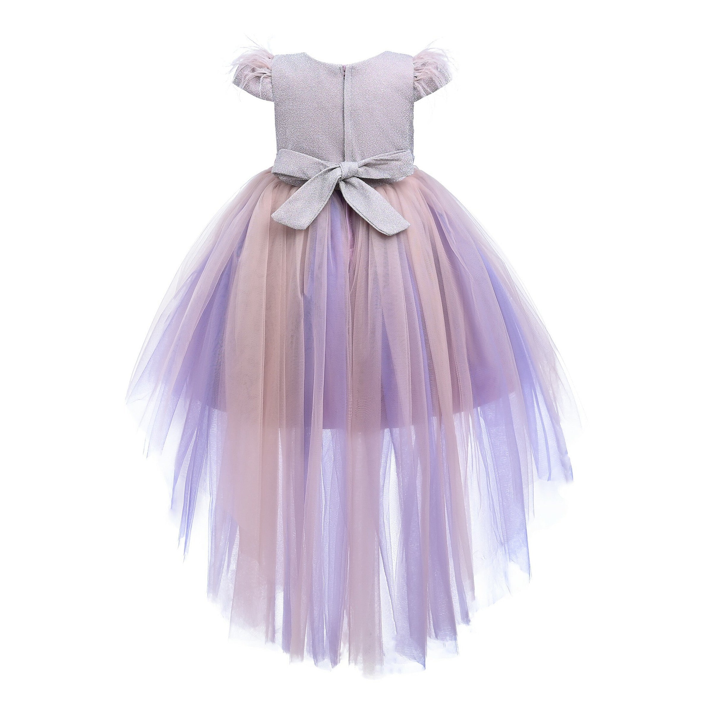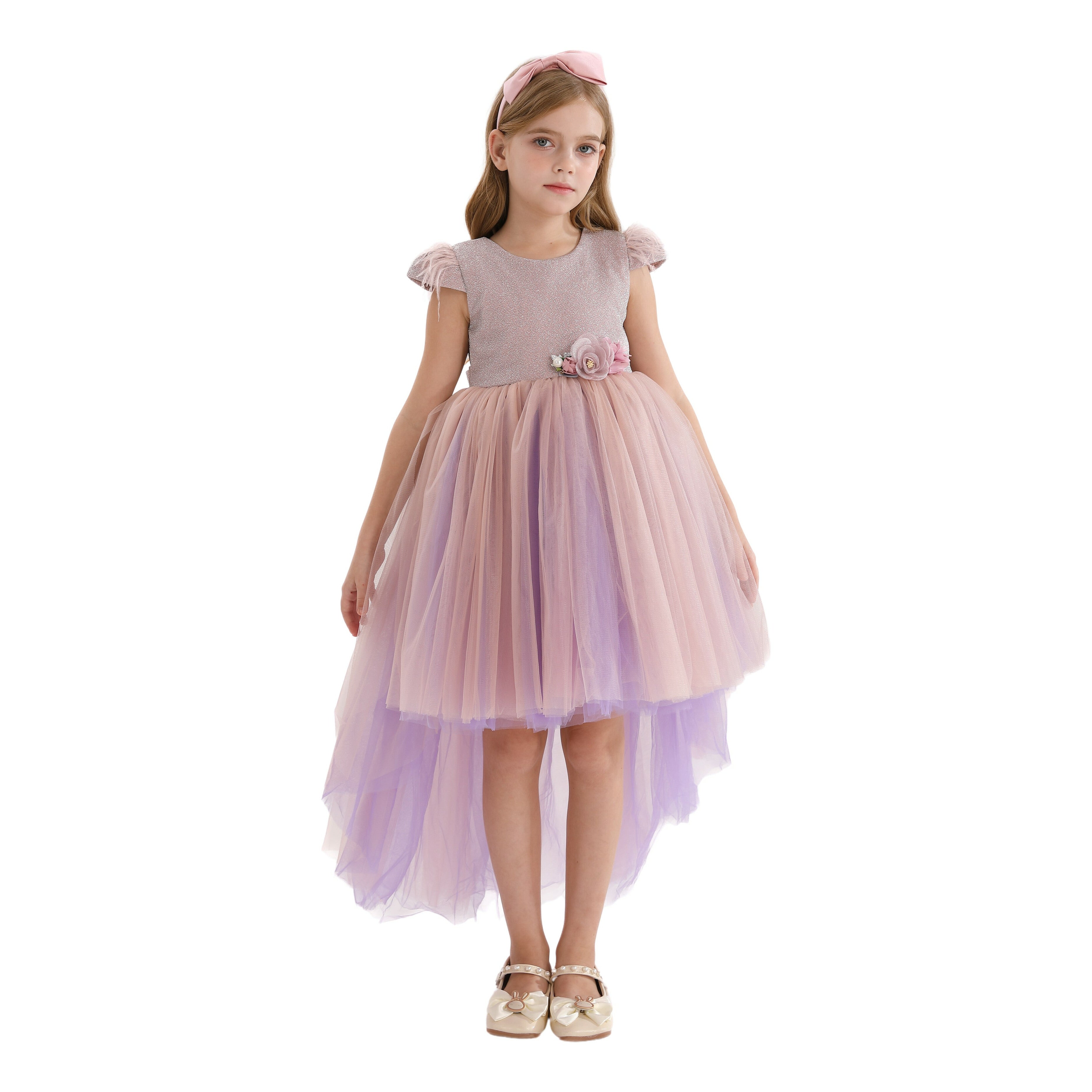 The Purple Abinante Glimmer Dress for kid girls from Tulleen is a stunning and elegant choice for any special occasion. This dress features a teacup shoulder bodice that shimmers in a beautiful light purple, adding a touch of magic and sophistication. Firstly, the floral embellishment at the hip provides a delicate and charming detail, enhancing the overall look.
