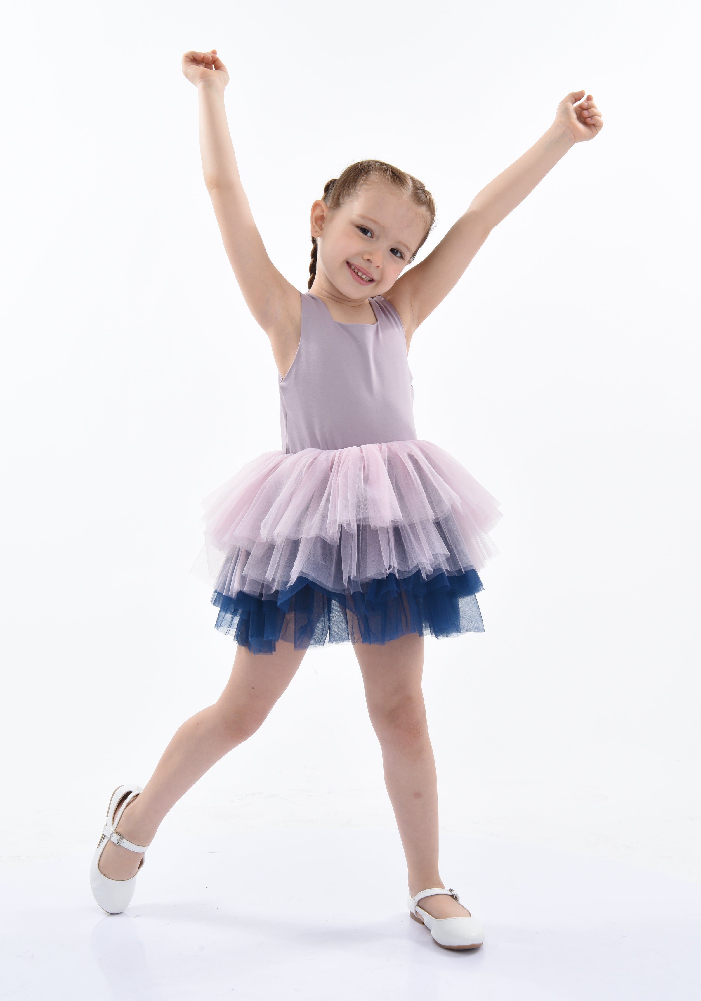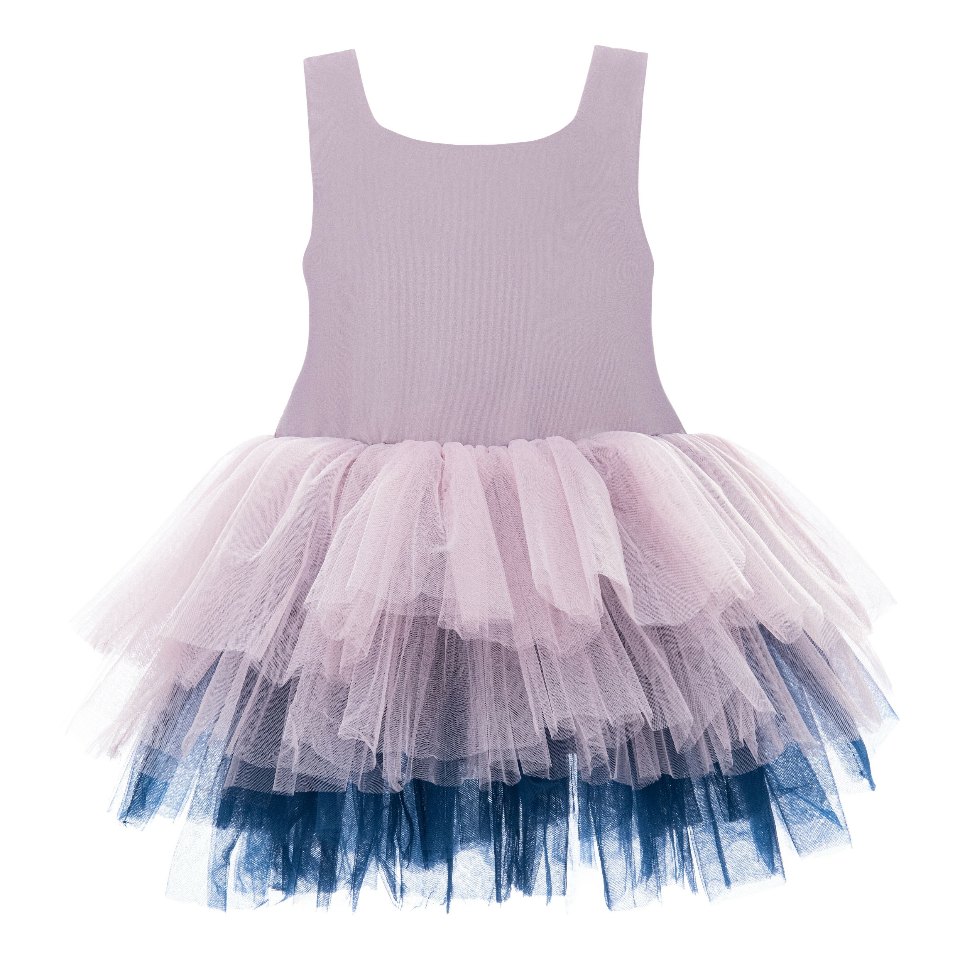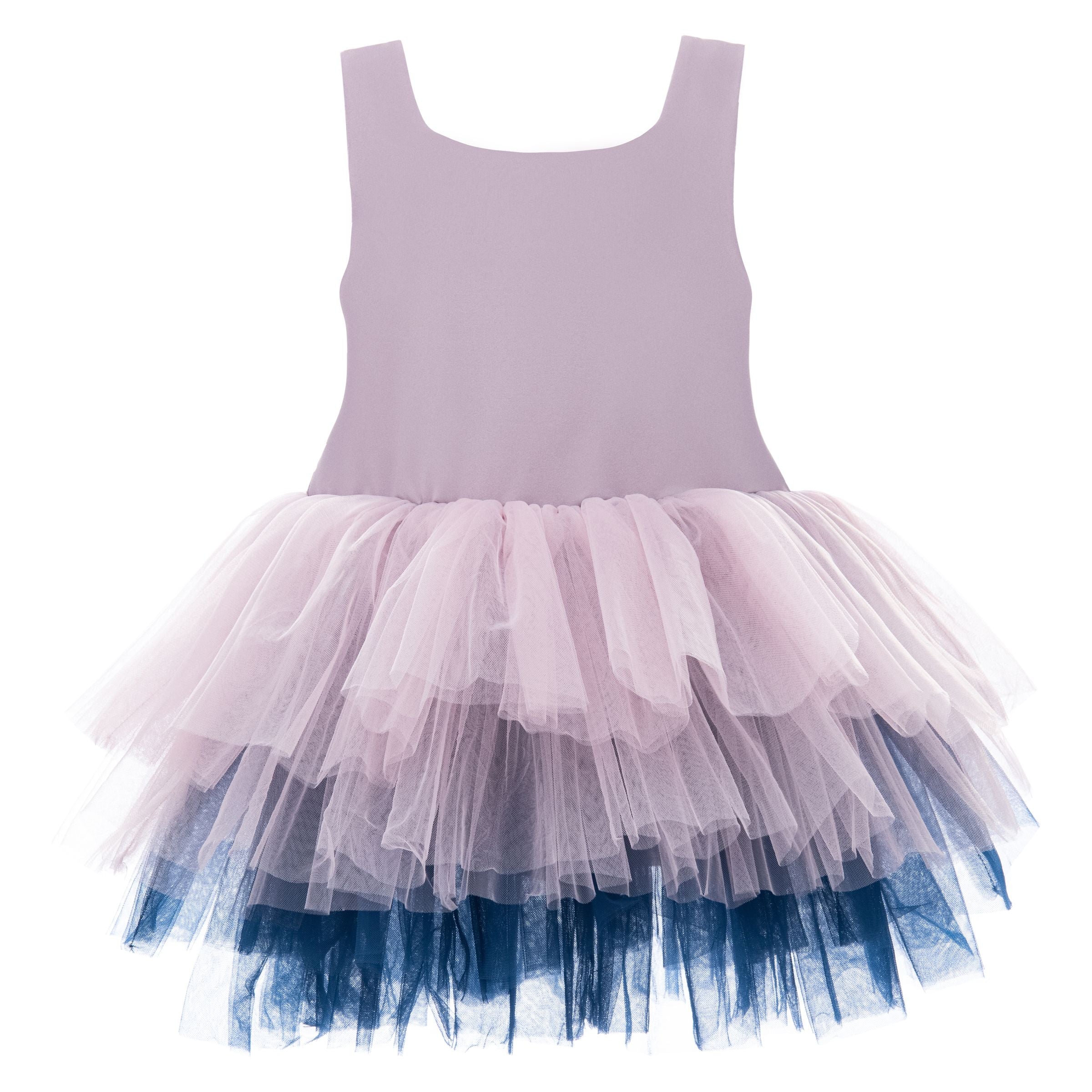 The Purple Mia Tutu Leotard Dress from Mimi Tutu is an enchanting outfit for baby girls. This adorable dress features thin sleeves and a square neck, offering a timeless and sophisticated look. The multiple layers of lightweight lush tulle create a voluminous and airy skirt, perfect for twirling and dancing. The navy tulle underlay adds a touch of contrast, enhancing the dress's overall elegance.