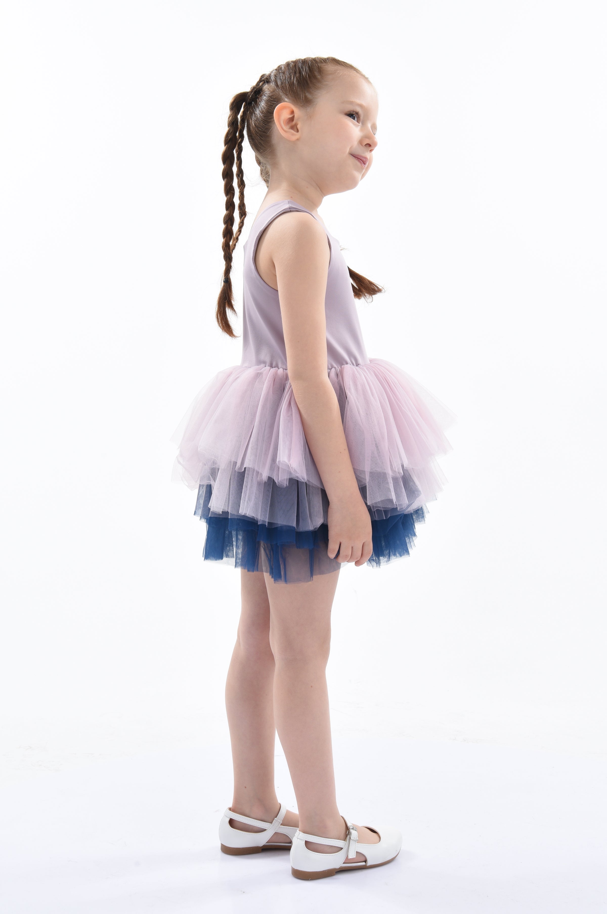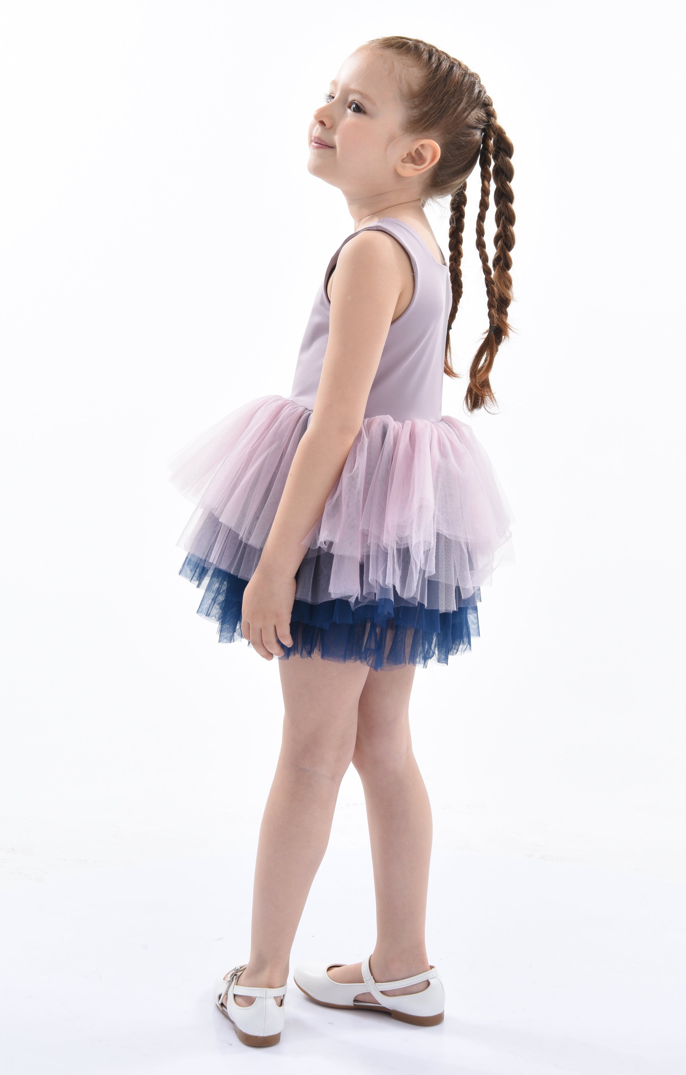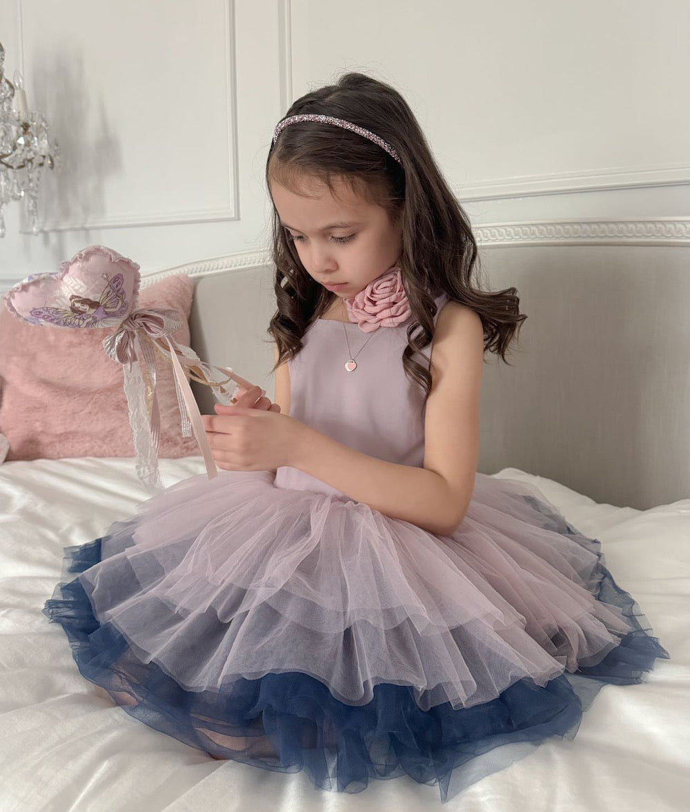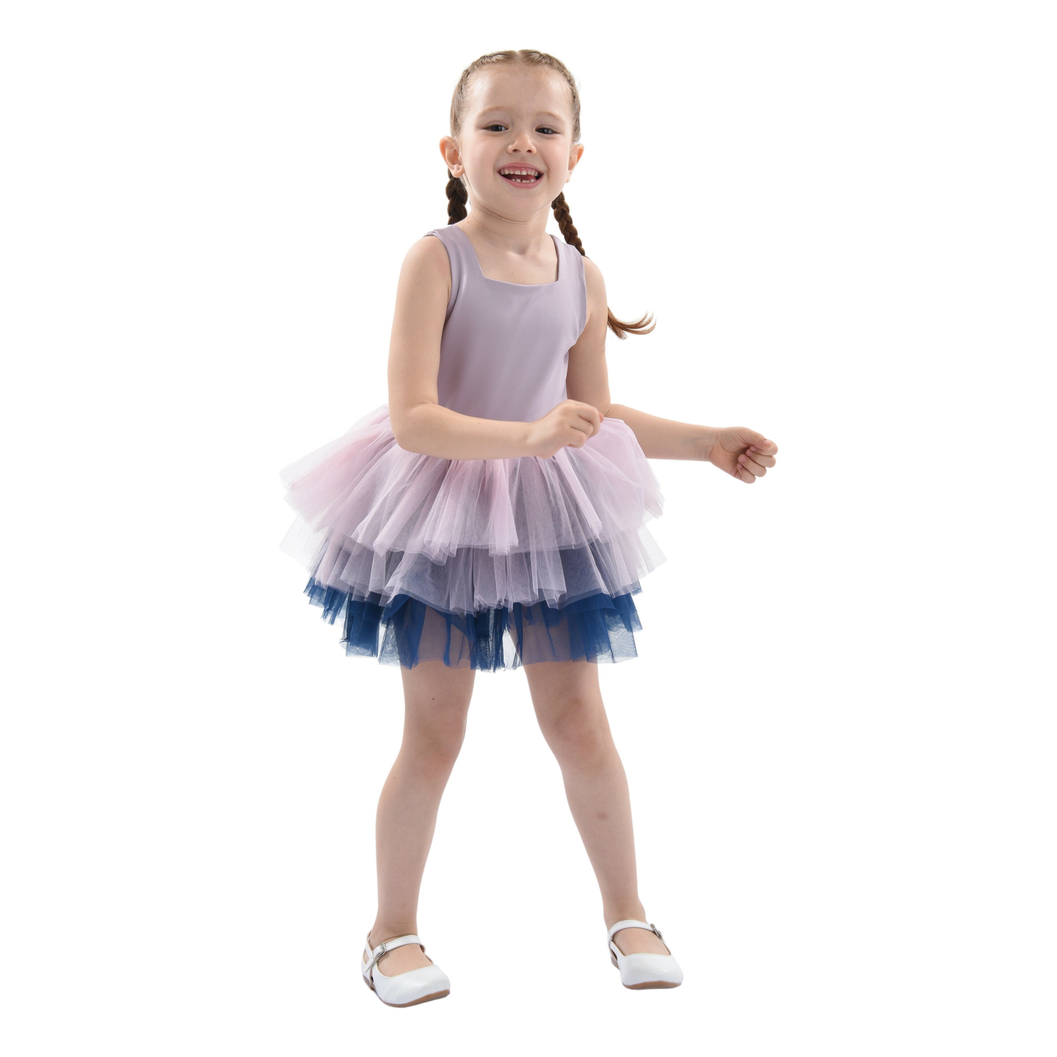 The Purple Mia Tutu Leotard Dress from Mimi Tutu is an enchanting outfit for baby girls. This adorable dress features thin sleeves and a square neck, offering a timeless and sophisticated look. The multiple layers of lightweight lush tulle create a voluminous and airy skirt, perfect for twirling and dancing. The navy tulle underlay adds a touch of contrast, enhancing the dress's overall elegance.