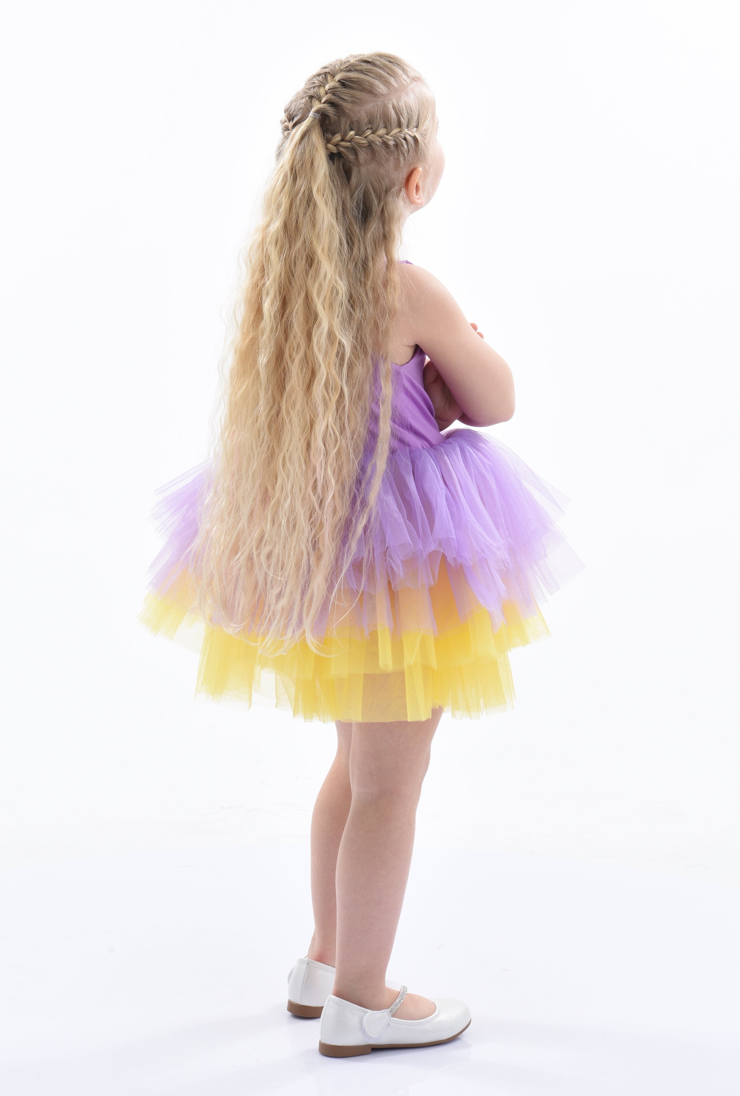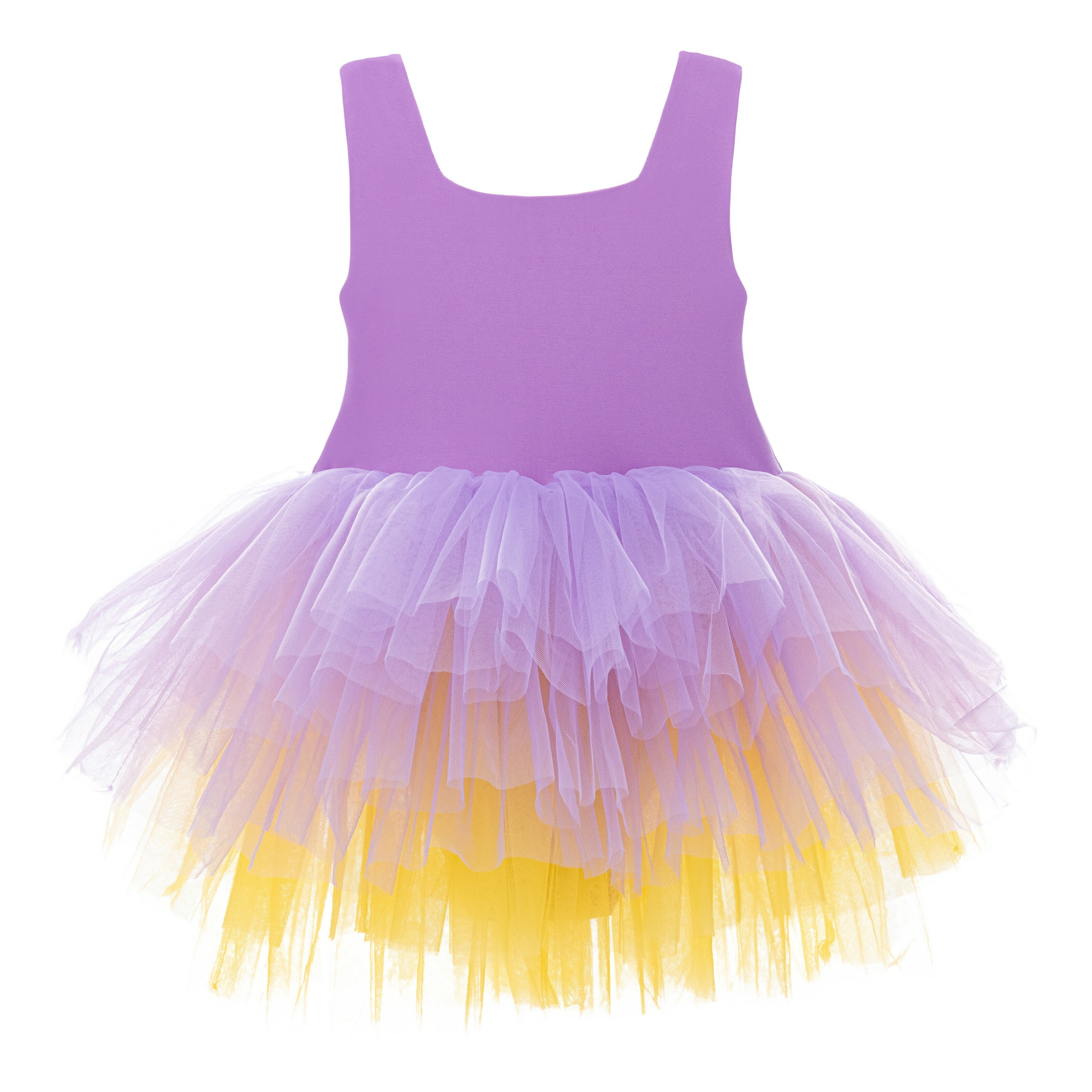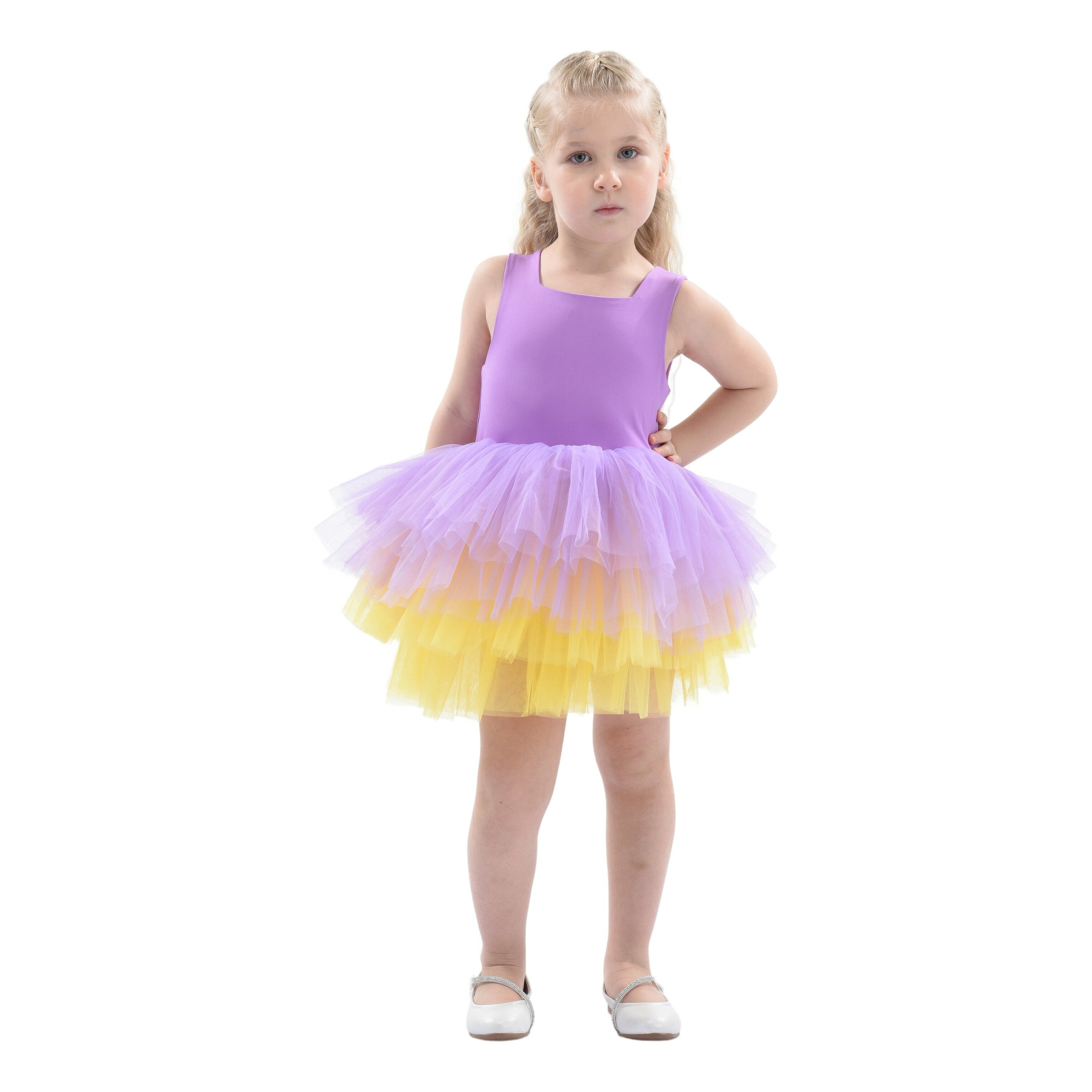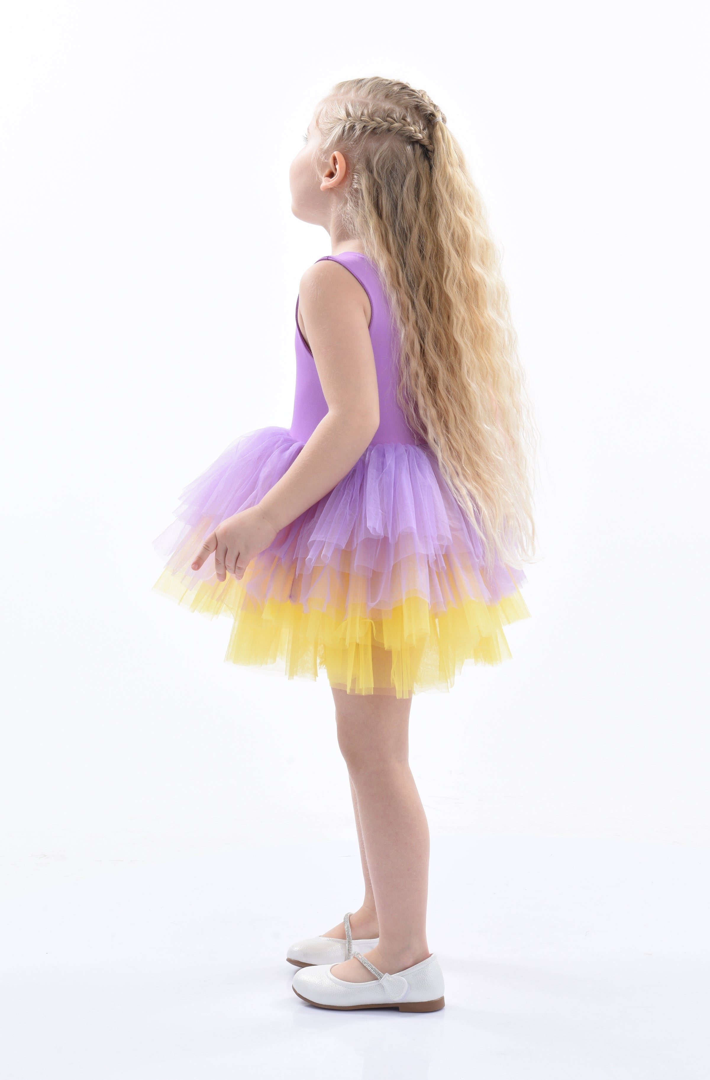 The Purple Monica Tutu Leotard Dress from Mimi Tutu is a delightful and elegant outfit for baby girls. This enchanting dress features thin sleeves and a square neck, providing a timeless and sophisticated look. The multiple layers of lightweight lush tulle create a voluminous and airy skirt, perfect for twirling and dancing. The yellow tulle underlay adds a vibrant pop of color, enhancing the overall charm of the dress.