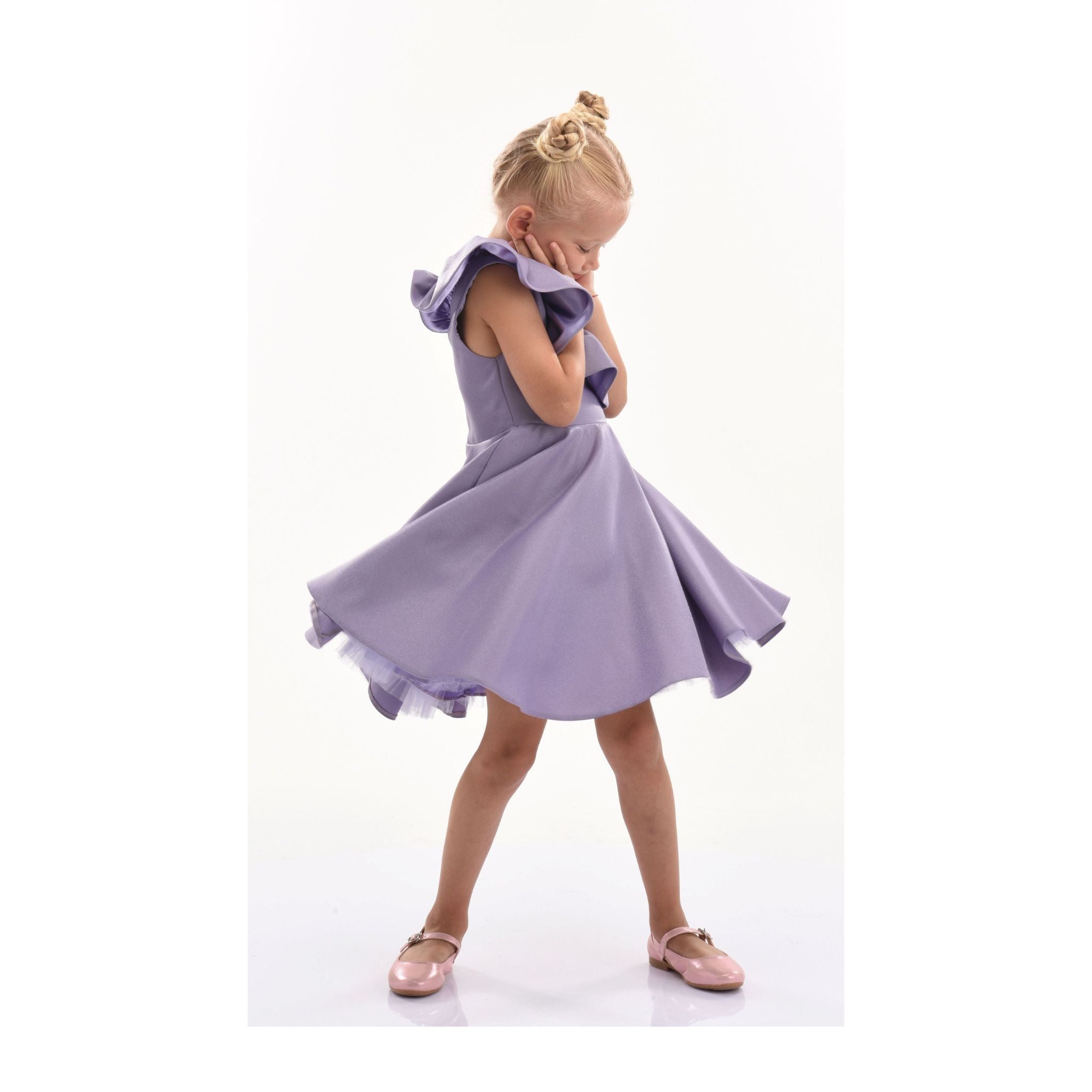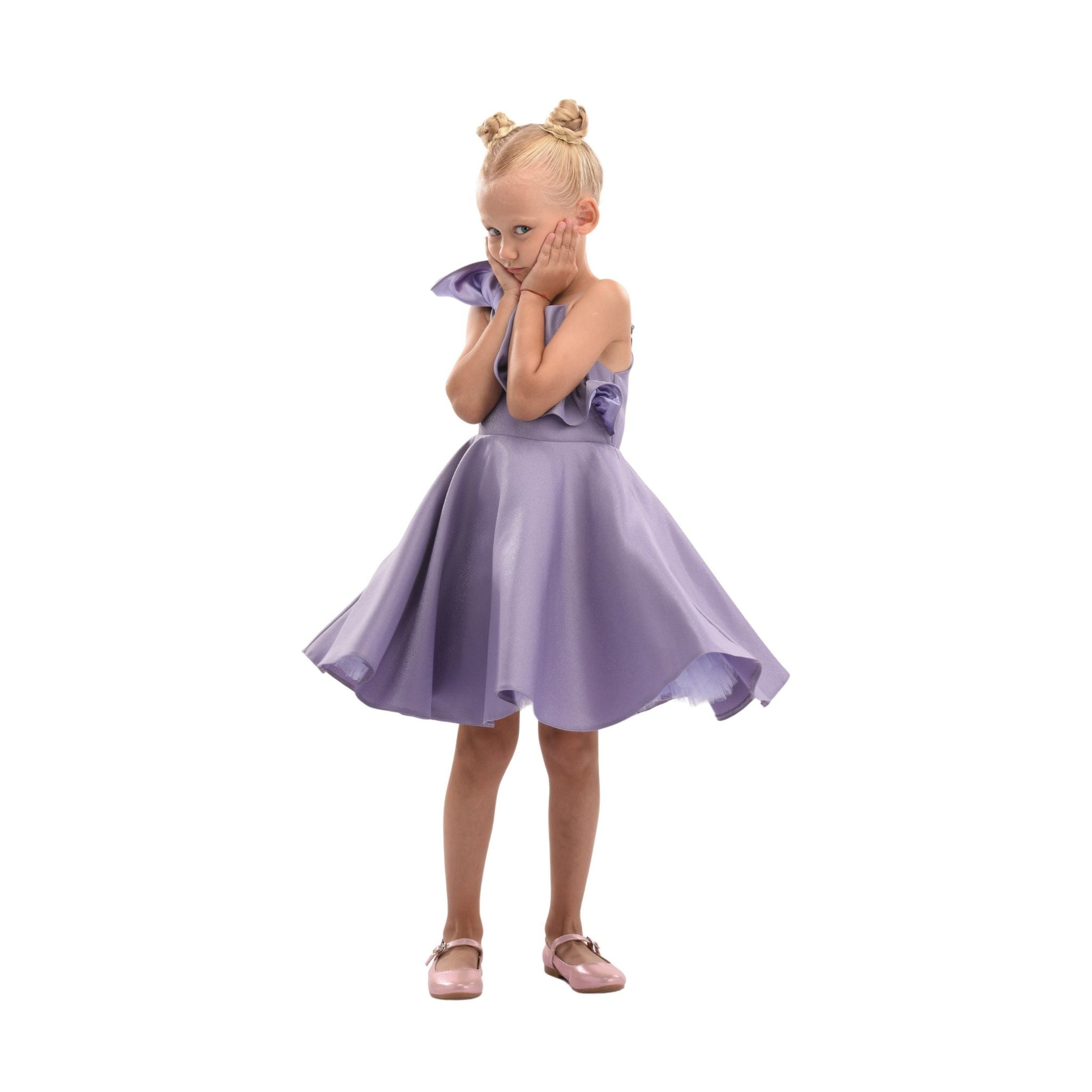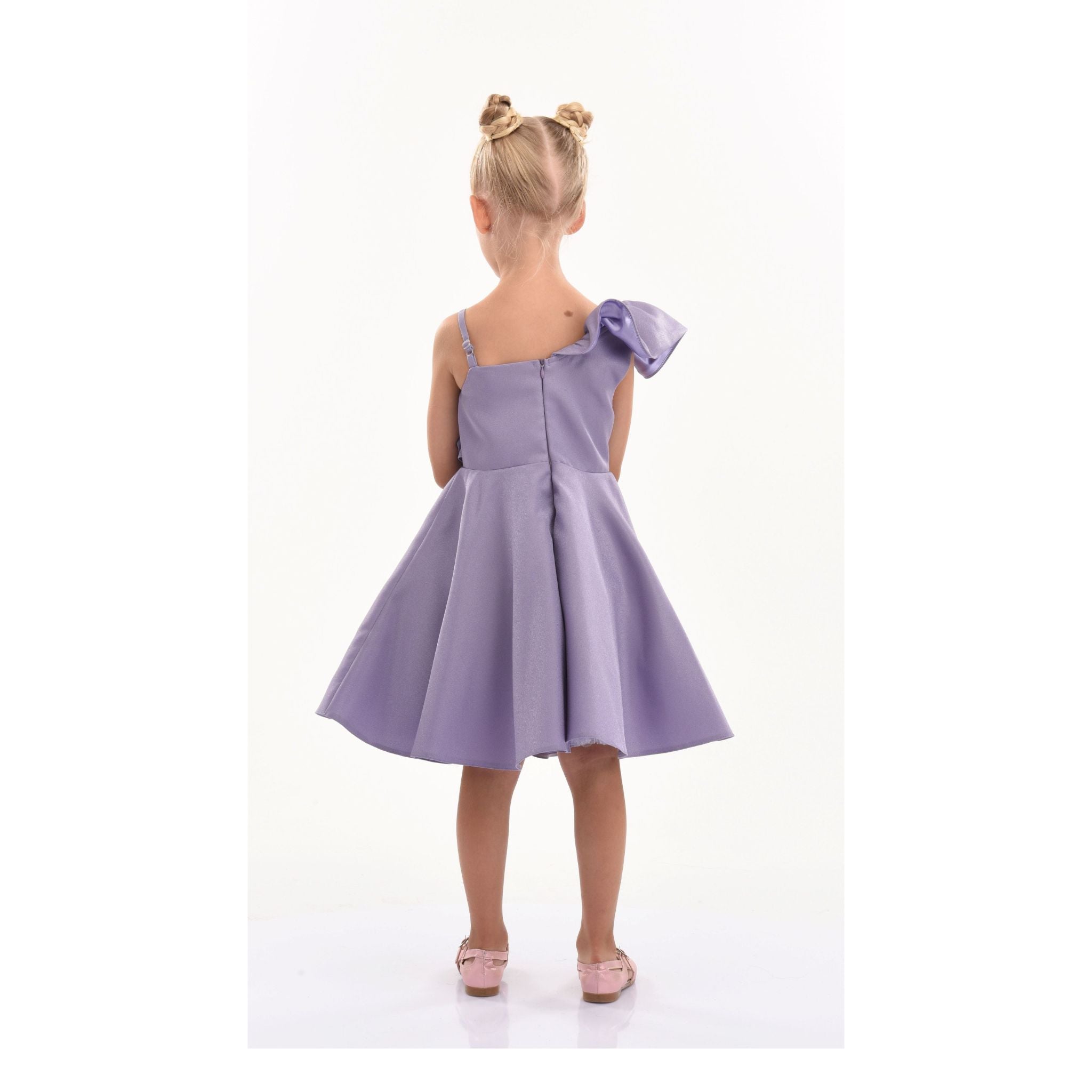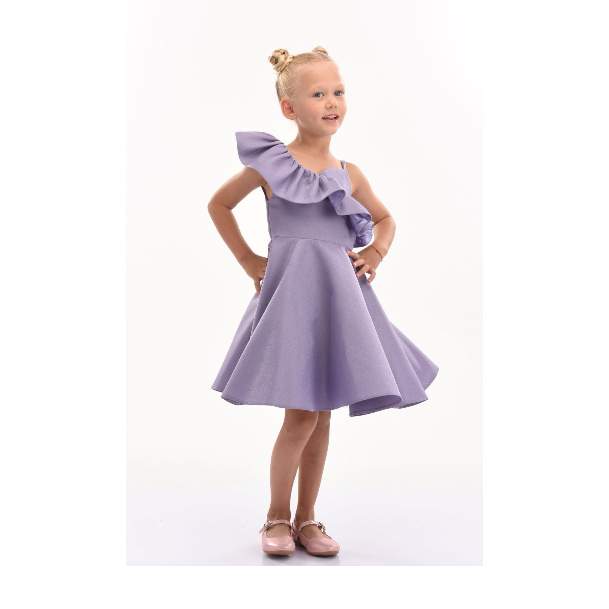 Overall, the Purple Riviera Off Shoulder Ruffle Dress combines elegance, comfort, and enchanting design elements, ensuring your child looks and feels special at any event.