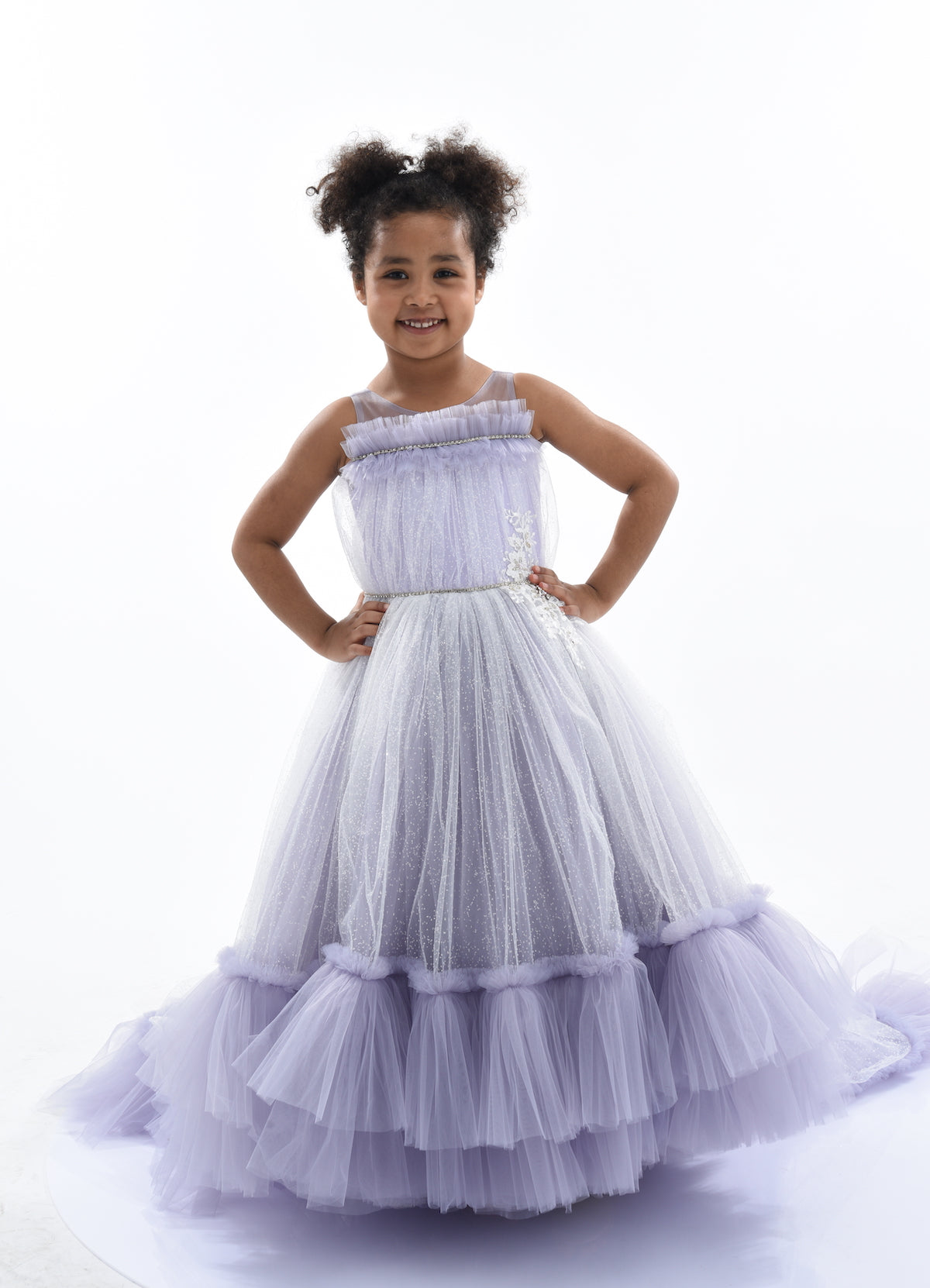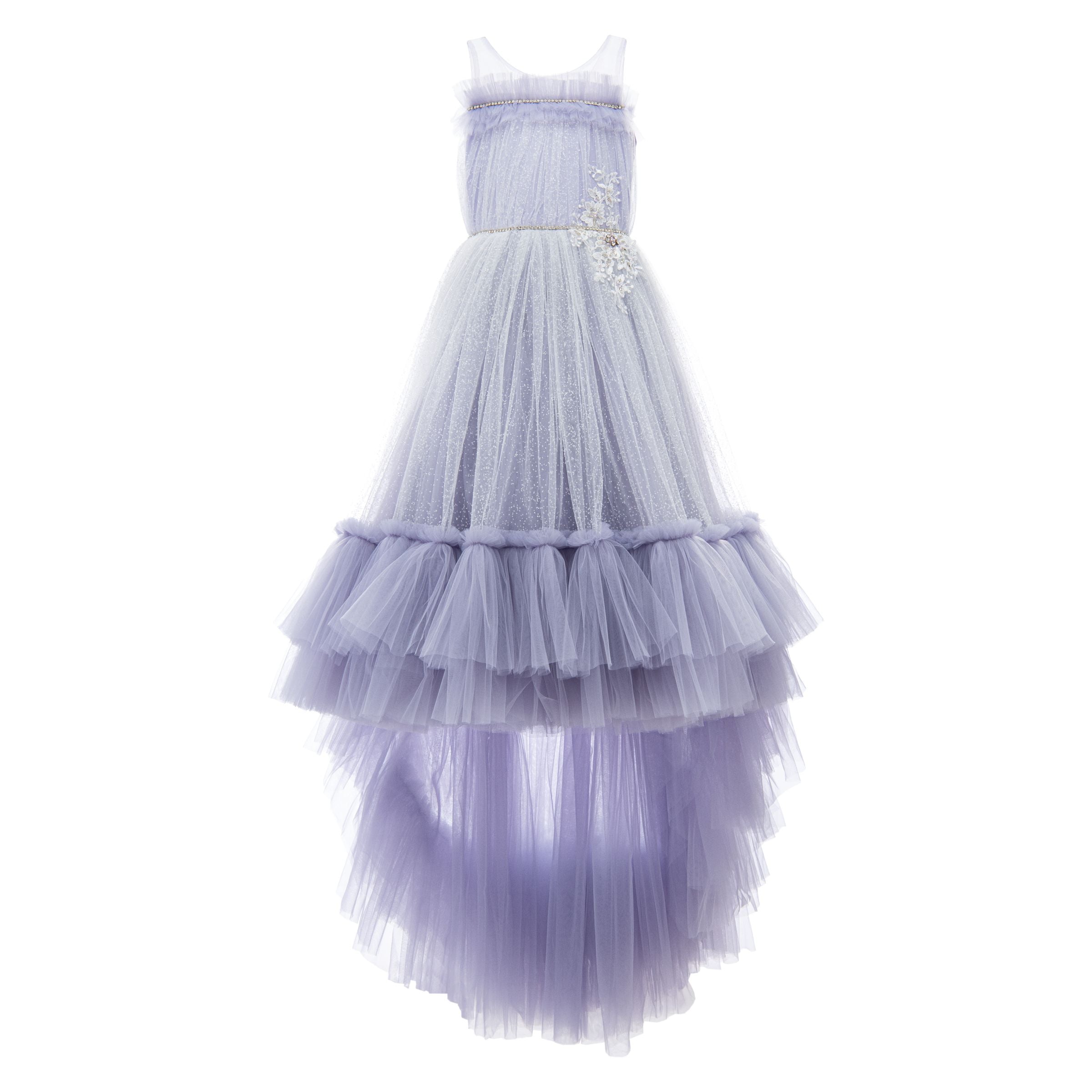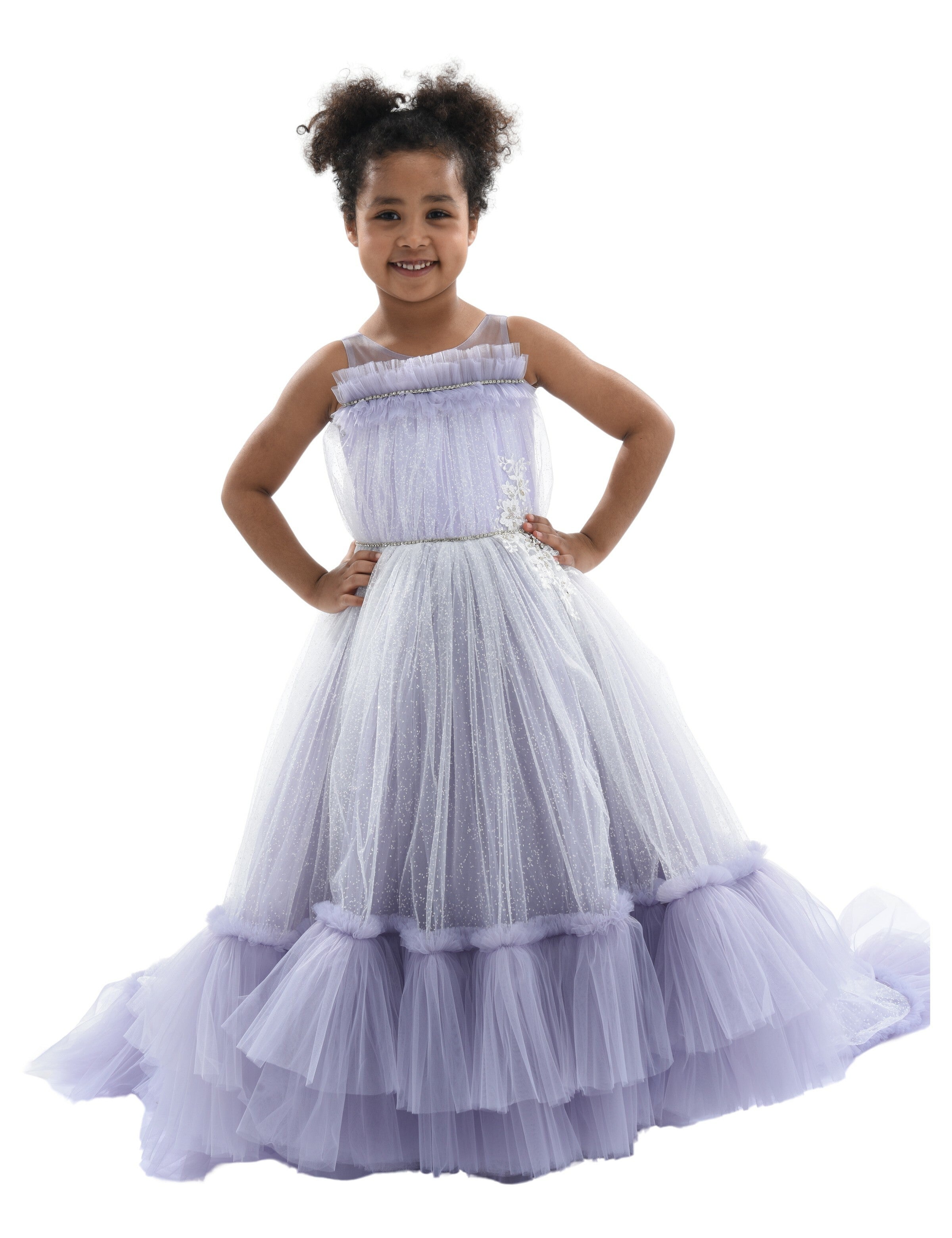 Designed to be true to size and calf-length, this gown maintains its quality and luxurious appearance over time. Overall, the Purple Thelma Tulle Gown combines elegance, comfort, and whimsical design elements, making it a perfect addition to any young girl's wardrobe. This standout piece ensures your child looks and feels special at any event.