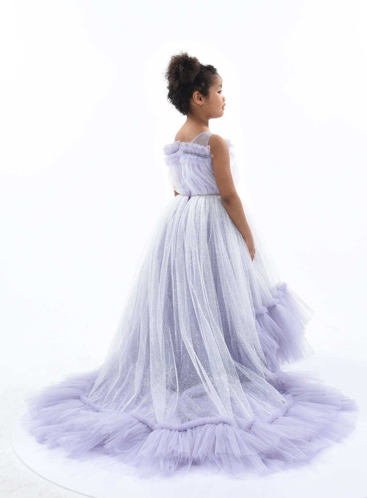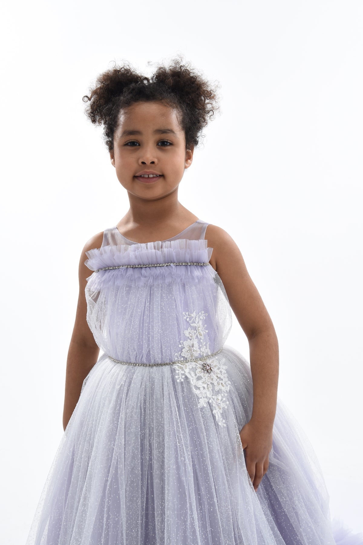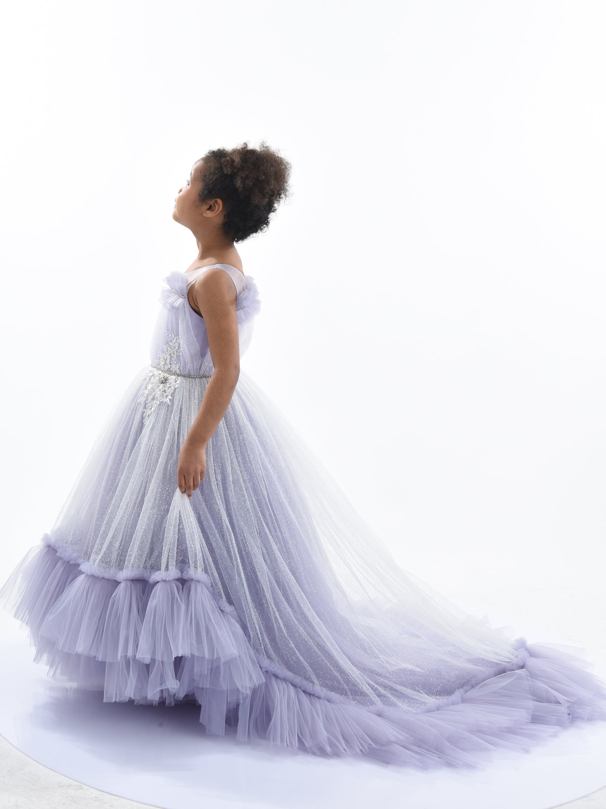 Designed to be true to size and calf-length, this gown maintains its quality and luxurious appearance over time. Overall, the Purple Thelma Tulle Gown combines elegance, comfort, and whimsical design elements, making it a perfect addition to any young girl's wardrobe. This standout piece ensures your child looks and feels special at any event.