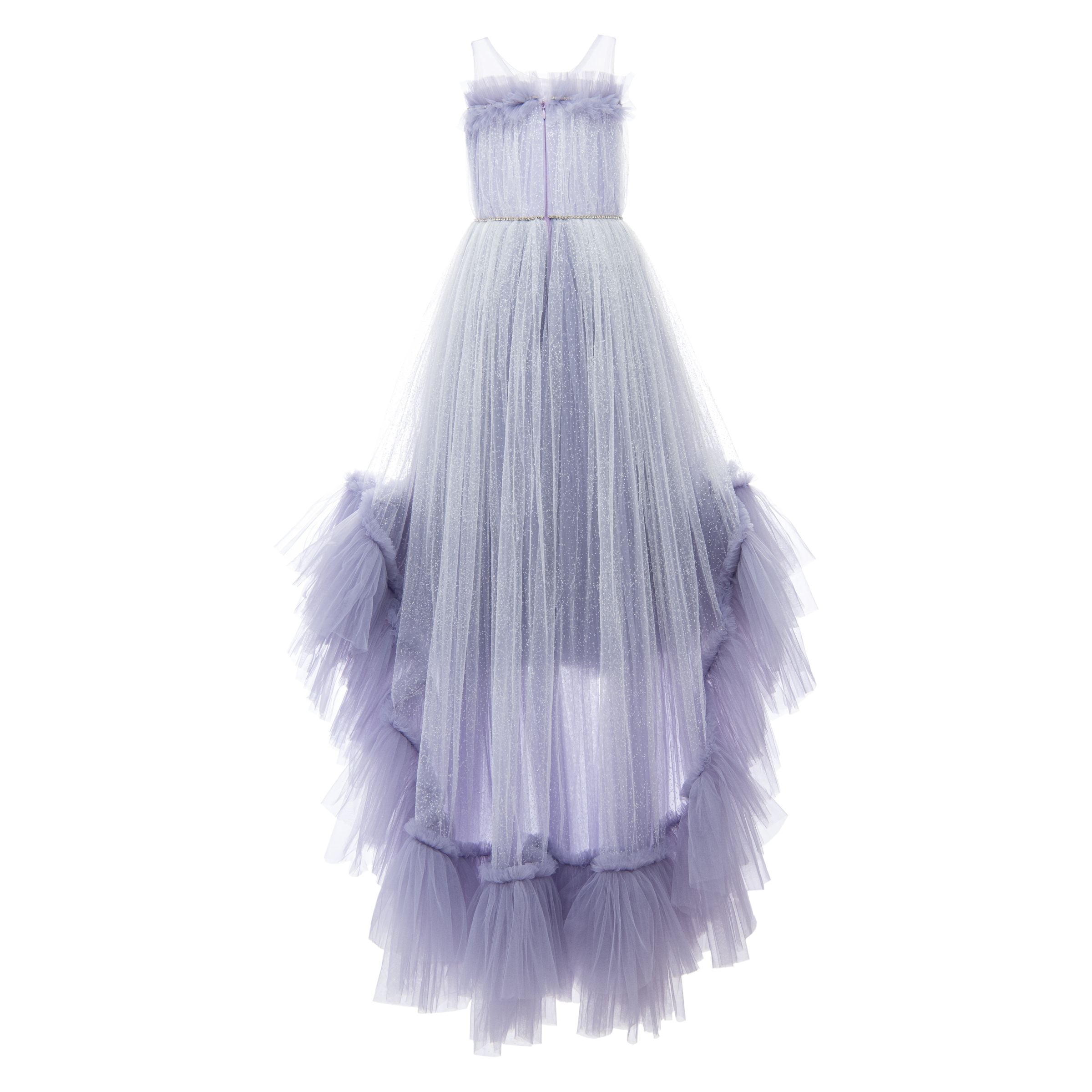 The purple tulle skirt is designed to be lightweight and flowy, with layers that are short in the front and long in the back, creating a graceful and eye-catching silhouette. Made from 100% polyester, this gown ensures both durability and comfort. The zip closure at the back allows for easy dressing and a secure fit.