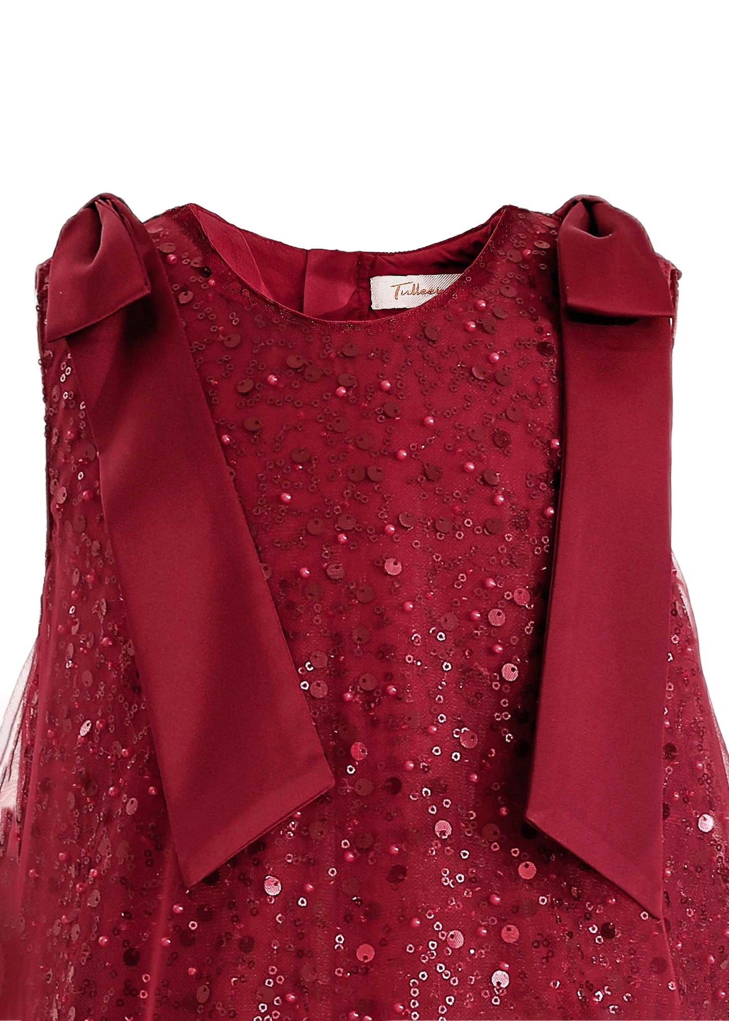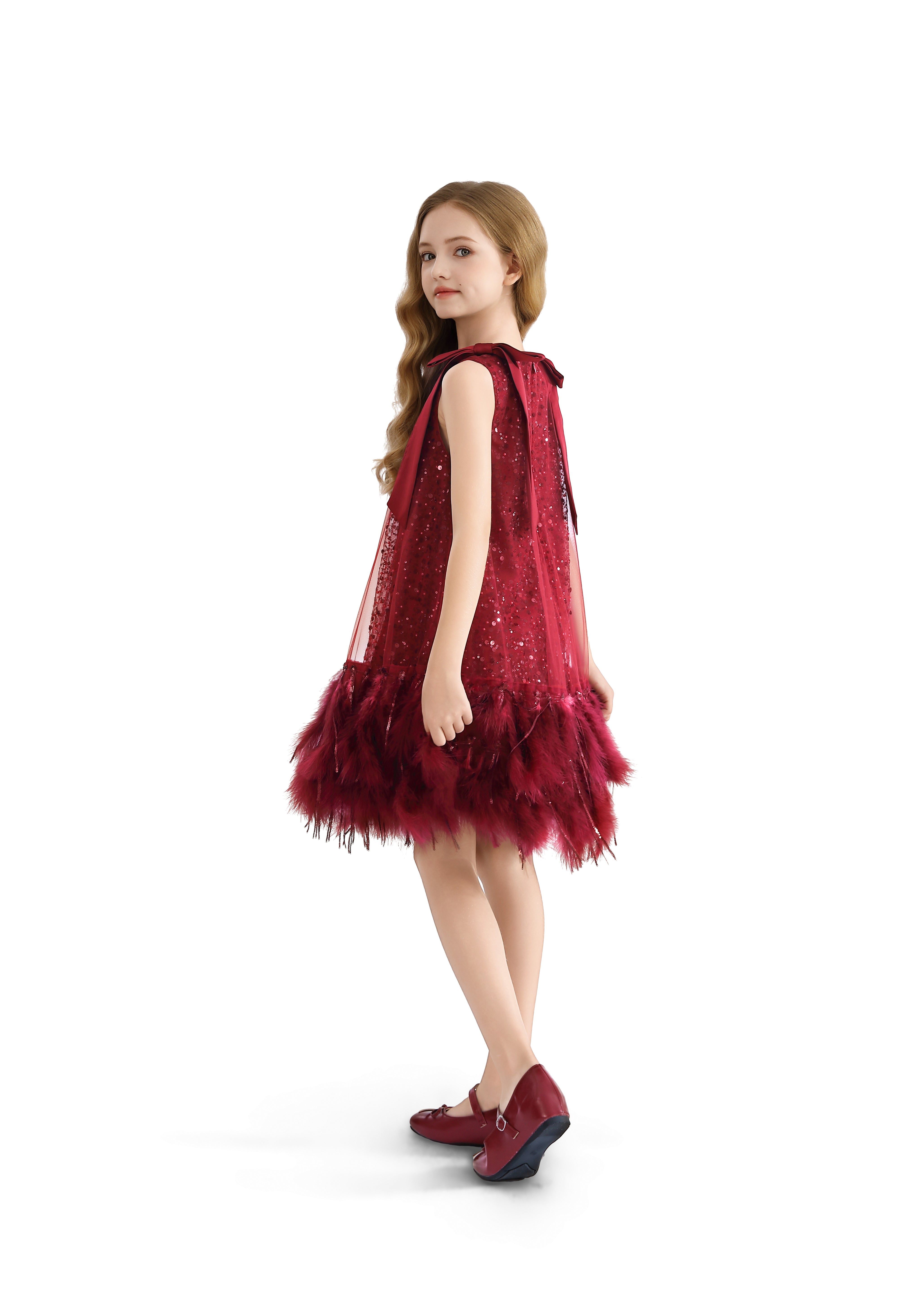 A dazzling choice for festive occasions, this sleeveless red dress sparkles with sequins and finishes in a whimsical feathered hem. Satin shoulder ties add a soft, elegant touch to the shimmering silhouette.