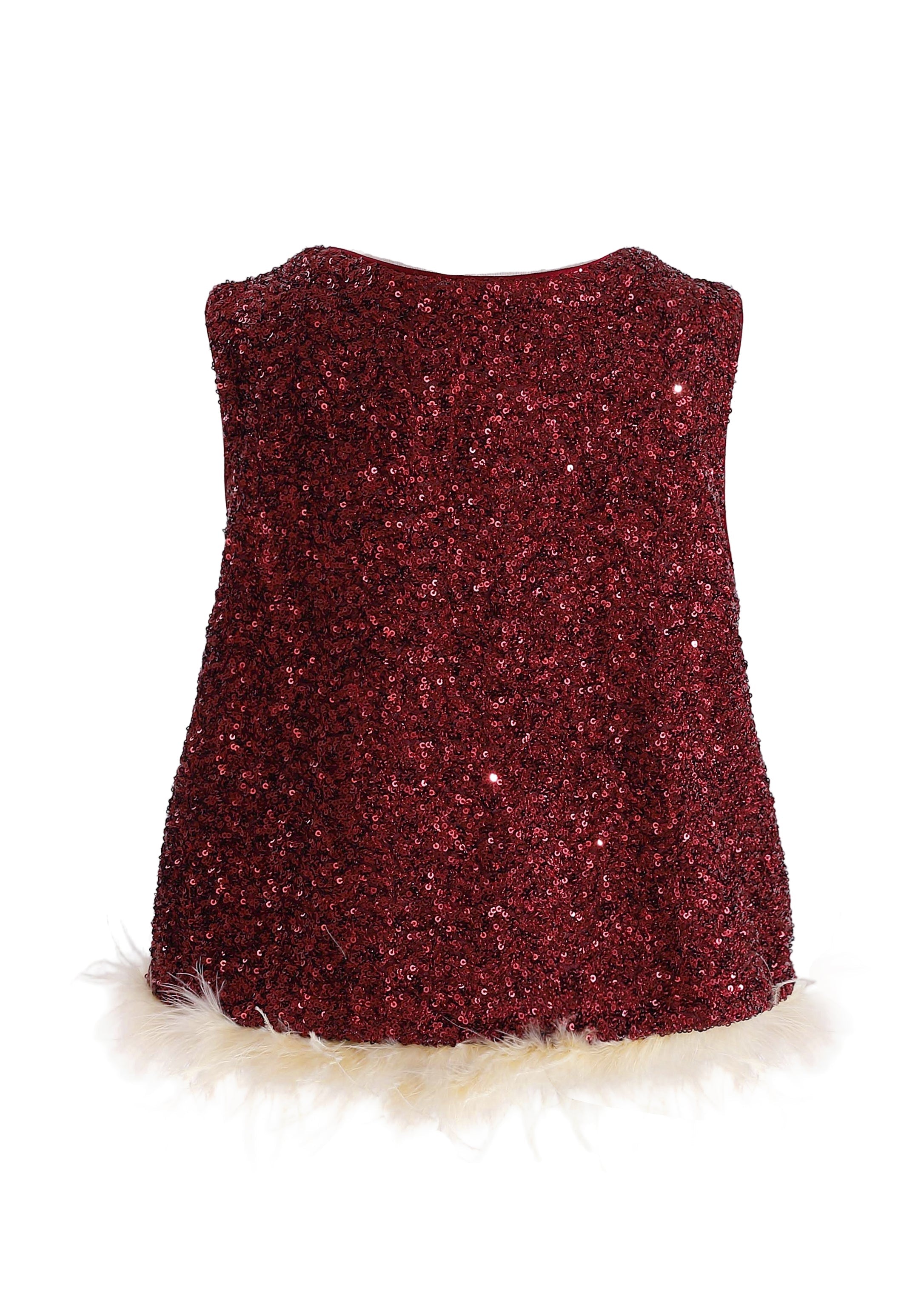 - Sleeveless sequin top and matching skirt with tonal feather trim at waist and hem